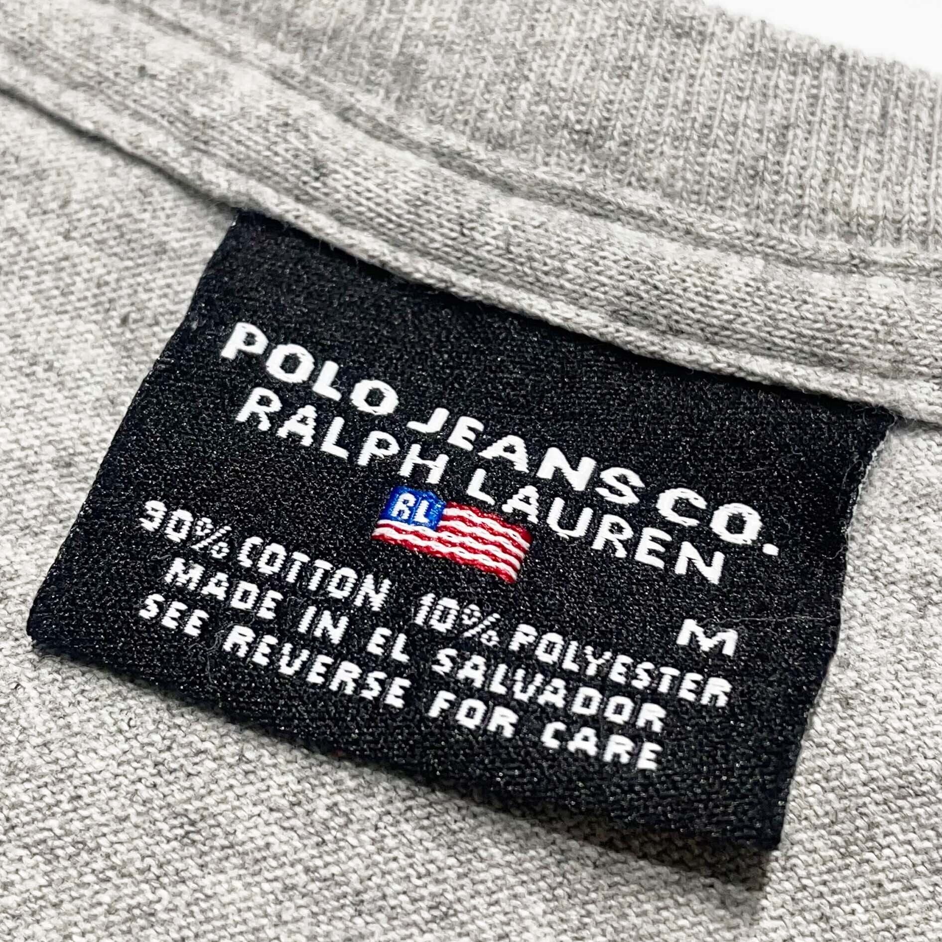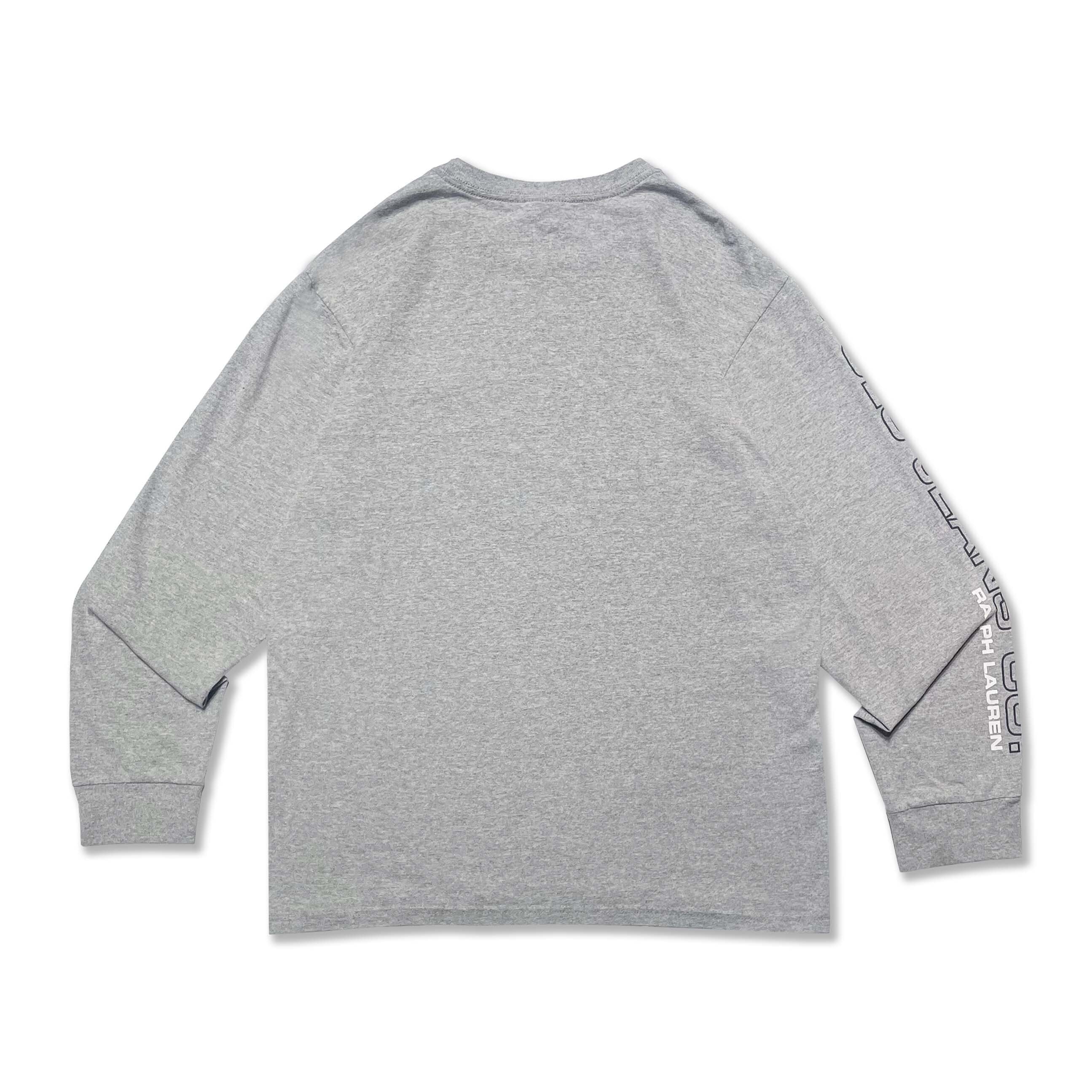 POLO JEANS COMPANY のグレーのロングスリーブTシャツ。胸元にはワンポイントのロゴ刺繍、袖には存在感のあるプリントが施された一枚です。