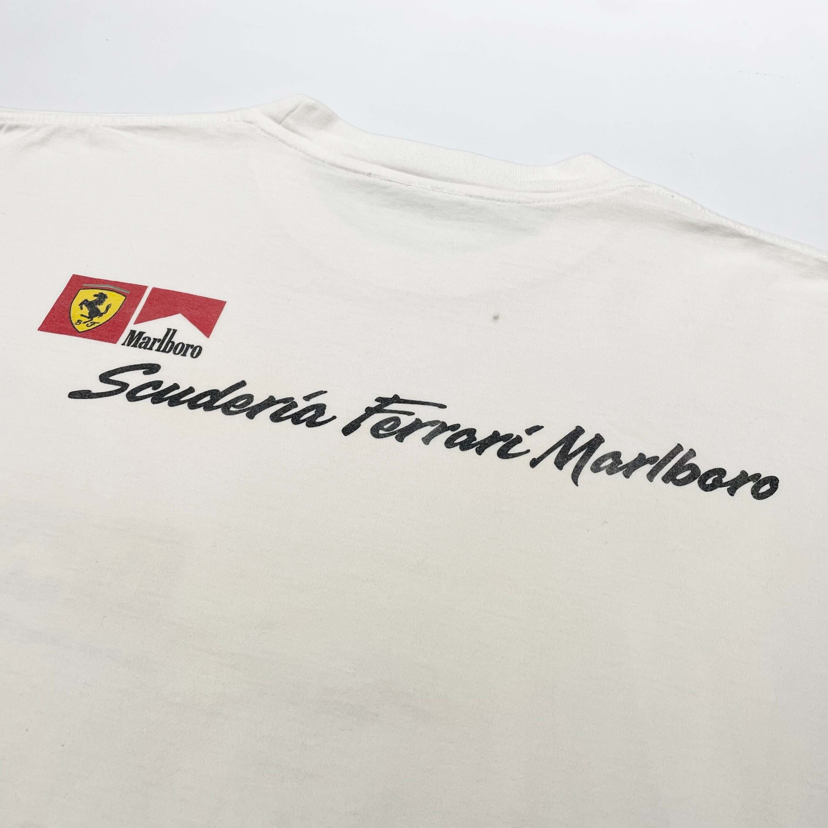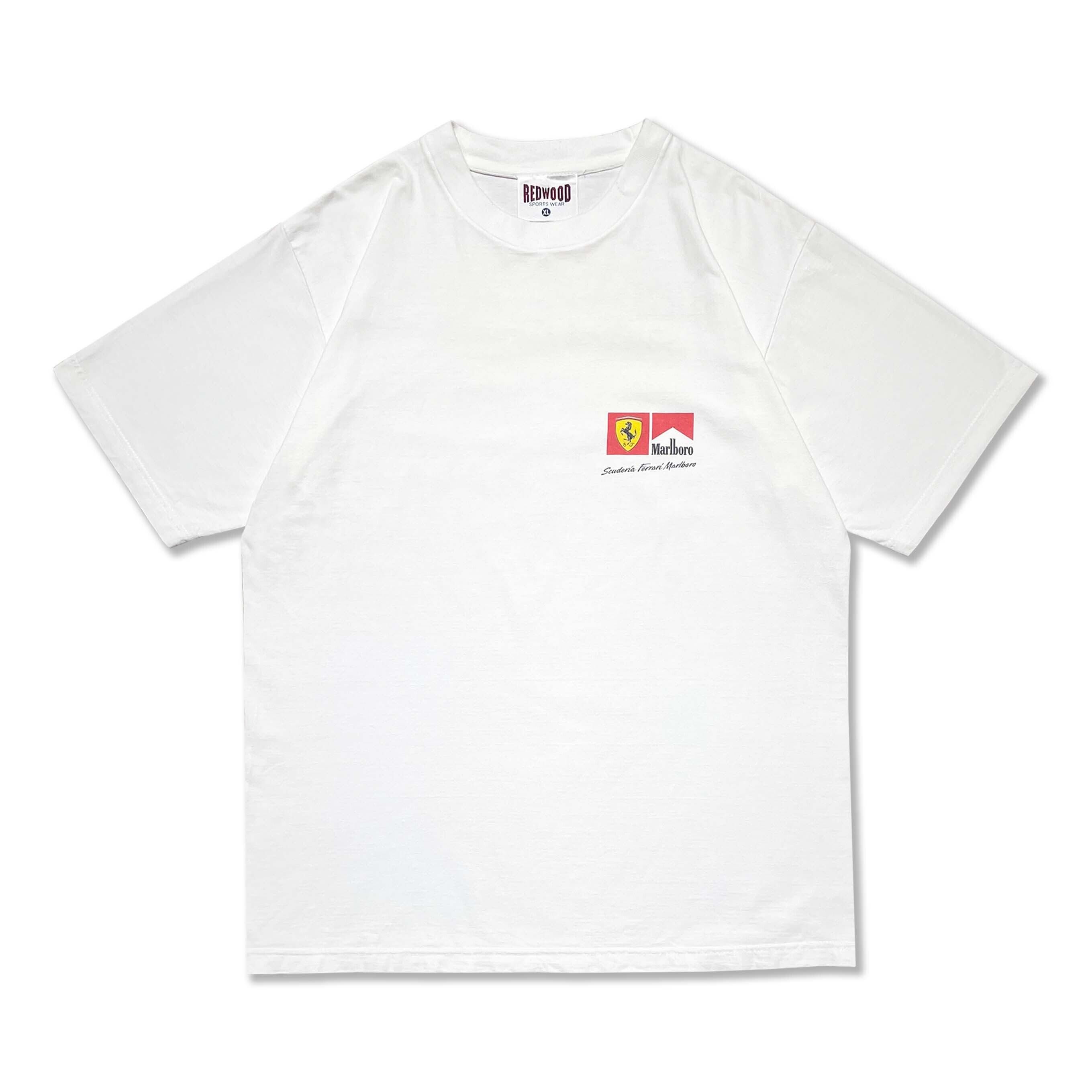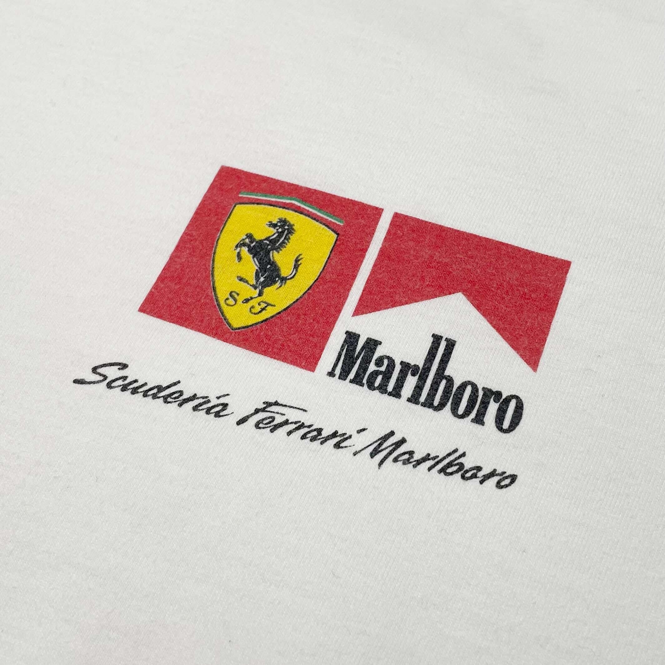 フェラーリとマルボロのロゴがプリントされた、希少なコラボTシャツ。両ブランドの存在感あるグラフィックはもちろん、素材感やシルエットも抜群で、着心地と見た目のバランスが優れた一枚です。