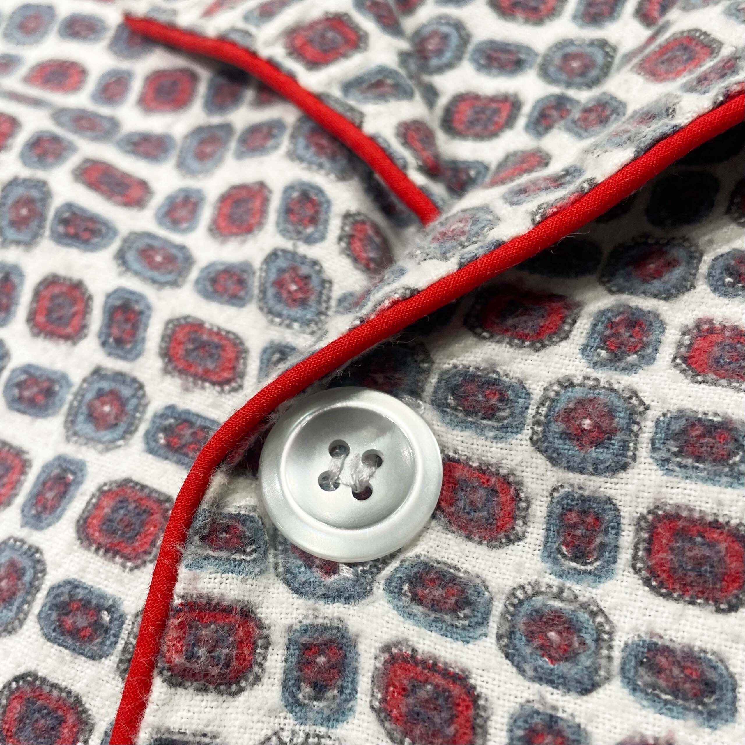 アメリカンカルチャーを感じさせる小紋柄のパジャマシャツ。薄手のネル素材ならではの柔らかな着心地で、リラックス感がありつつもスタイリングに個性をプラスしてくれる一枚です。