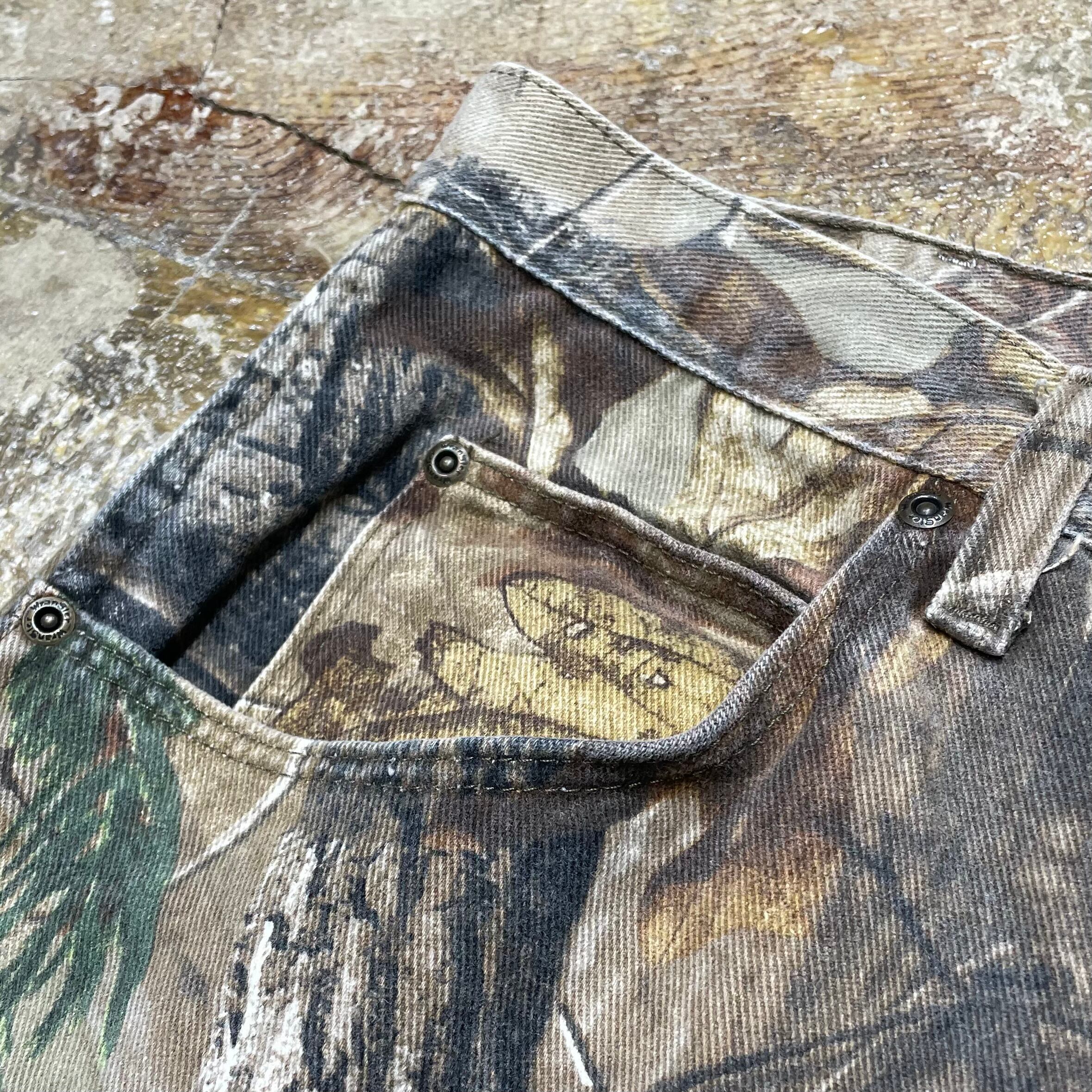ラングラーのダブルニー5ポケットパンツ。AP社のリアルツリーカモをプリントしたツイル素材を使用し、タフな雰囲気と自然なカモ柄の存在感が魅力です。