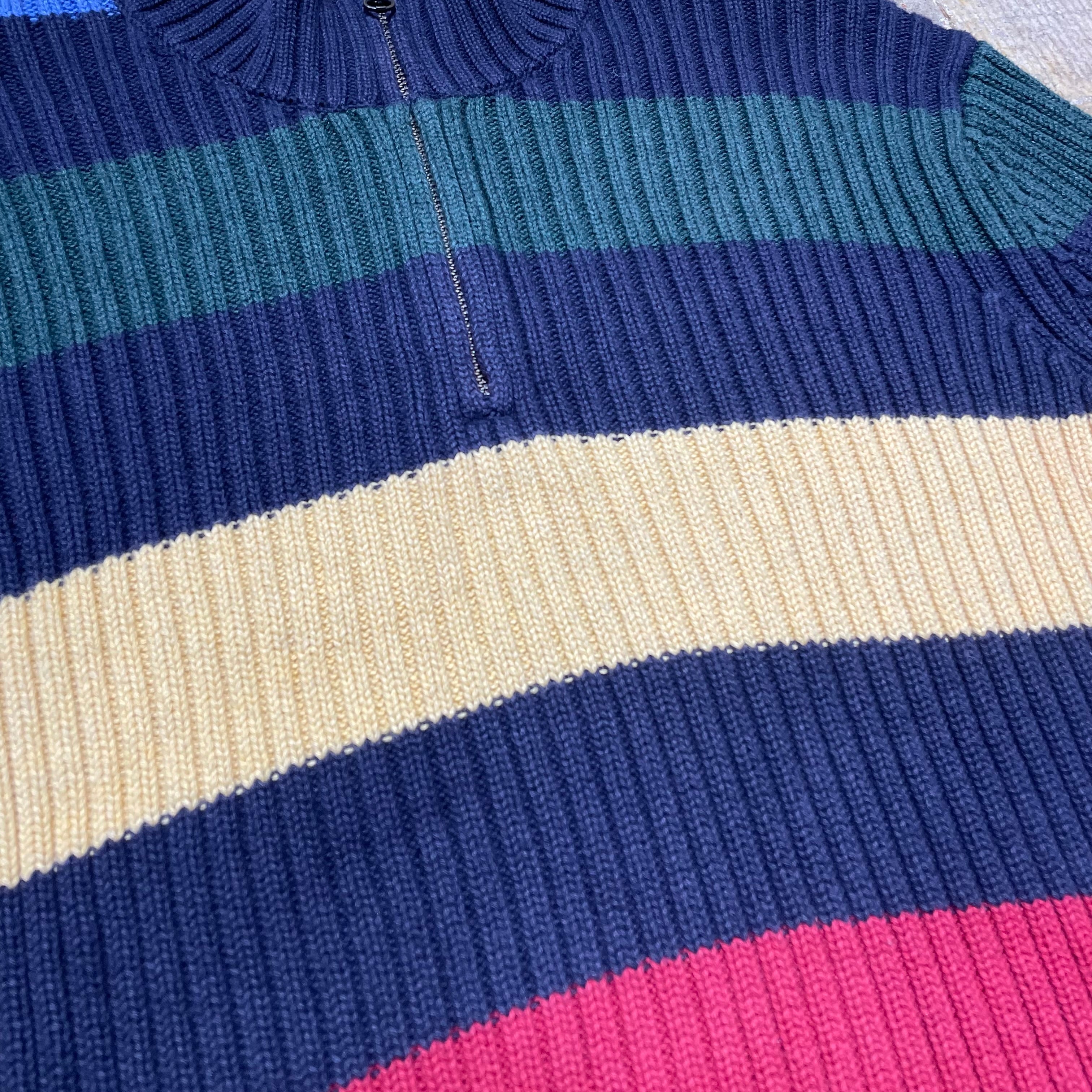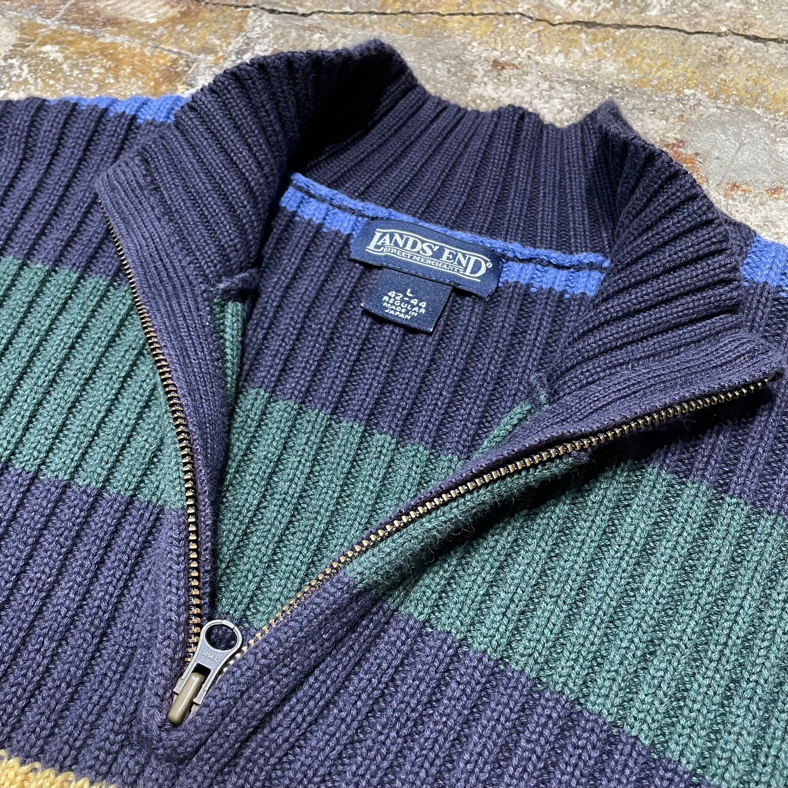 A Lands’ End half-zip knit featuring a nostalgic multi-stripe pattern reminiscent of the 80s–90s.Crafted from 100% soft cotton for excellent comfort and feel.The balanced silhouette makes it versatile as both an inner layer and outerwear piece.Made in Japan, this piece showcases quality craftsmanship alongside its retro charm.