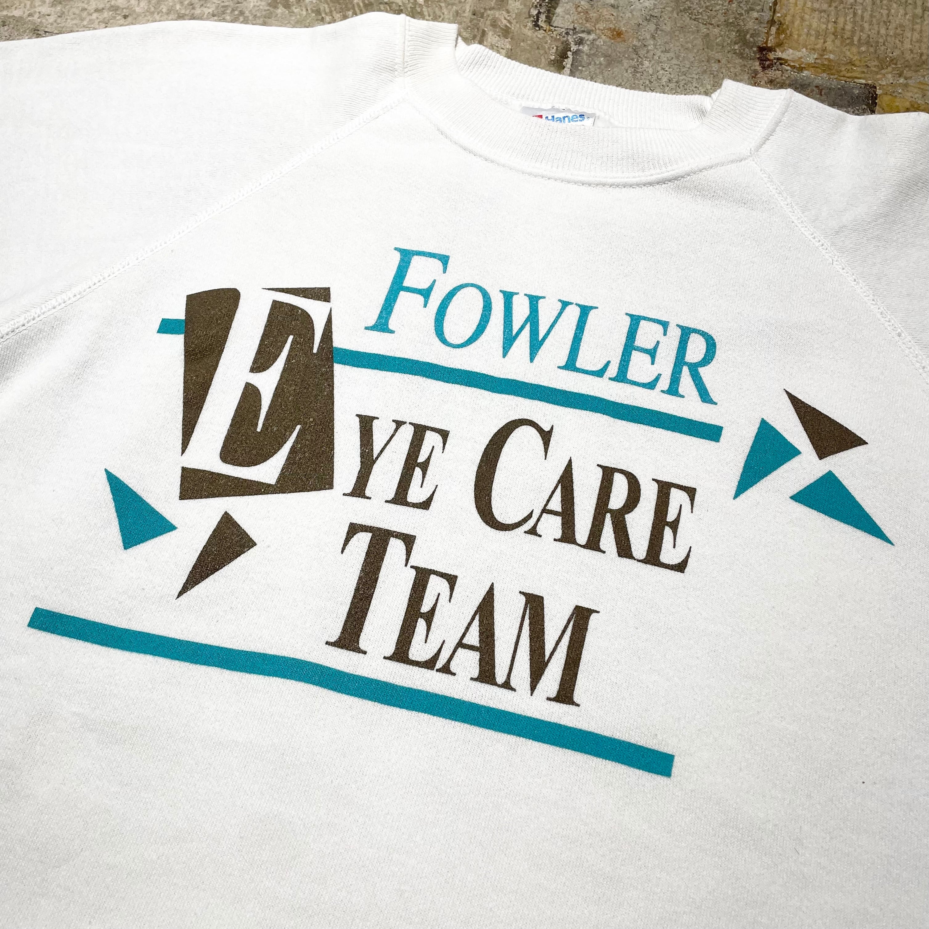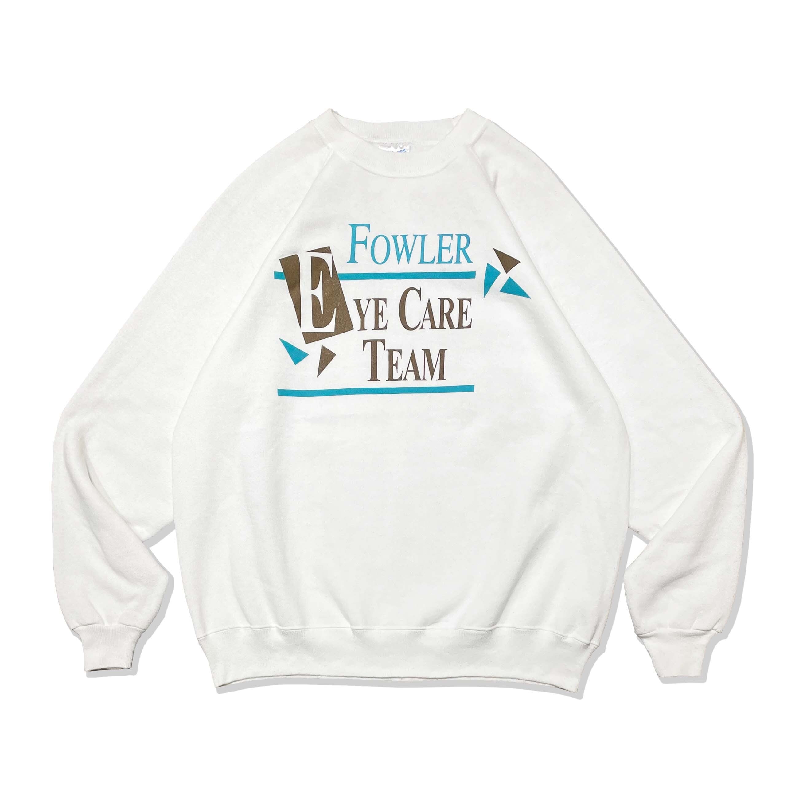 1990s Hanes raglan sweatshirt, proudly made in the USA, featuring a classic vintage silhouette with moderate heavyweight fabric. The white body is accented by a clean and refreshing blue print. On the chest, the “Fowler Eye Care Team” print adds a unique cultural touch, referencing an actual eye care clinic from Texas and evoking a nostalgic, collegiate vibe. Its raglan construction enhances comfort and mobility, while the simple color palette makes it versatile for styling. A rare, high-quality piece for collectors or anyone looking to add a story-driven vintage item to their wardrobe.