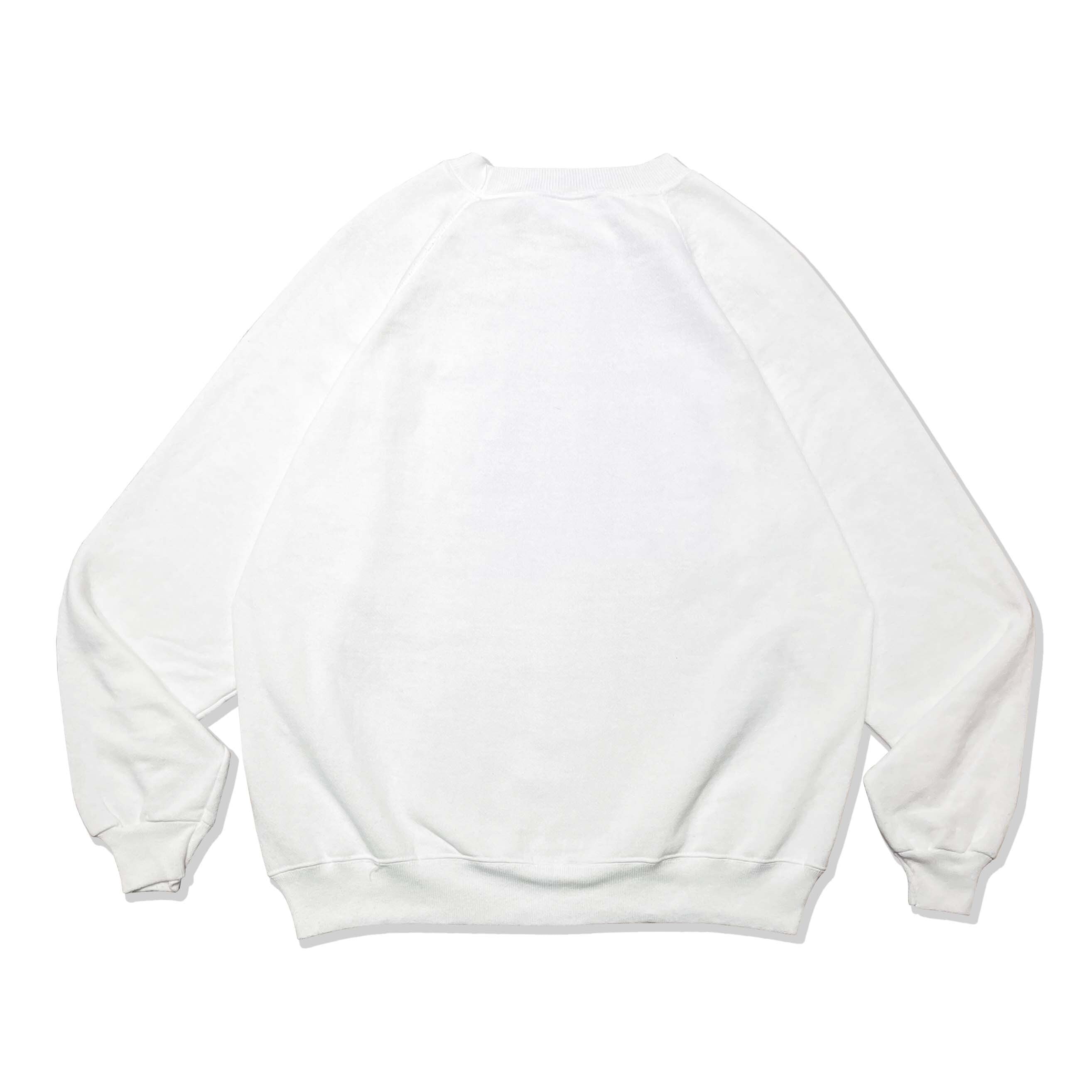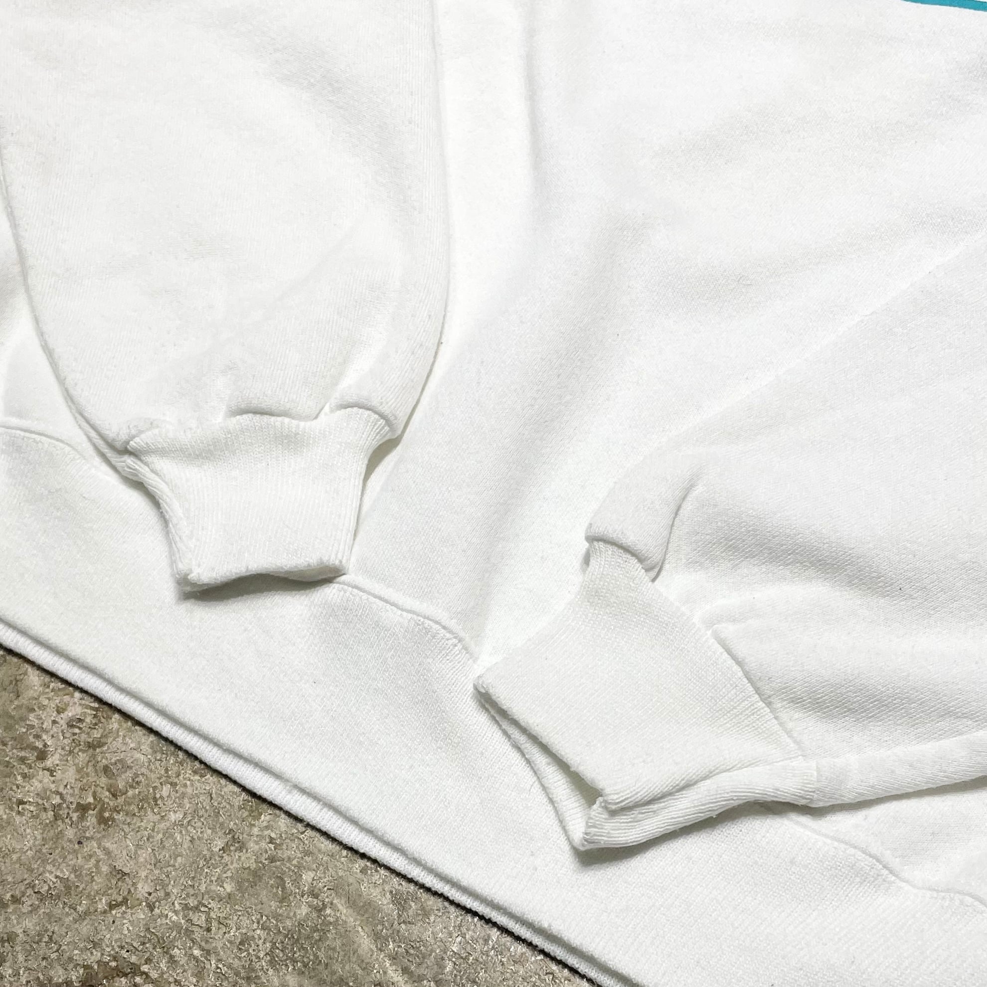 1990年代製ヘインズのラグランスウェット、アメリカ製。程よい厚みのボディが古着ならではの風合いを生み出します。白ボディに爽やかなブループリントでクリーンな印象。胸には「Fowler Eye Care Team」のプリントが入り、90年代当時のテキサスの眼科クリニックを想起させるカルチャー感のあるデザインです。ラグラン仕様で動きやすく、シンプルな配色でスタイリングも自在。高品質で希少な一点、ヴィンテージファンやストーリー性のあるアイテムを求める方におすすめです。