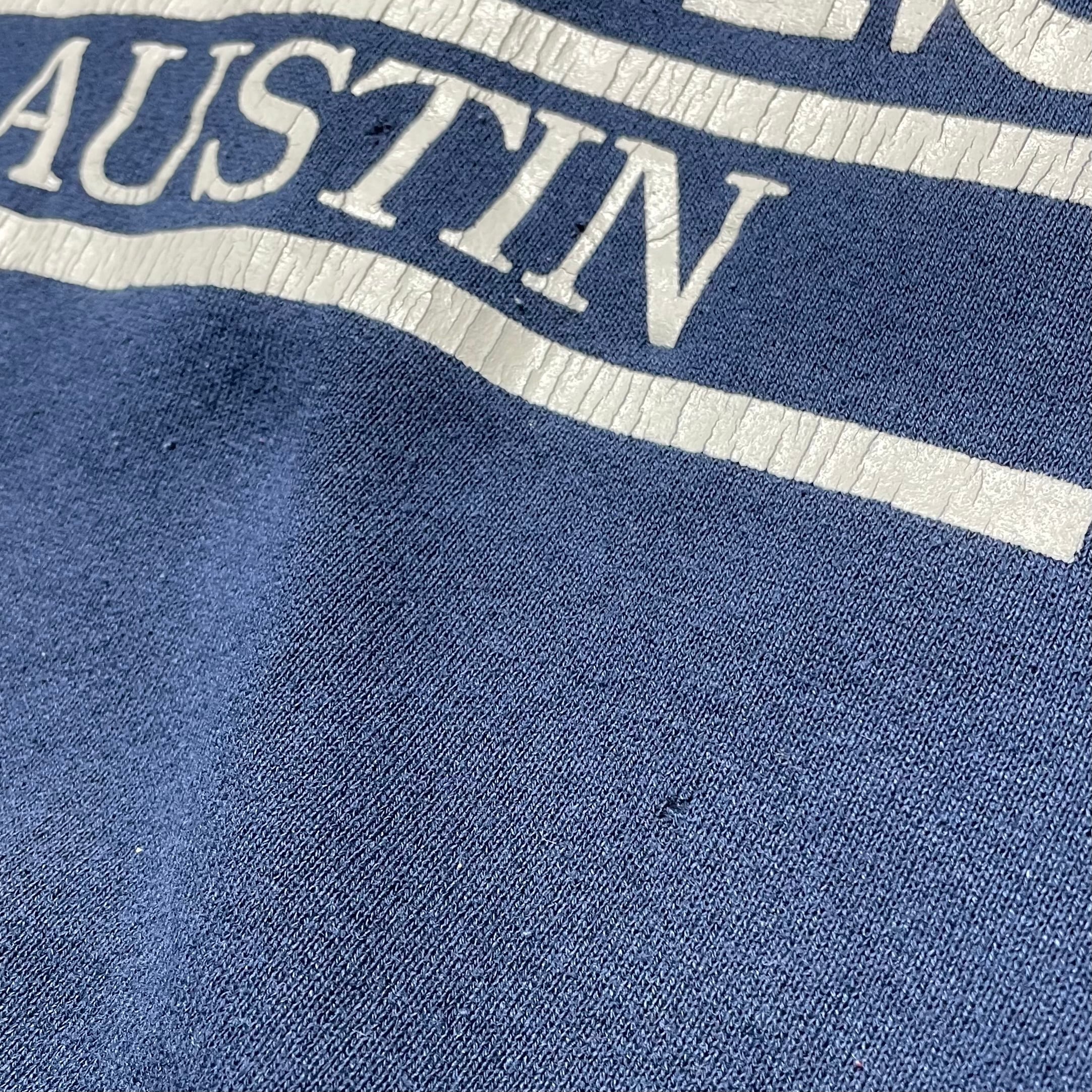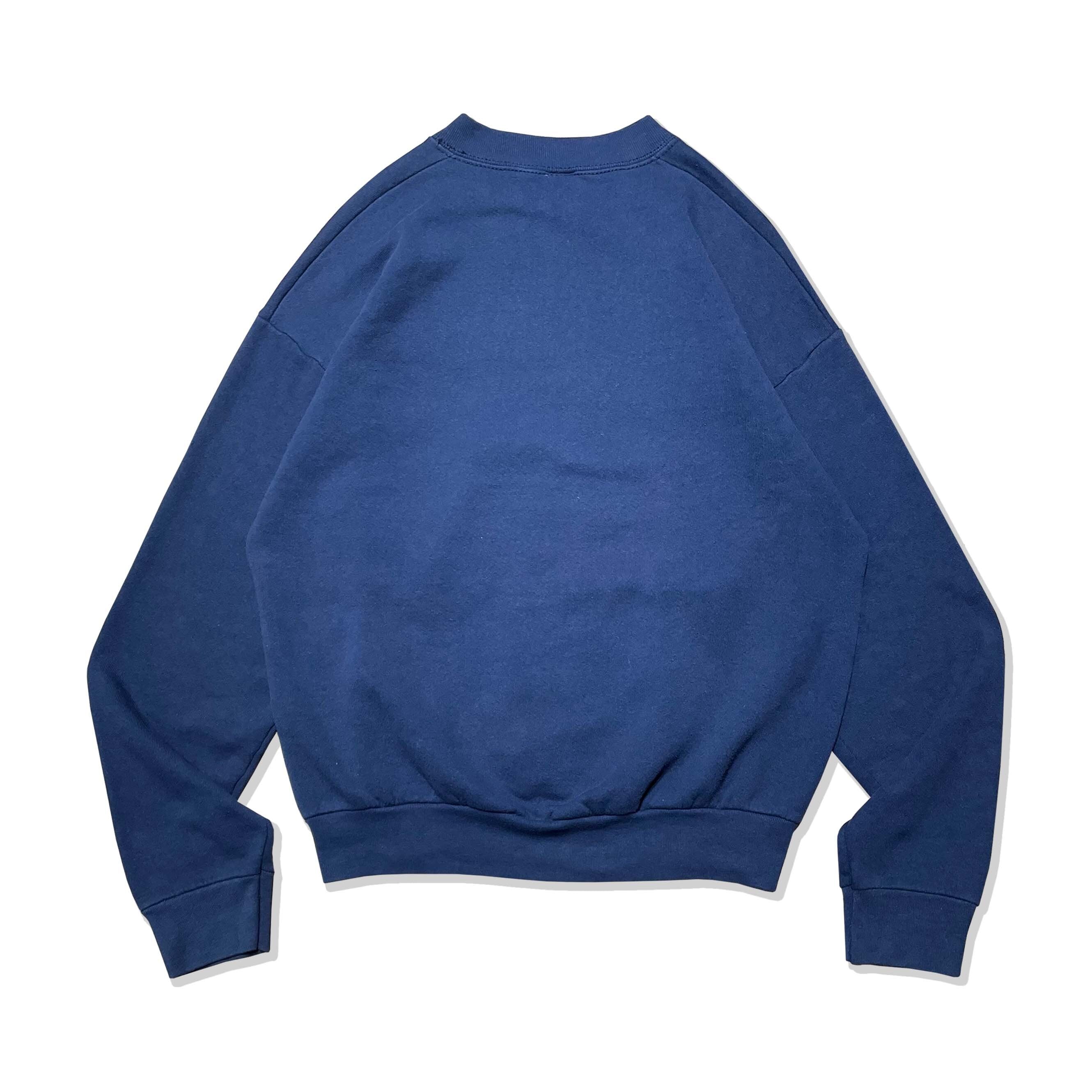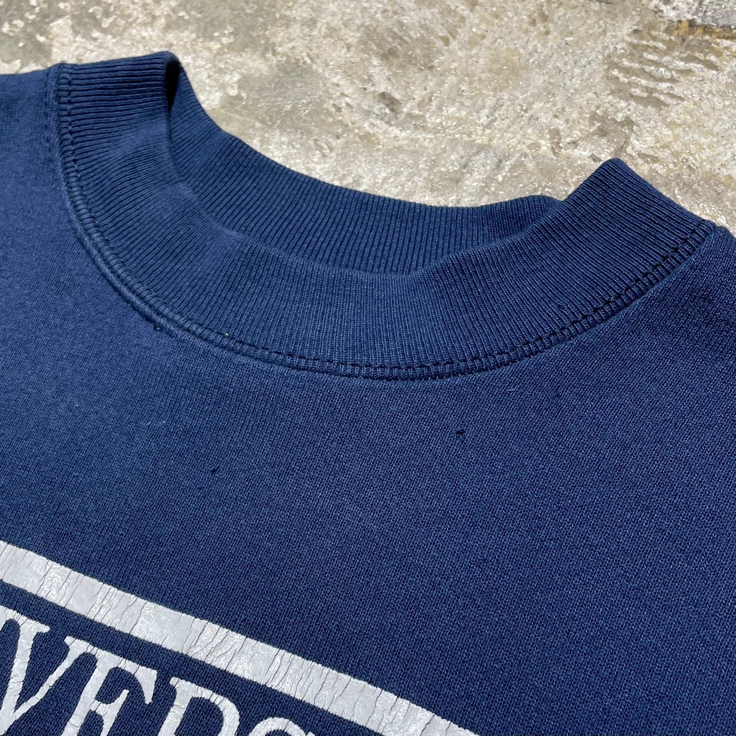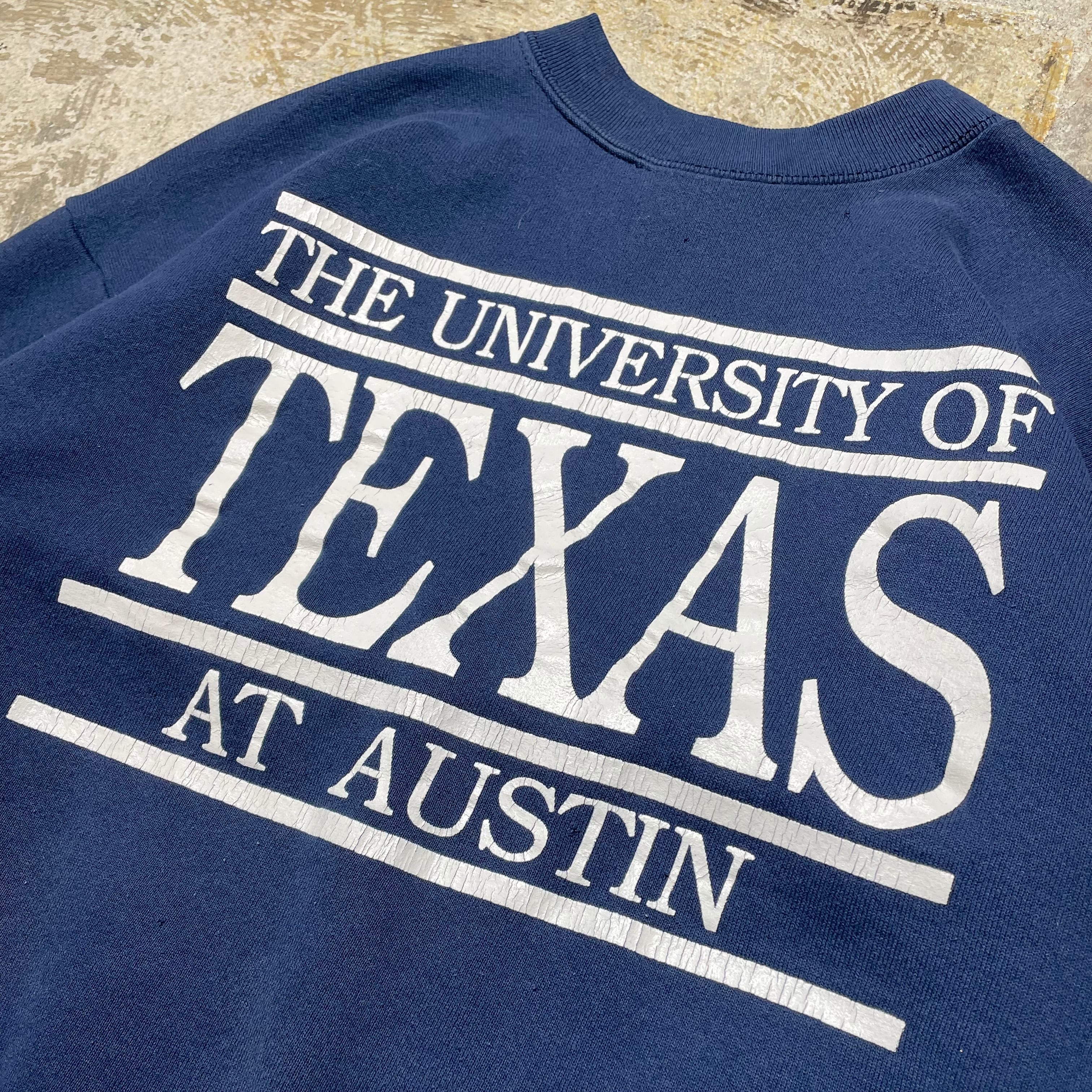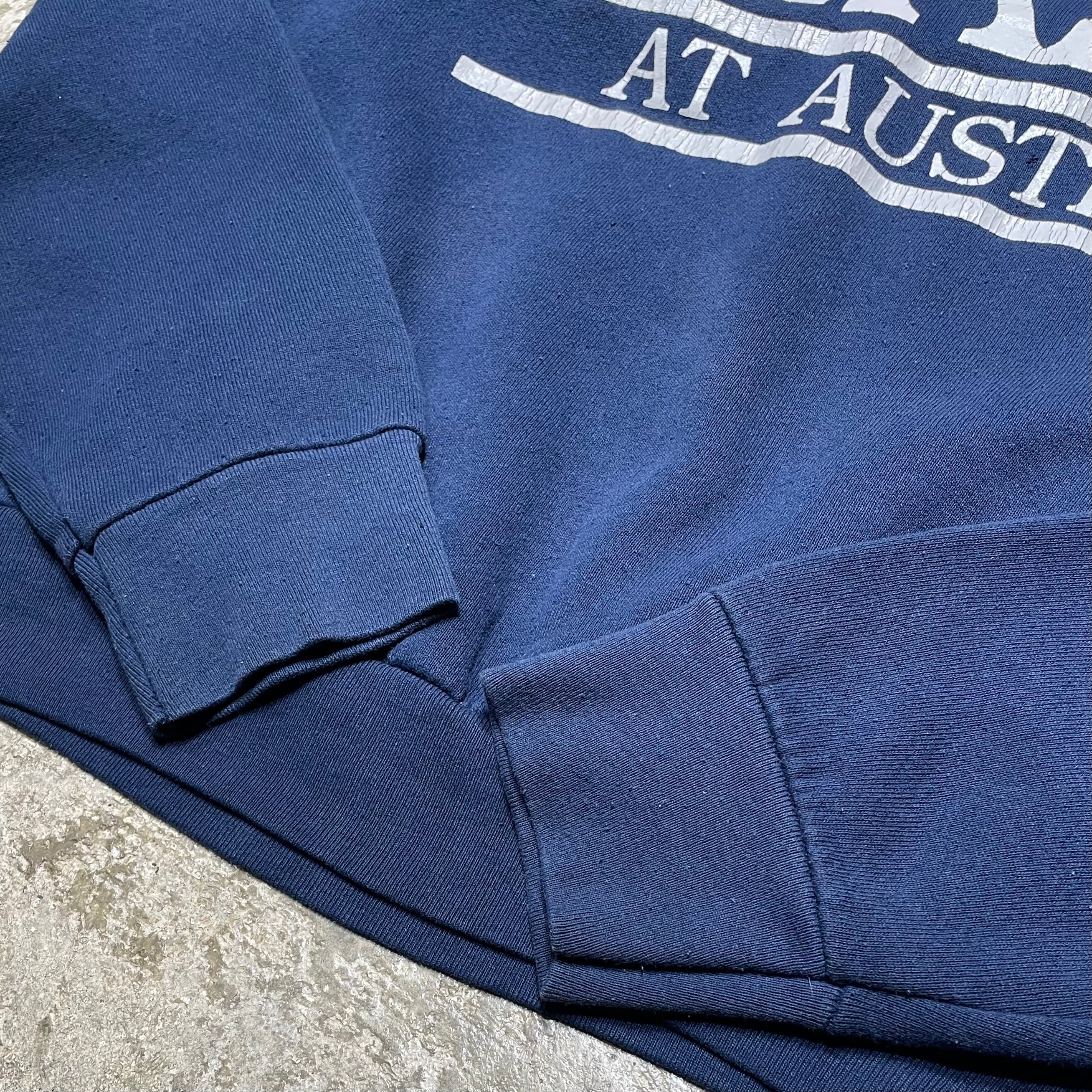 1990年代のFRUIT OF THE LOOMボディを使用した、「THE UNIVERSITY OF TEXAS 」のプリントスウェットです。フロントに大きく配置されたテキサスロゴの大胆なプリントが印象的で、90年代のアメリカンカルチャーを色濃く感じる1枚です。ややゆったりとしたバランスの良いシルエットと、厚すぎない生地感で、アウターにもインナーにも取り入れやすい万能アイテム。フェードしたネイビーボディが、古着ならではのこなれた雰囲気を演出しています。