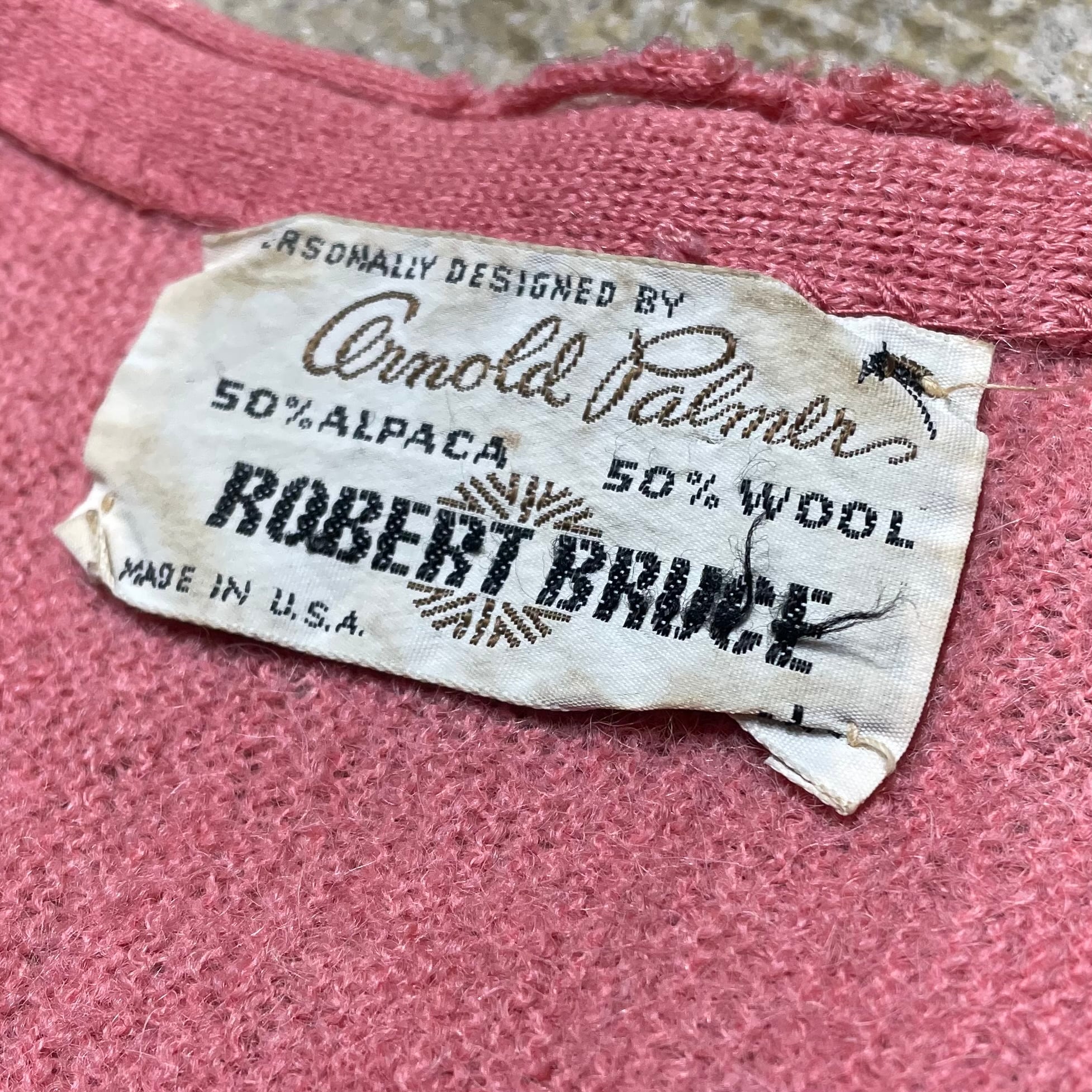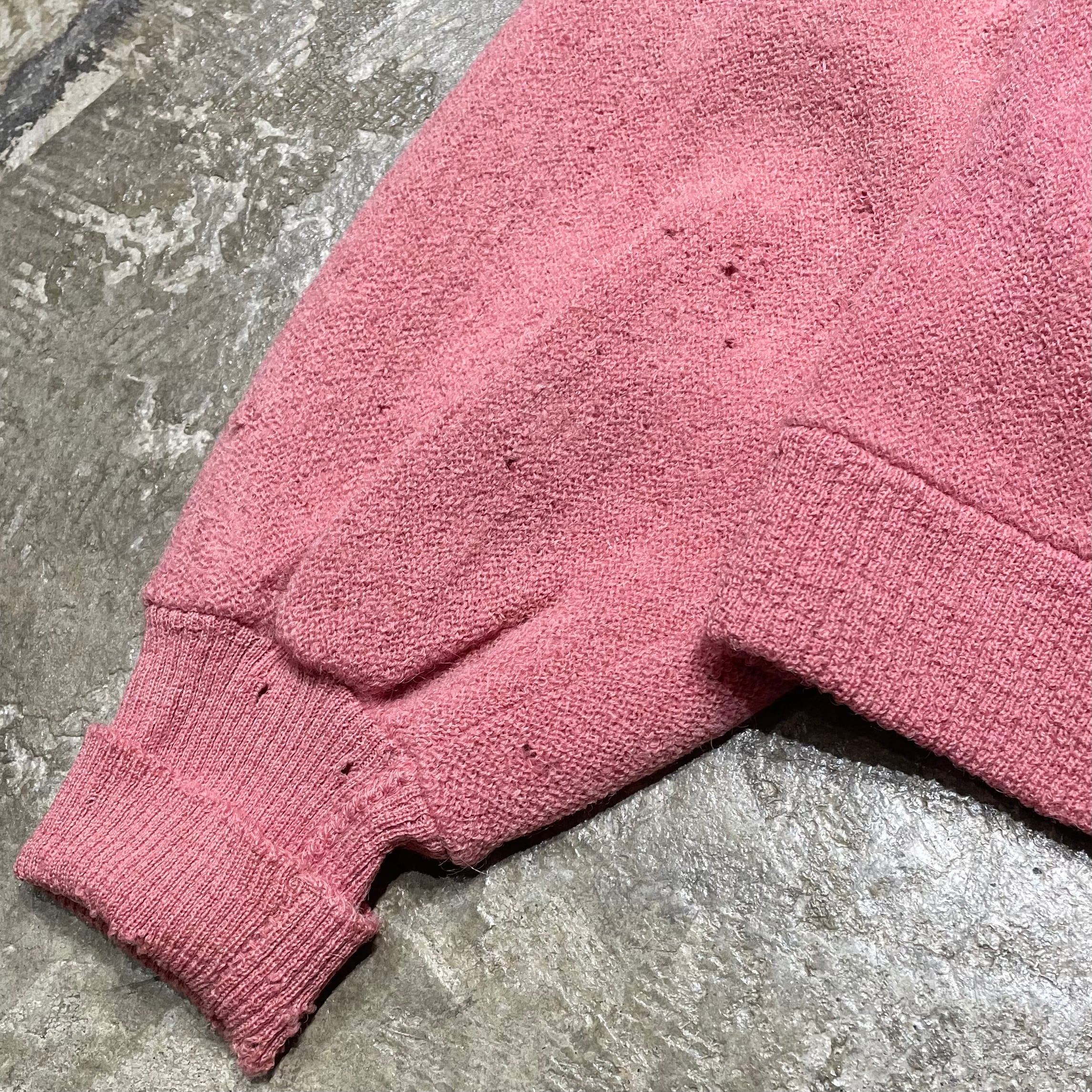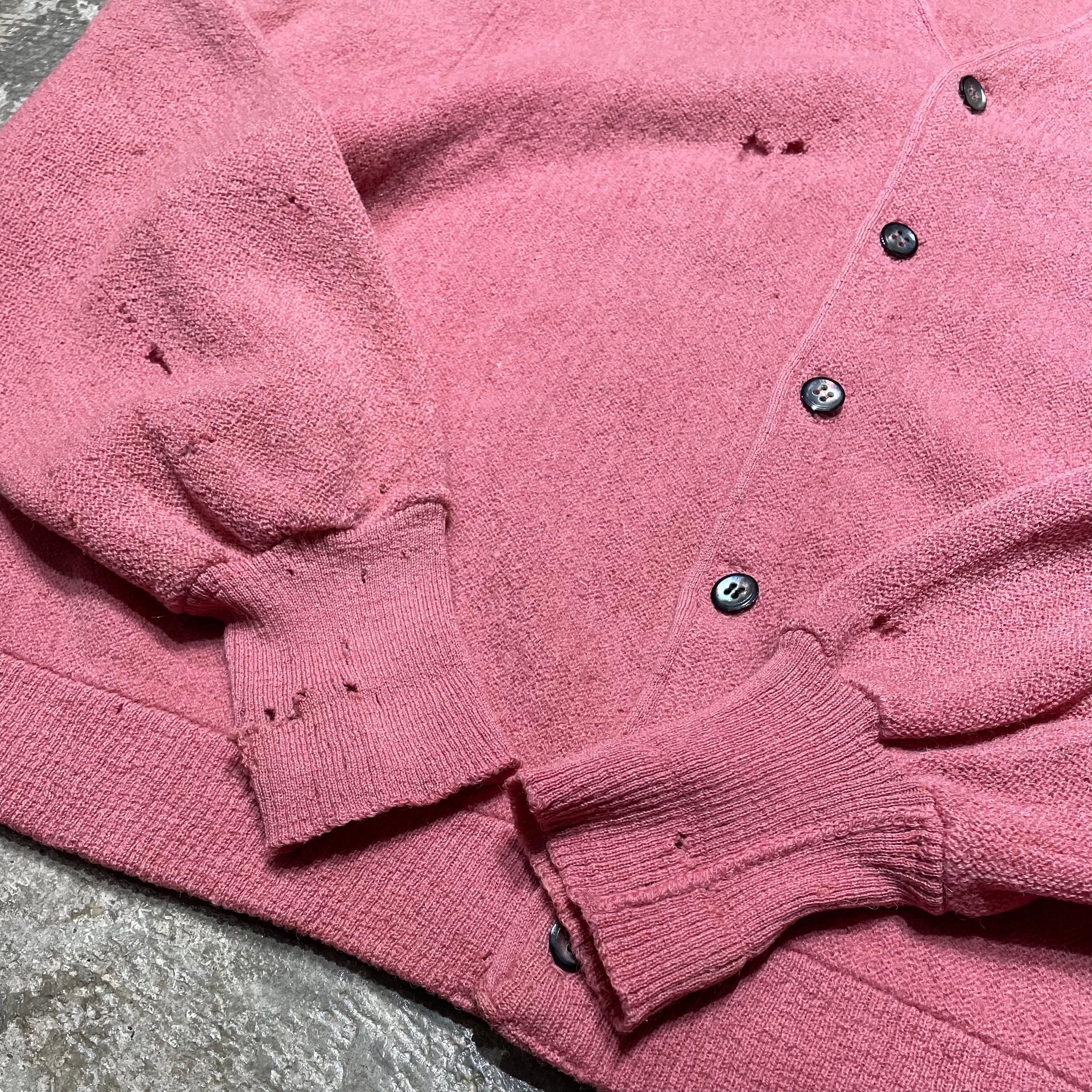 1960年代頃のヴィンテージウールカーディガン。珍しいピンクカラーが印象的で、素材はウール50%・アルパカ50%の高級ブレンドになっています。柔らかく軽い着心地ながら、経年によるダメージが全体に現れており、ヴィンテージならではの深い味わいを感じられます。