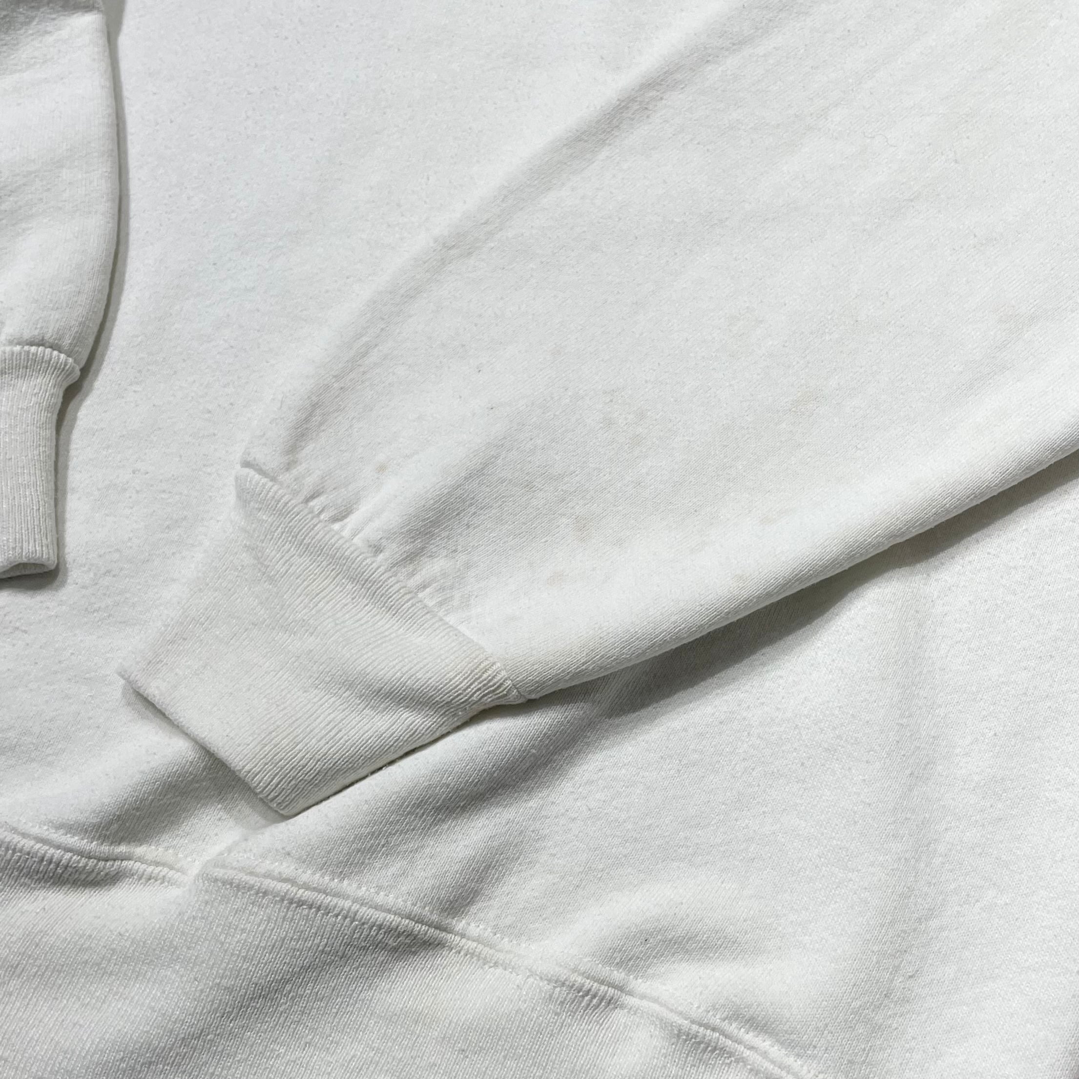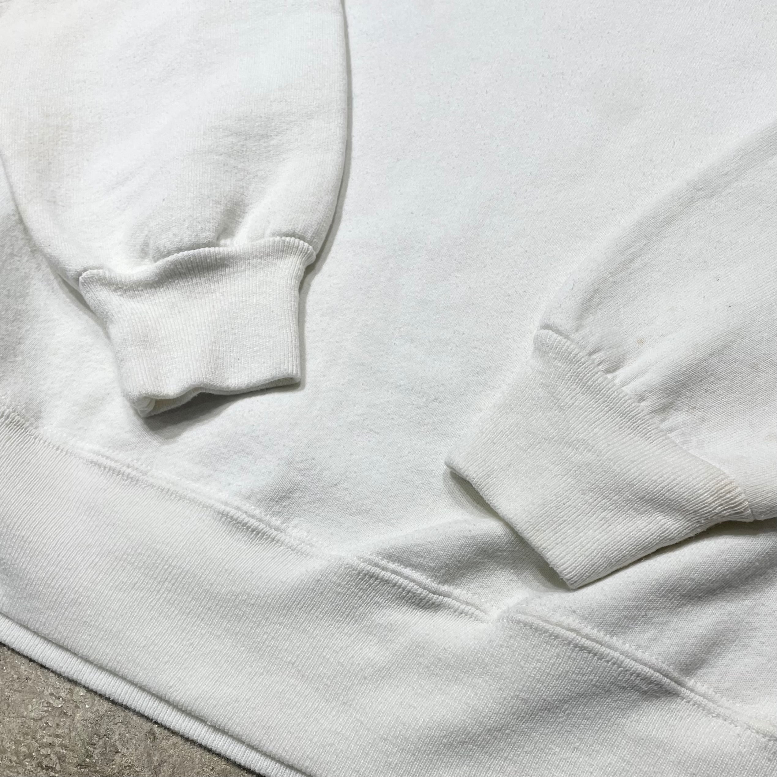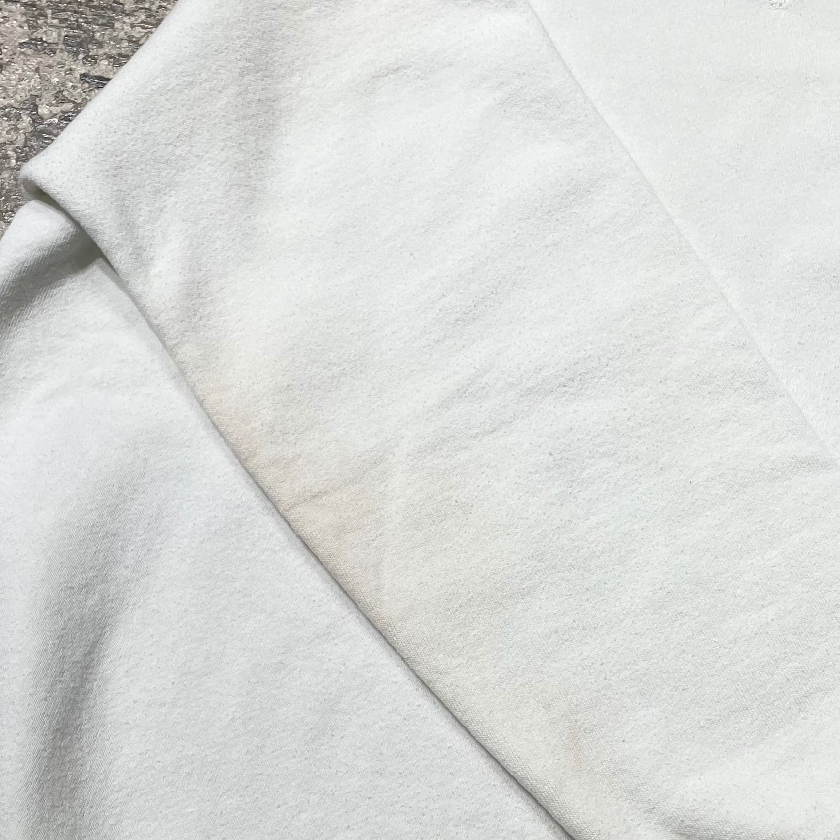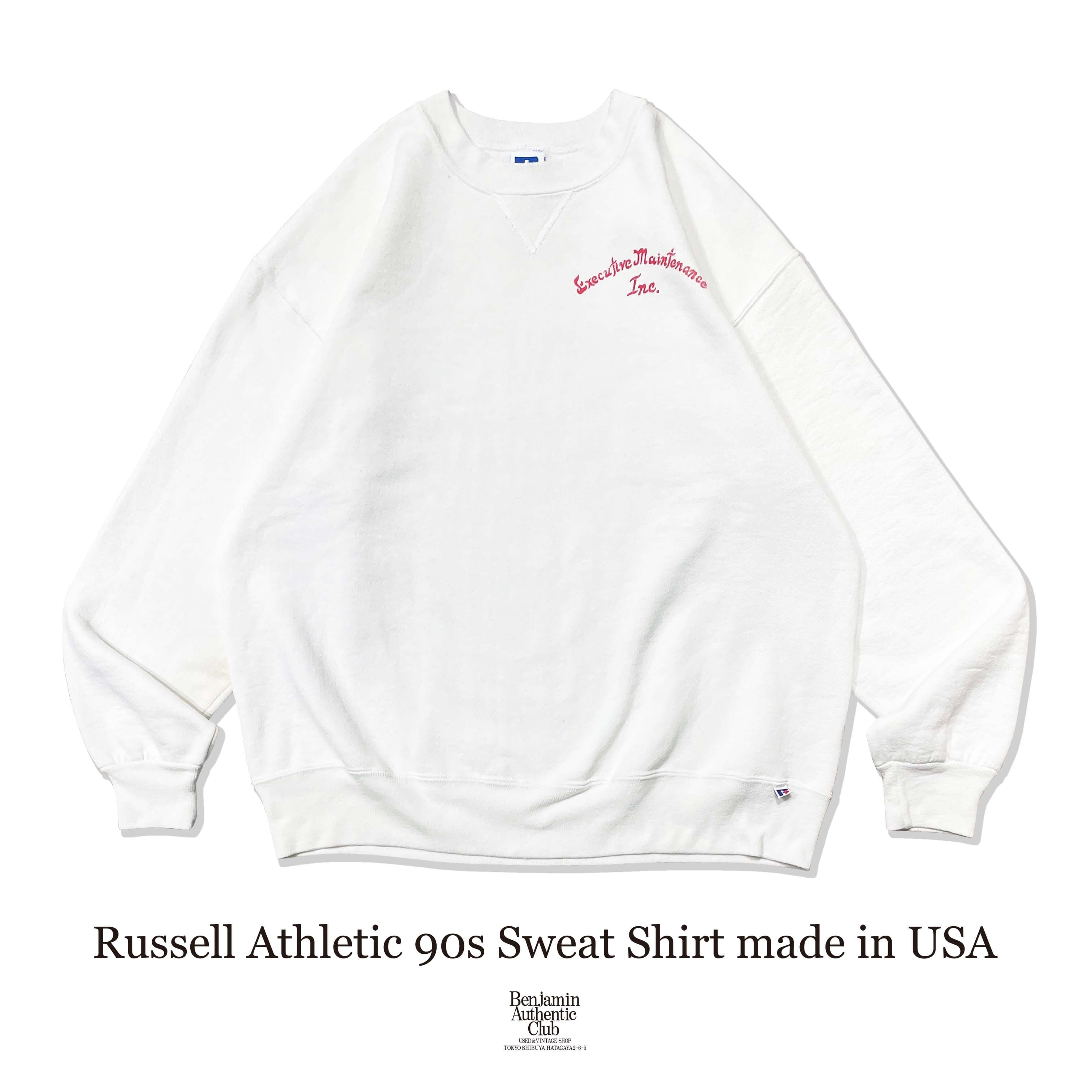 90年代のアメリカ製Russellガゼット付きスウェットです。オフカラーのボディに赤文字で「Exclusive Maintenance Inc」とプリントされており、90年代カルチャーを感じさせる一枚。Russellならではのふわっとした柔らかいボディと、やや短めの着丈のバランスが絶妙で、今のスタイルにもぴったりです。古着ならではの雰囲気を楽しみながら、長く愛用できるアイテムです。