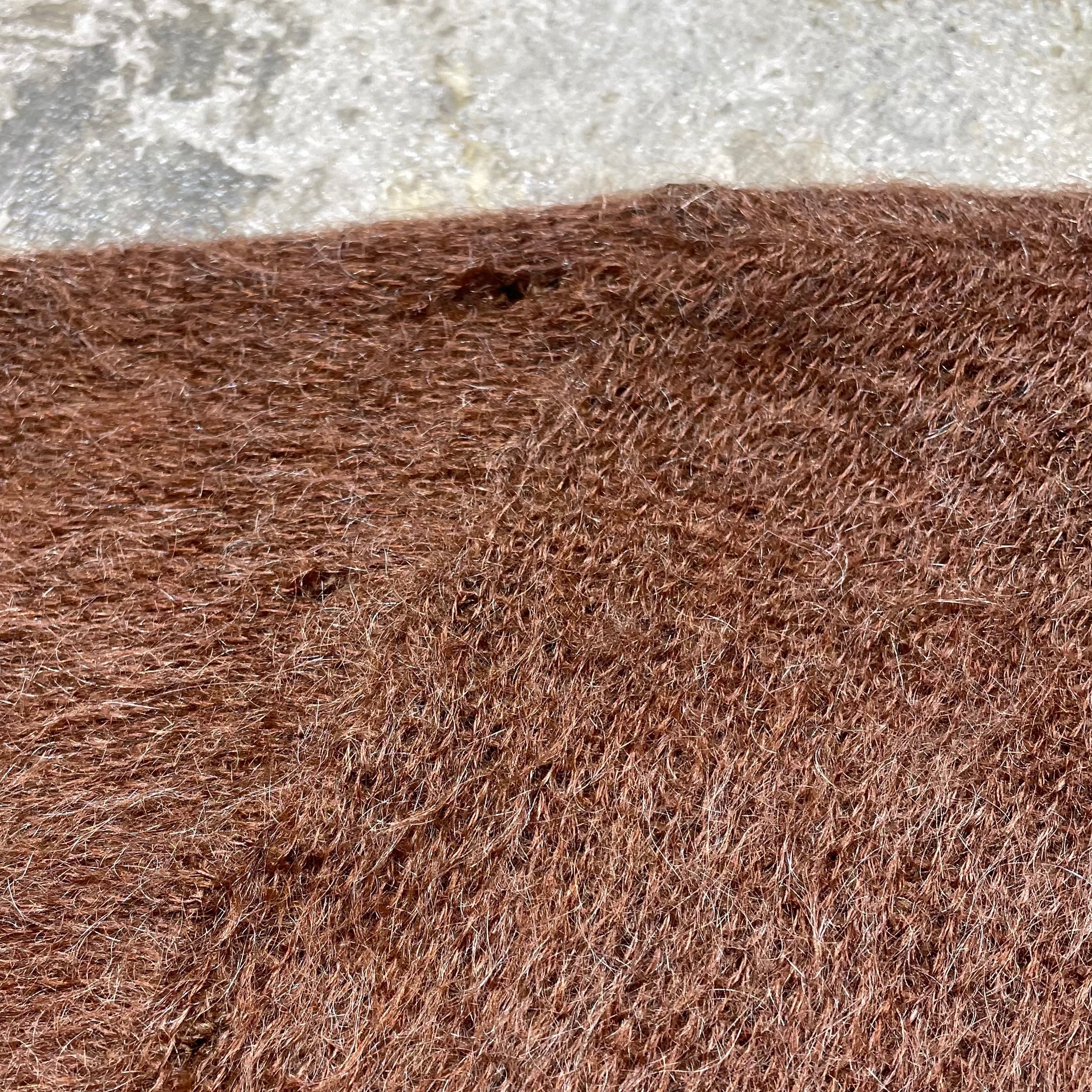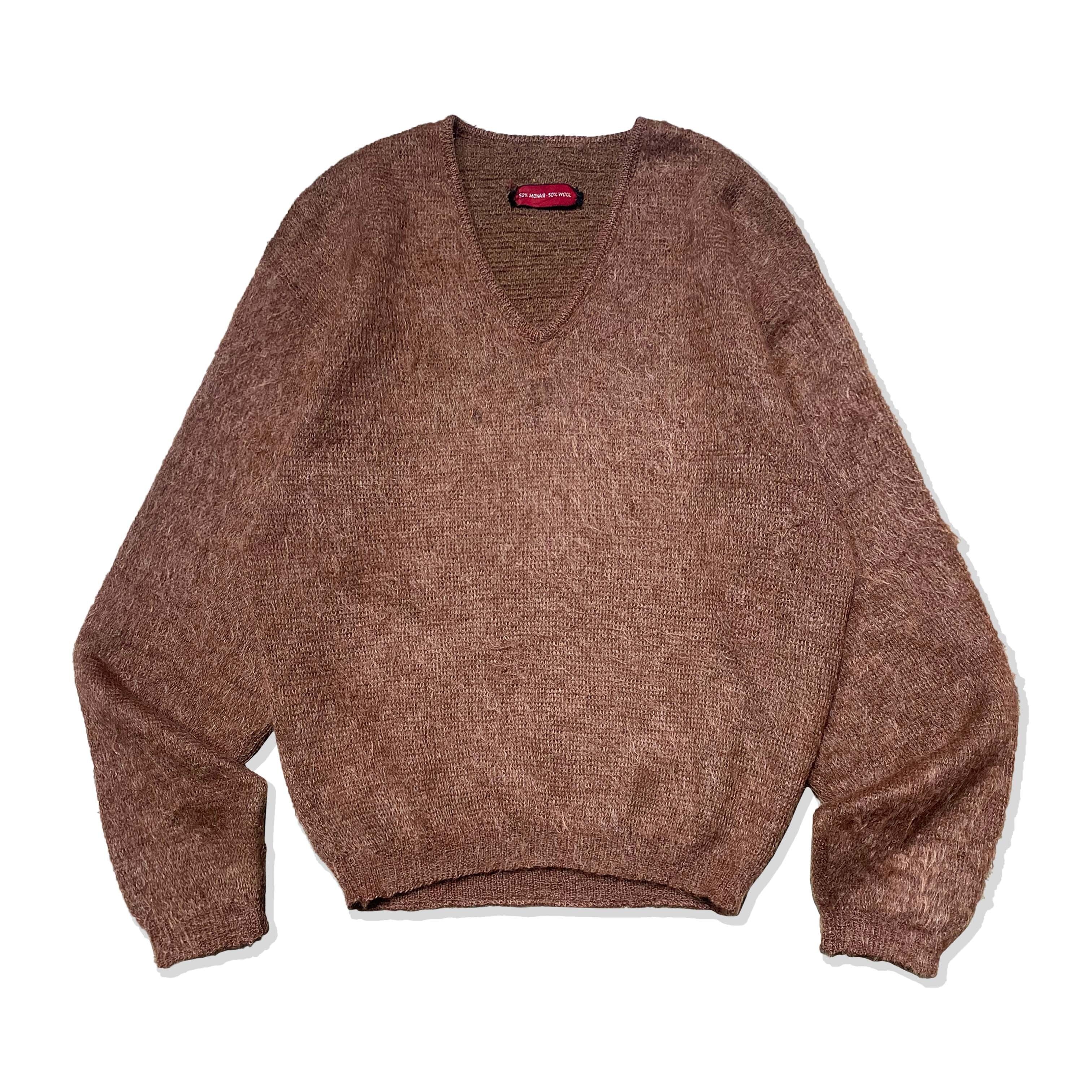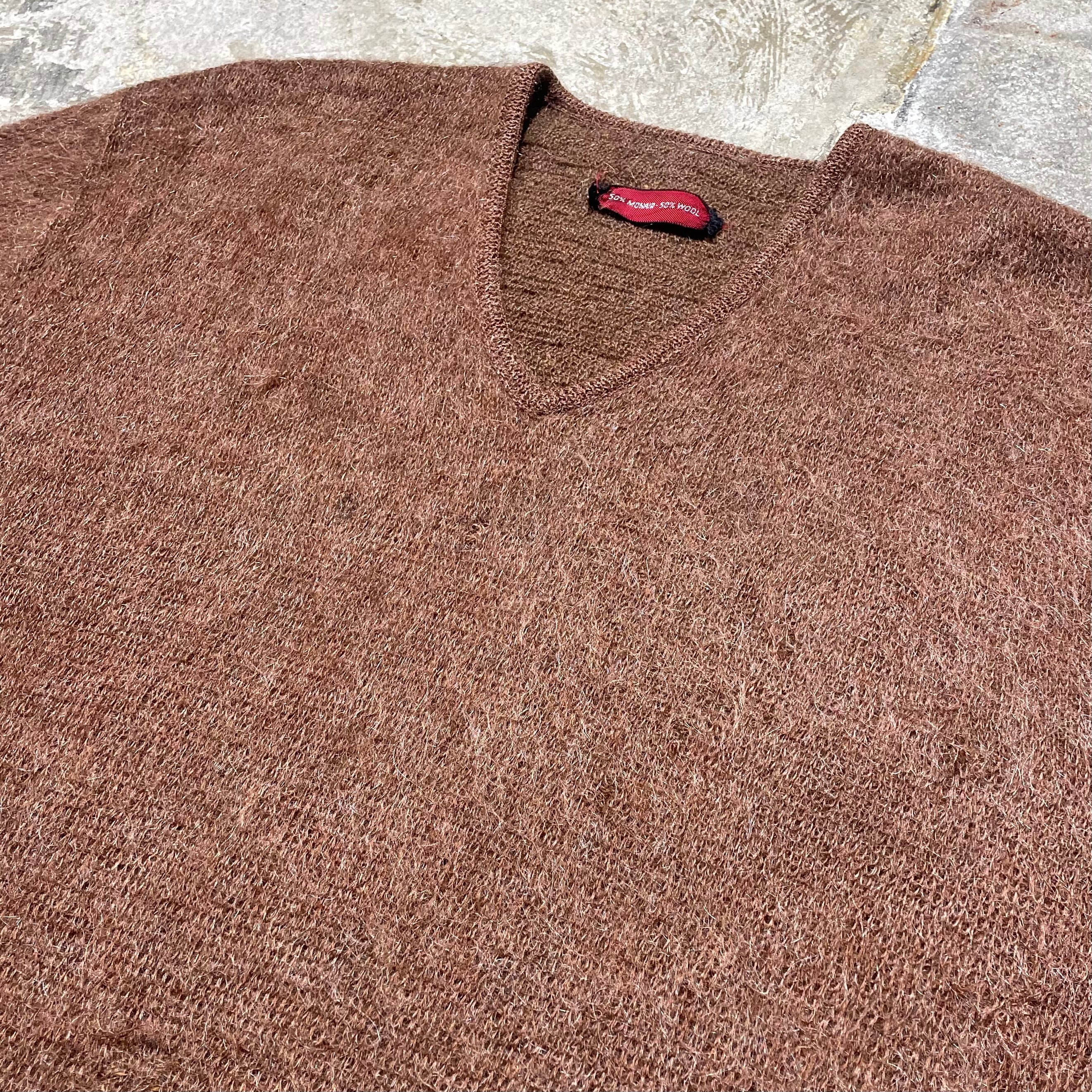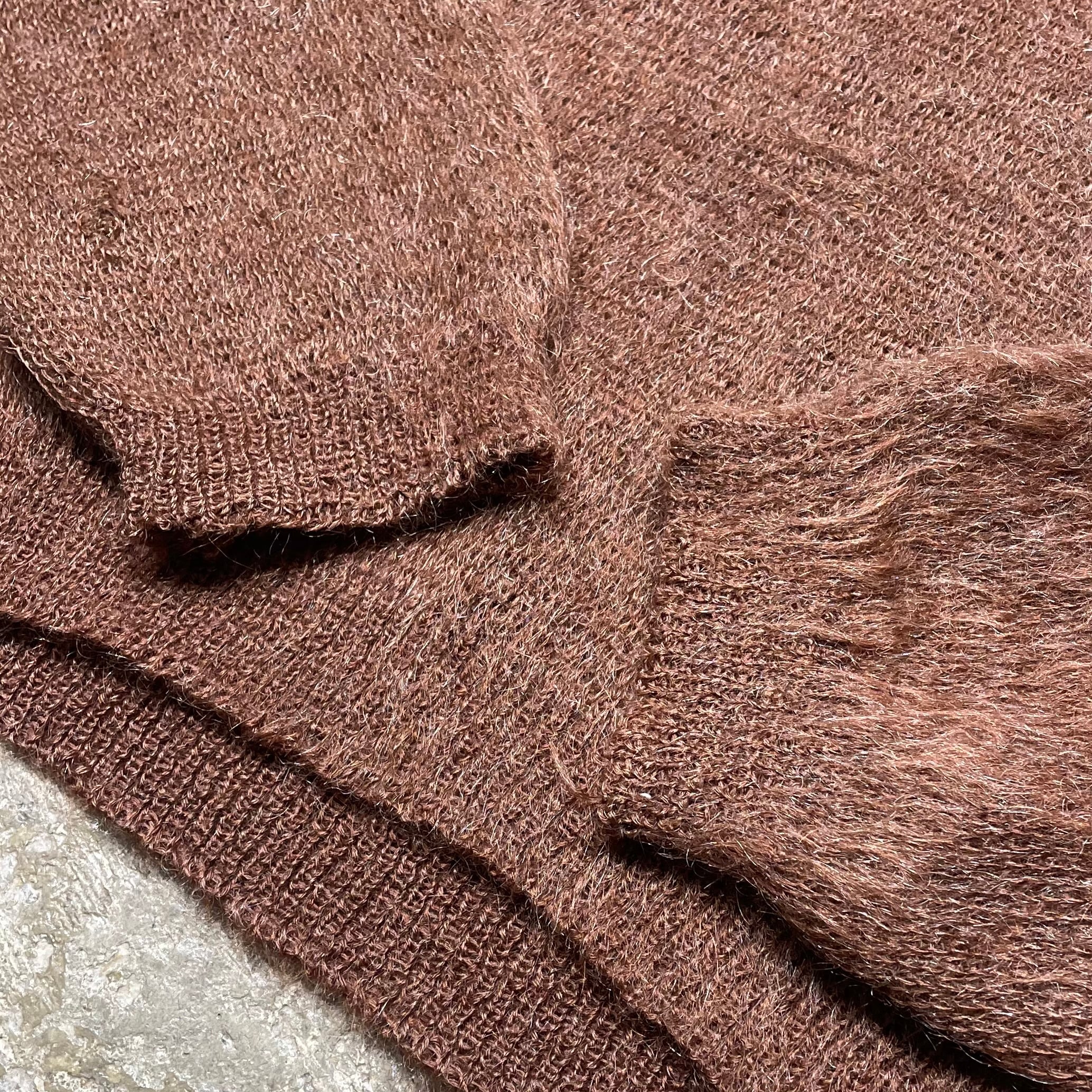 1960年代のヴィンテージニットで、モヘア50%・ウール50% の高級糸を使用した一着。光沢のあるモヘアが非常に上品で、ヴィンテージならではの存在感を放っています。