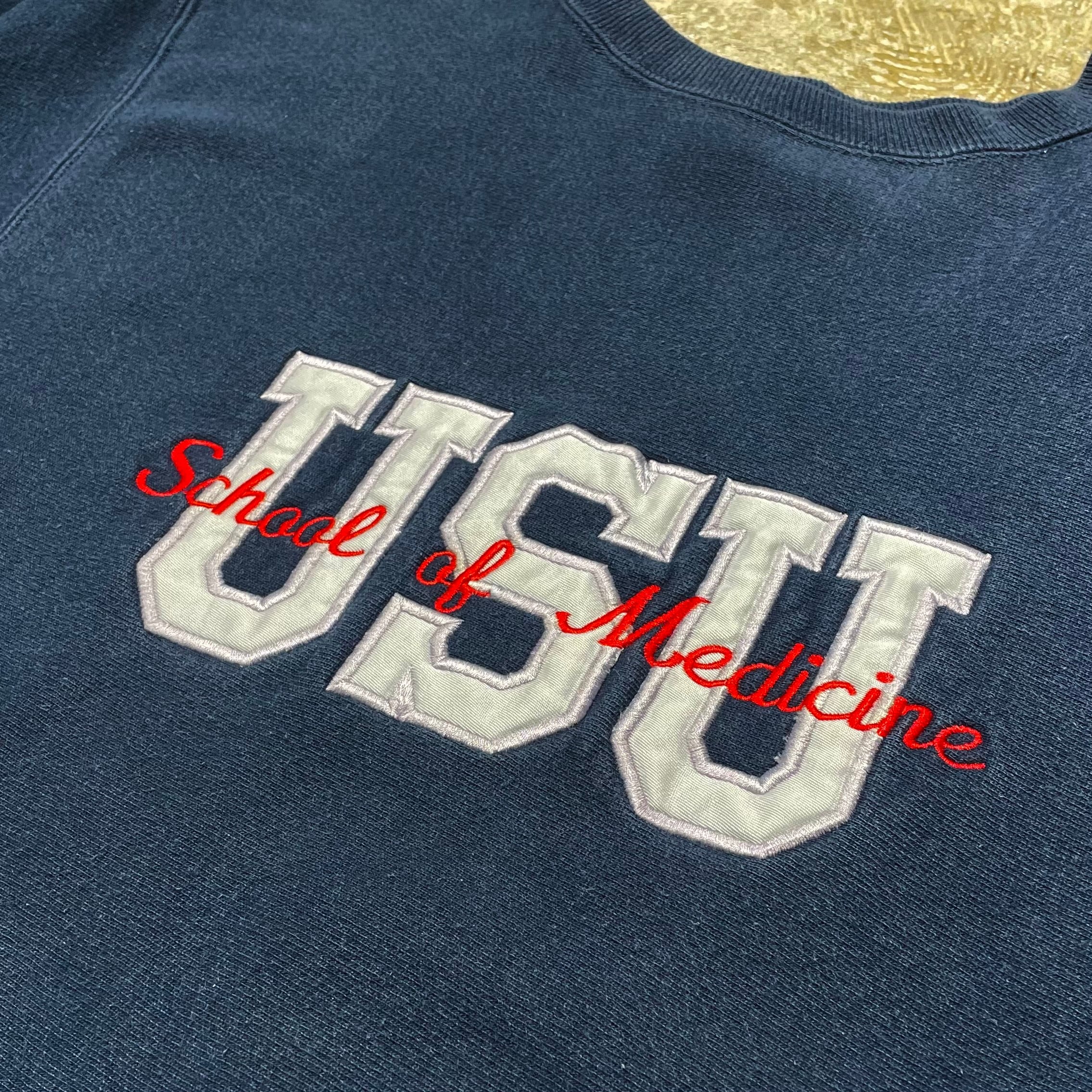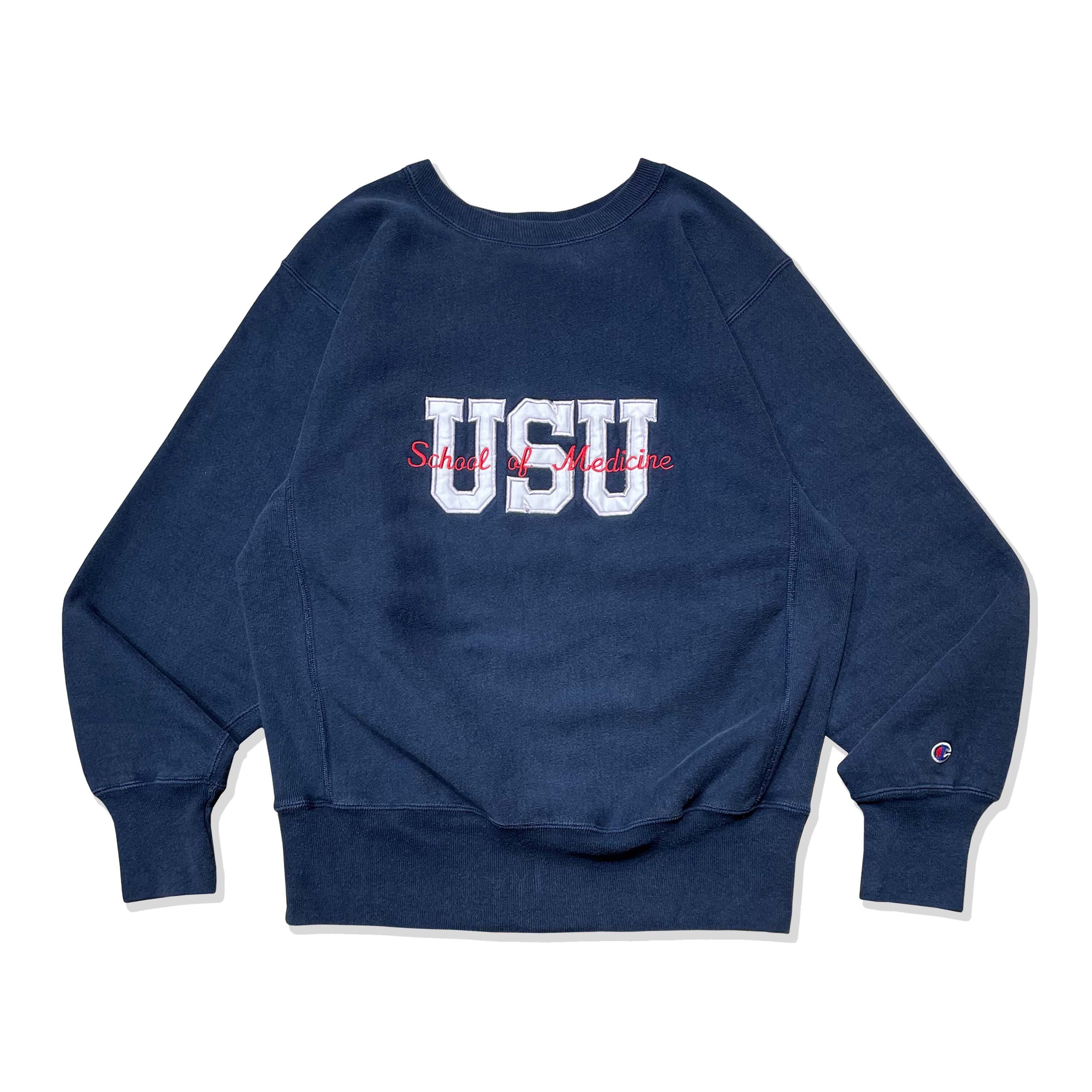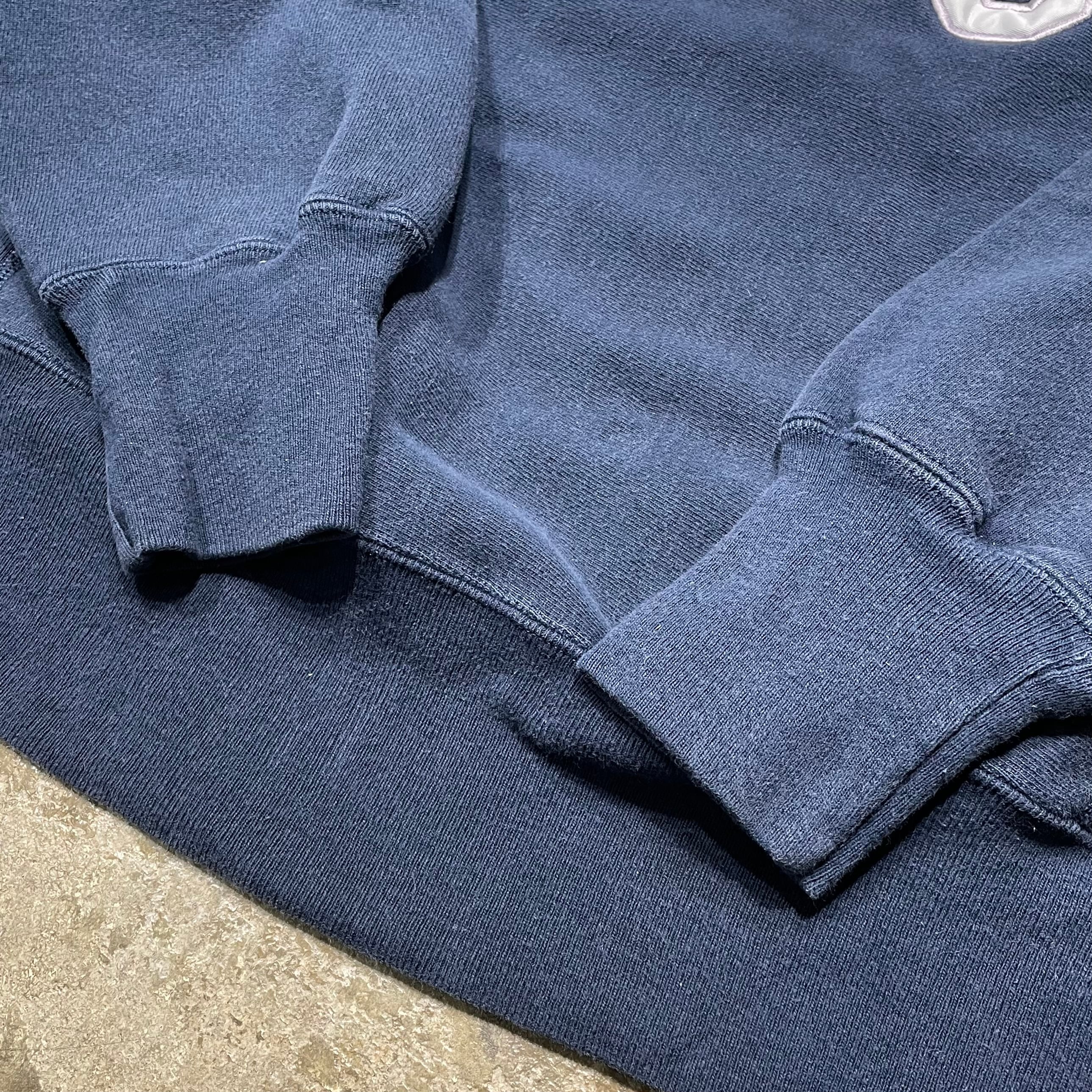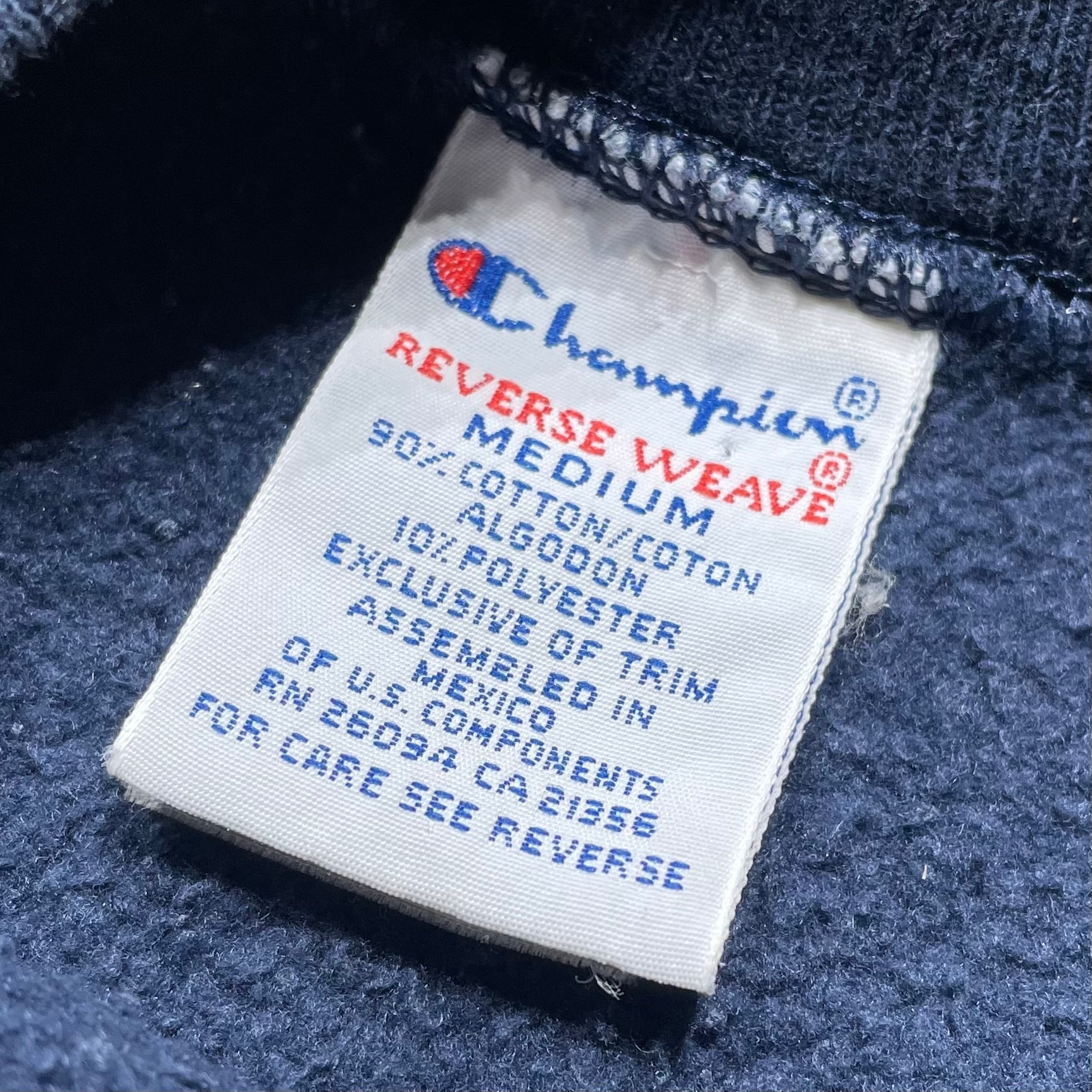 チャンピオンのリバースウィーブ、90年代メキシコ製の一着です。ネイビーボディに白のアップリケと刺繍が施された、こだわりあるデザインが魅力です。カレッジモチーフではありますが、少し珍しいタイプで特別感があります。