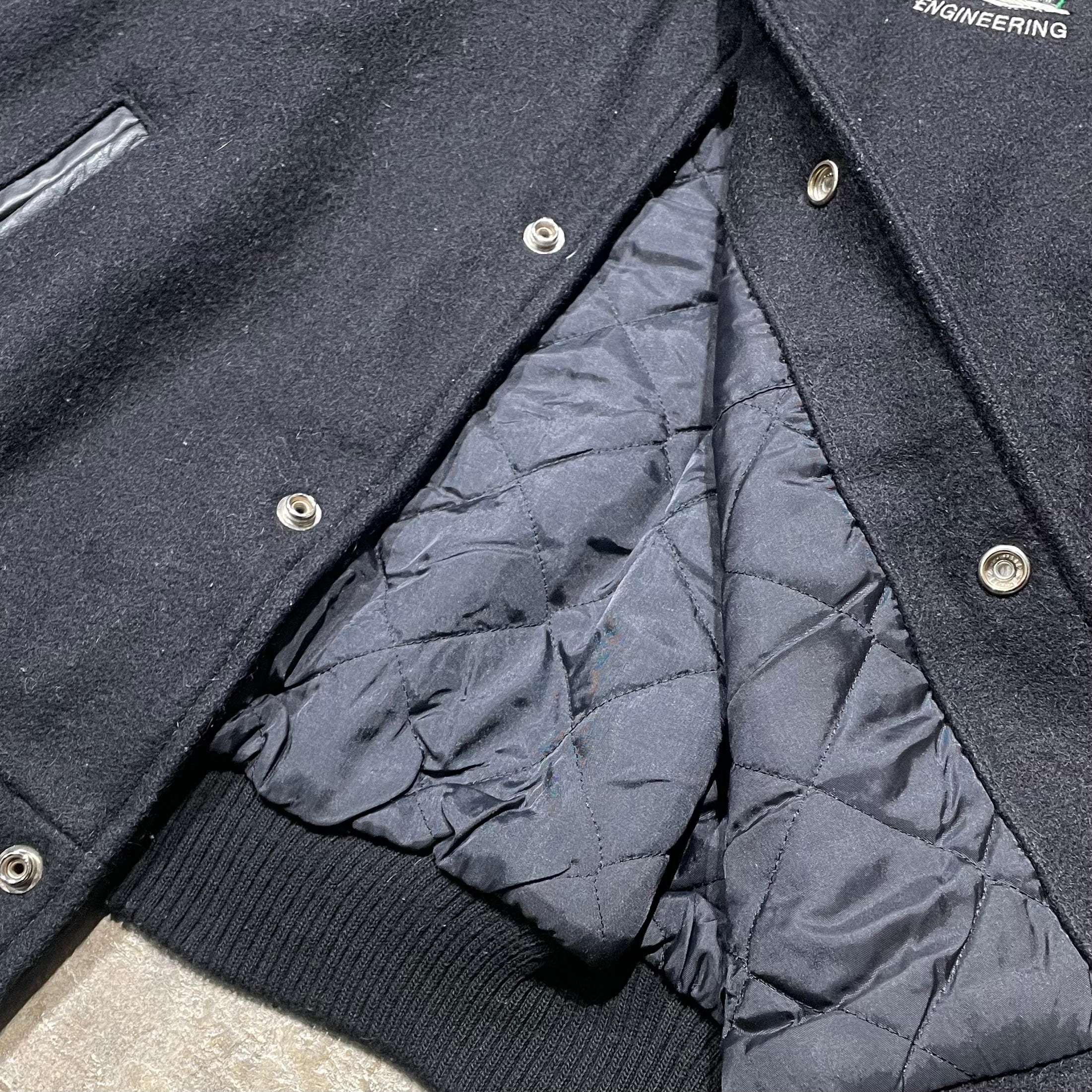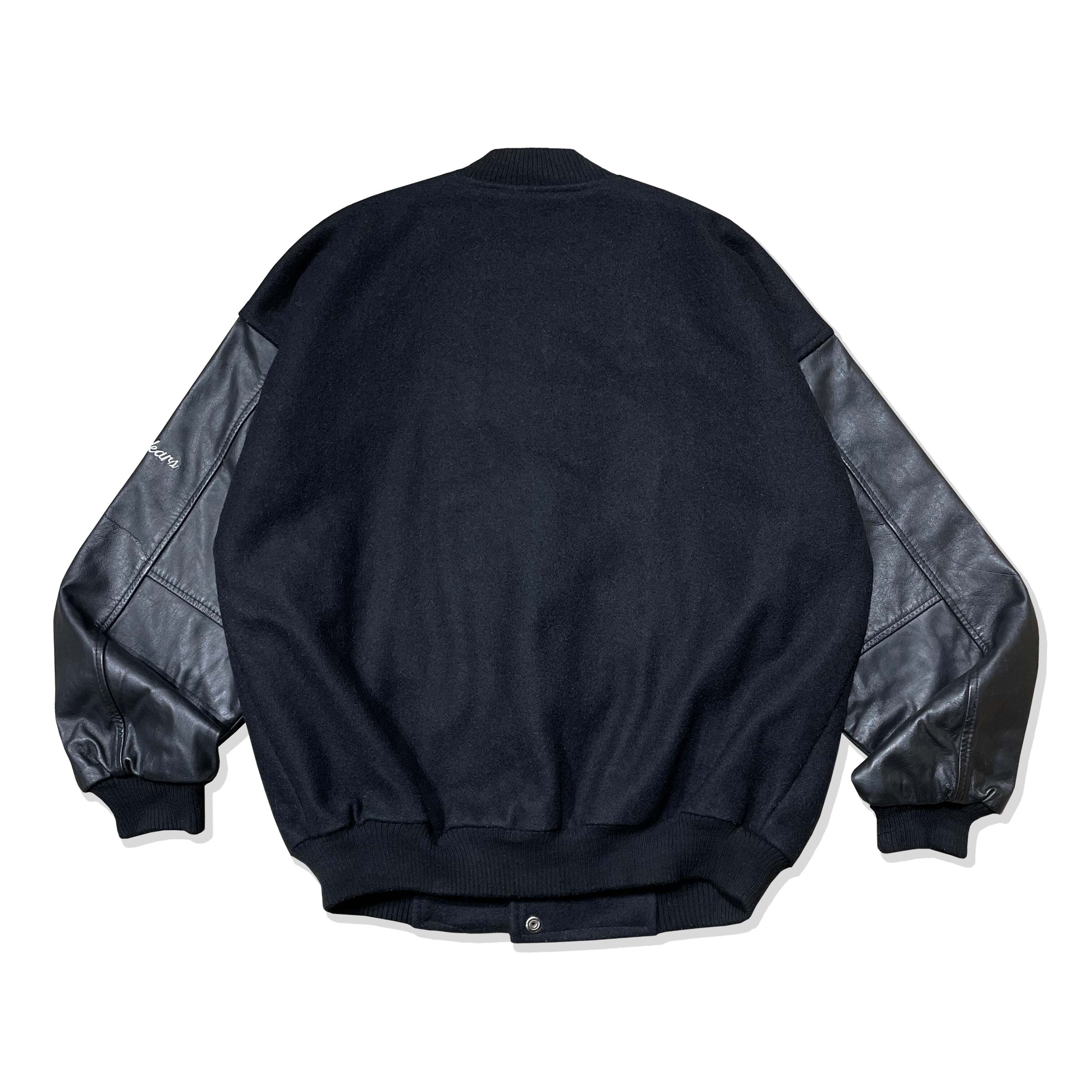 メルトンウールのボディにレザー袖を組み合わせたクラシックなバーシティジャケット。オールブラックベースで、どんなスタイルにも取り入れやすい万能なデザインになっています。