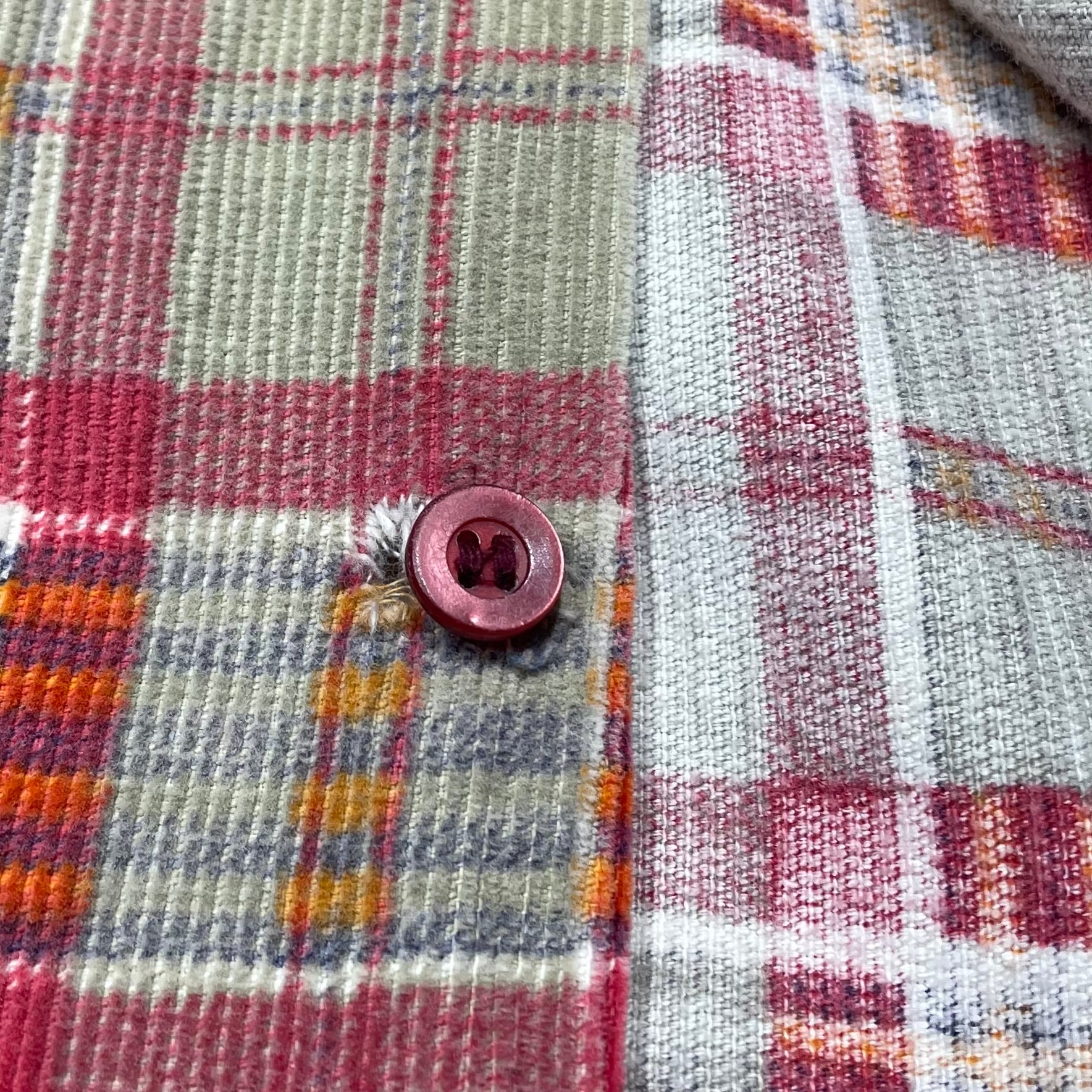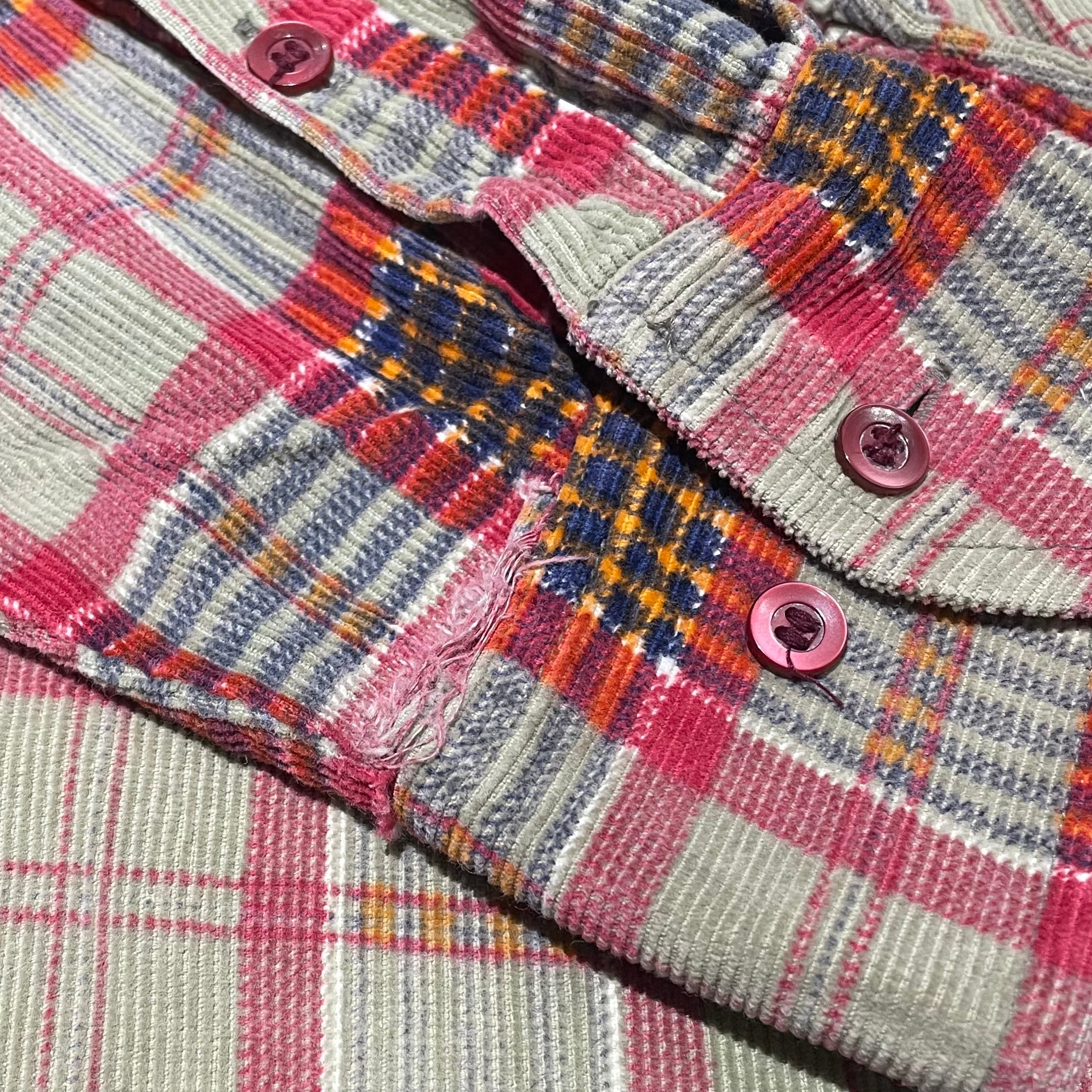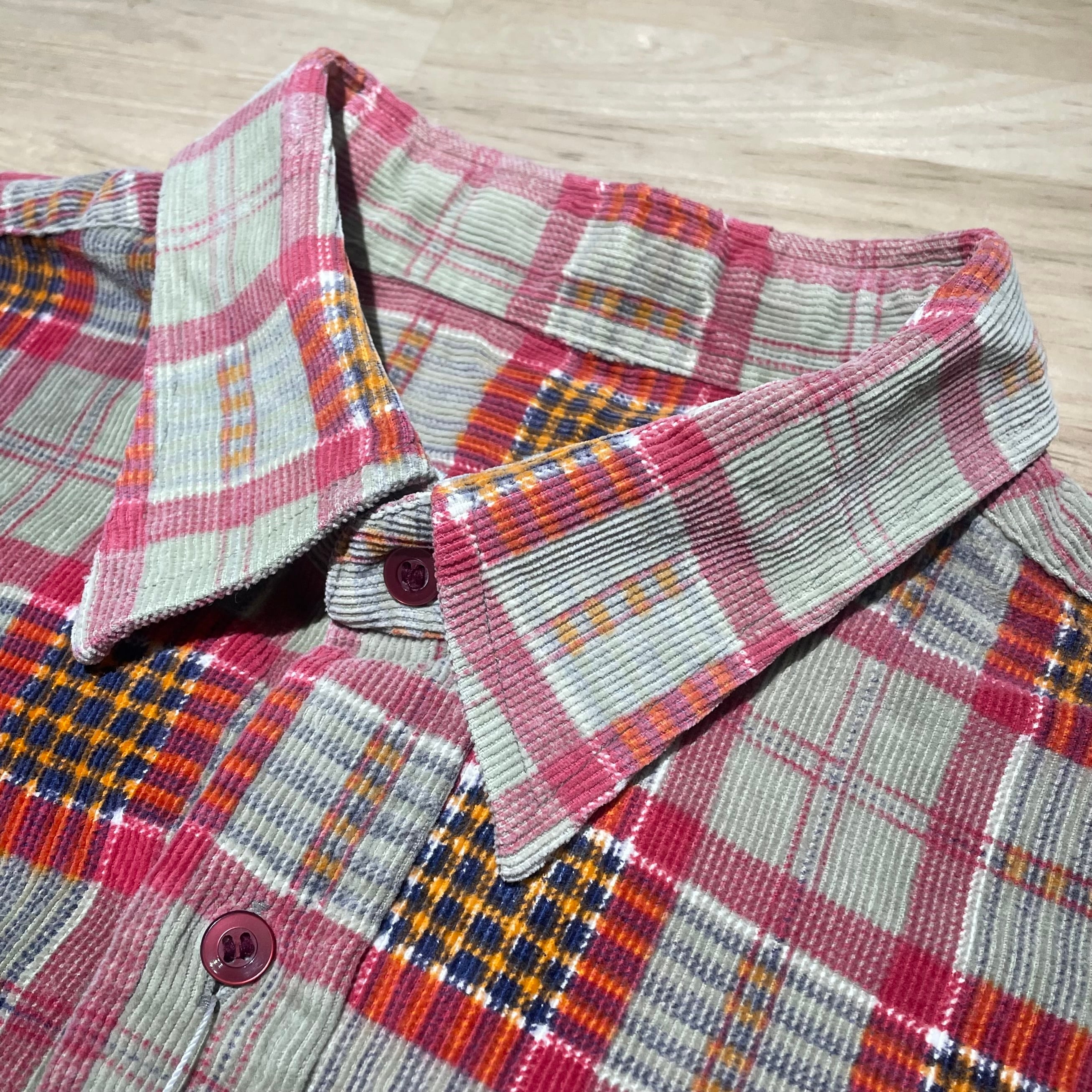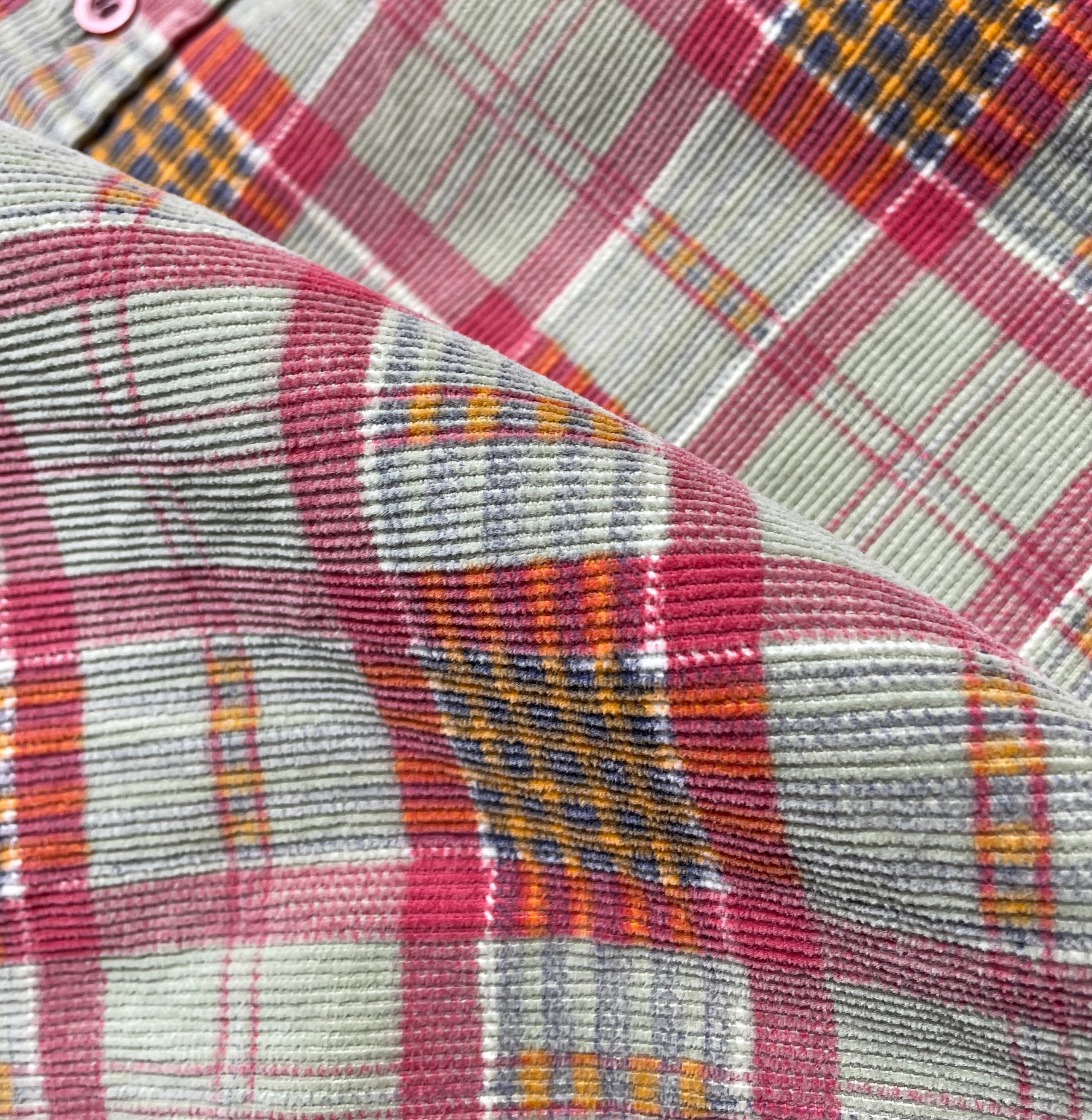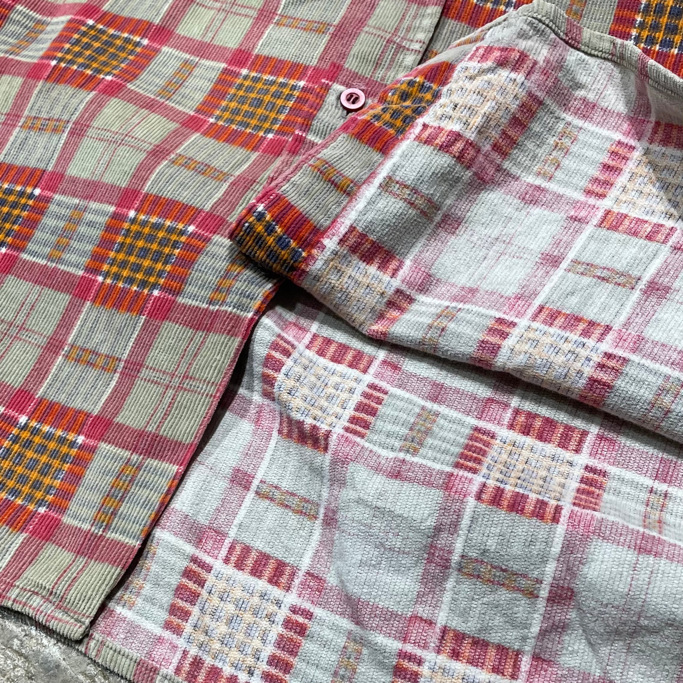 コットンコーデュロイ素材に、チェック柄をプリントした個性のある1着。