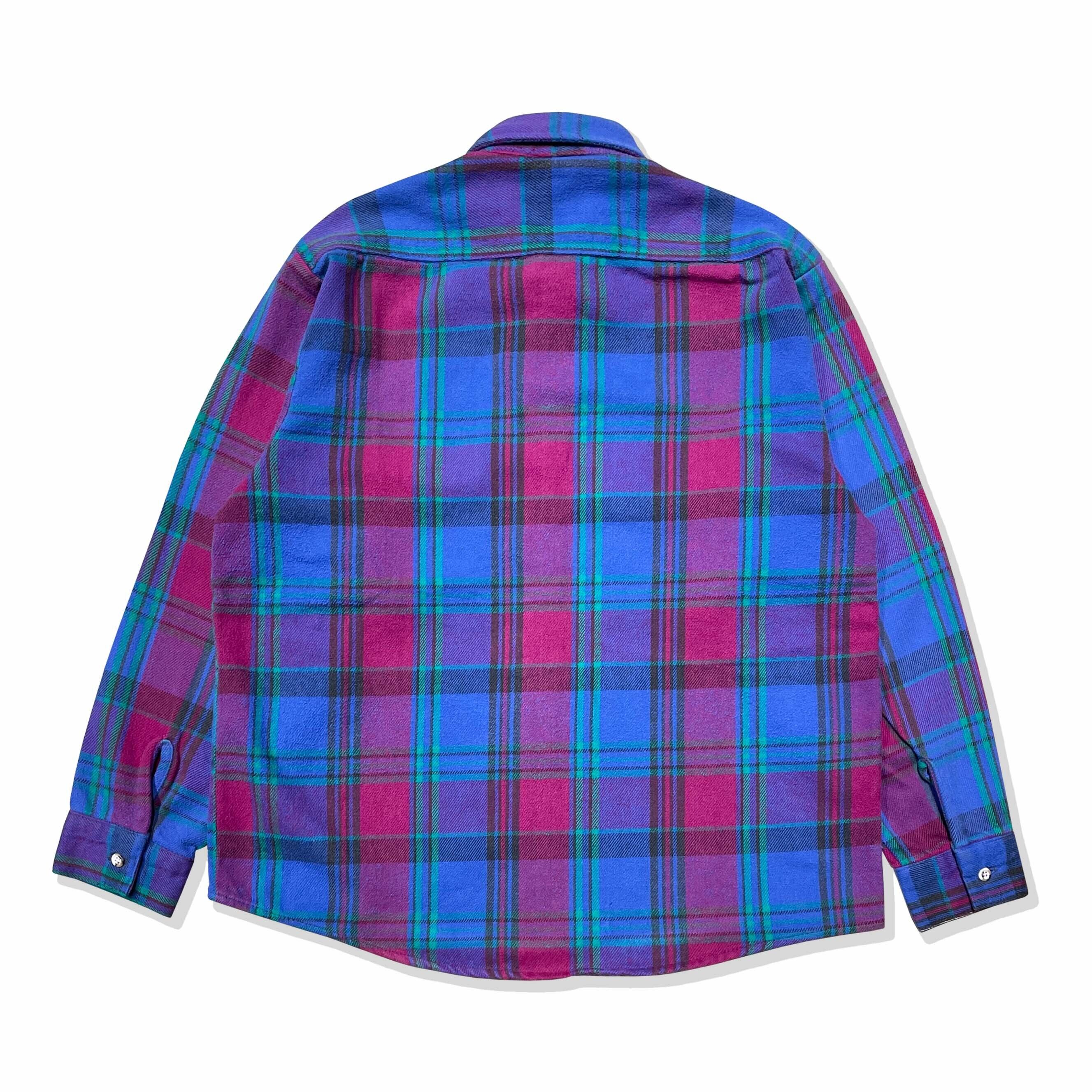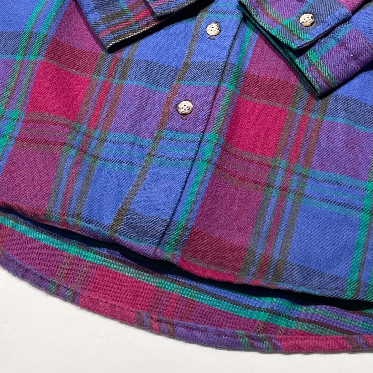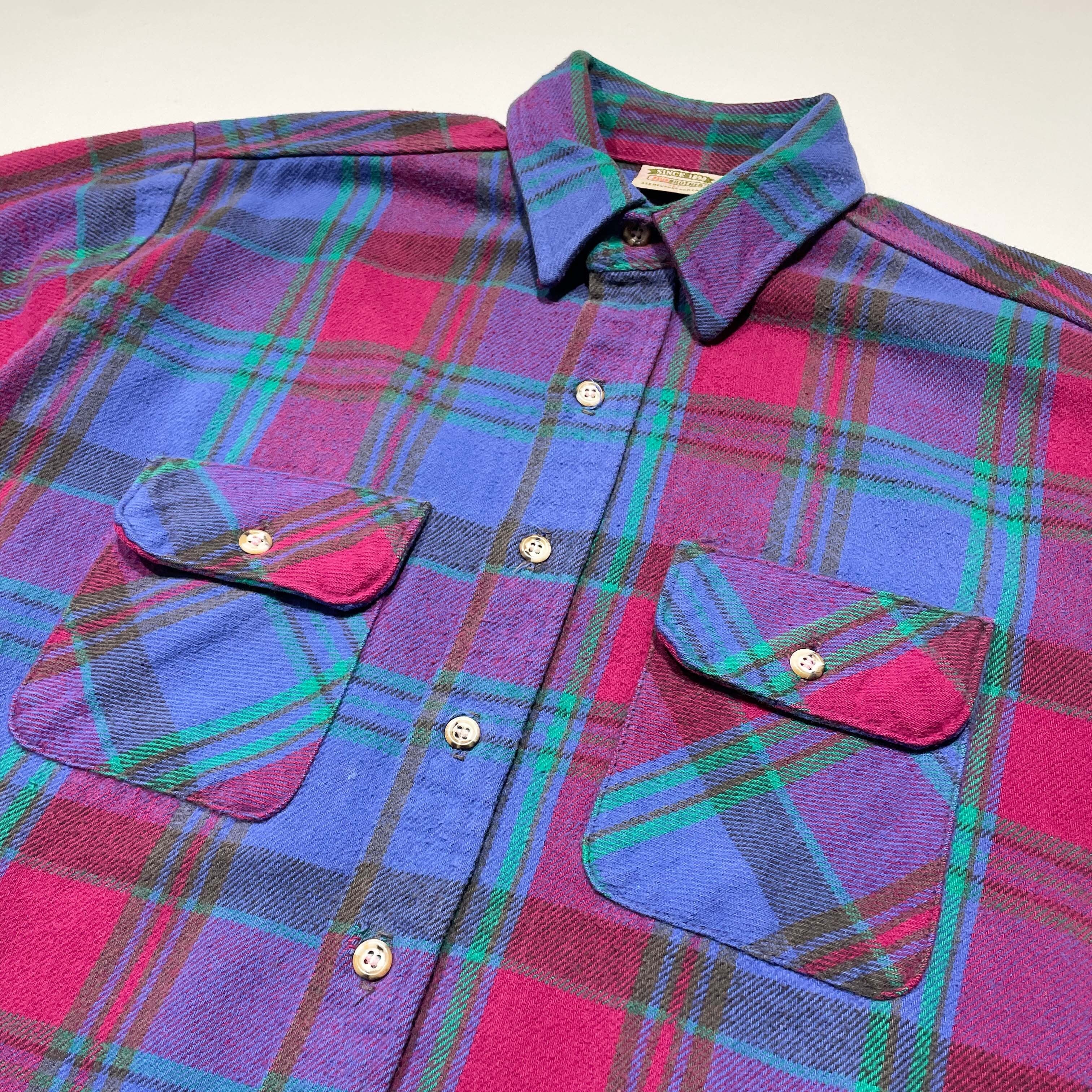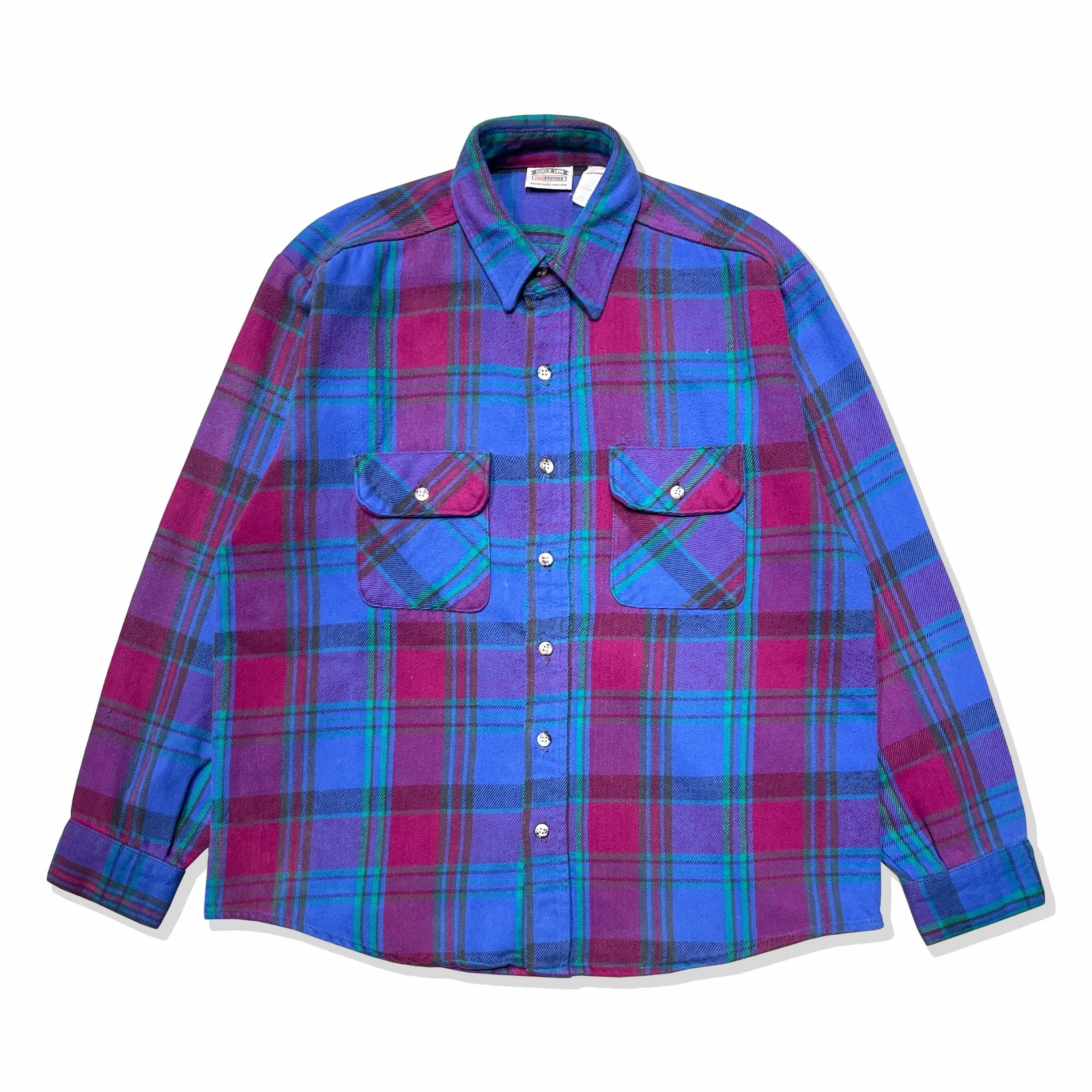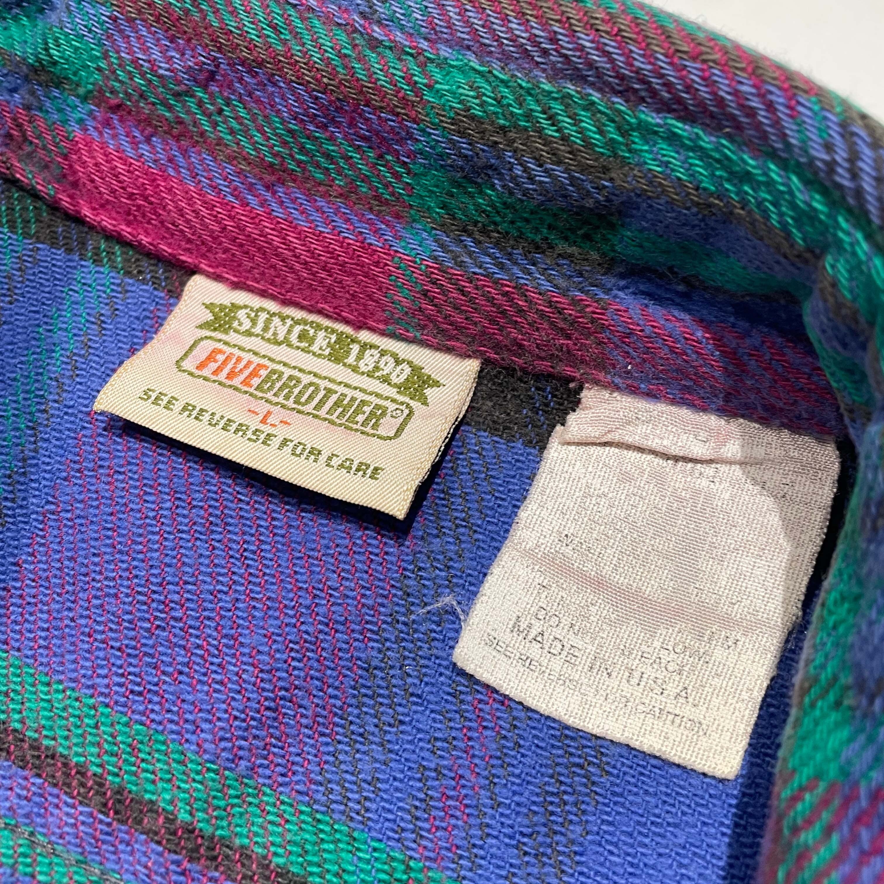 【洒脱な好配色】90年代USA製ファイブブラザー、希少なパープル×ネイビー。アメカジの土臭さにオルタナティブな色気が混ざる、唯一無二の存在感を放つ一着です。サイズは需要の絶えないLsize。着丈が長すぎない、まさに"ゴールデン"なバランス。肉厚な質感と秀逸なシルエットを兼ね備えた、非の打ち所がないネルシャツの完成形です。定番を少し外した「玄人好み」な一枚を探していた方は、ぜひこの機会に。