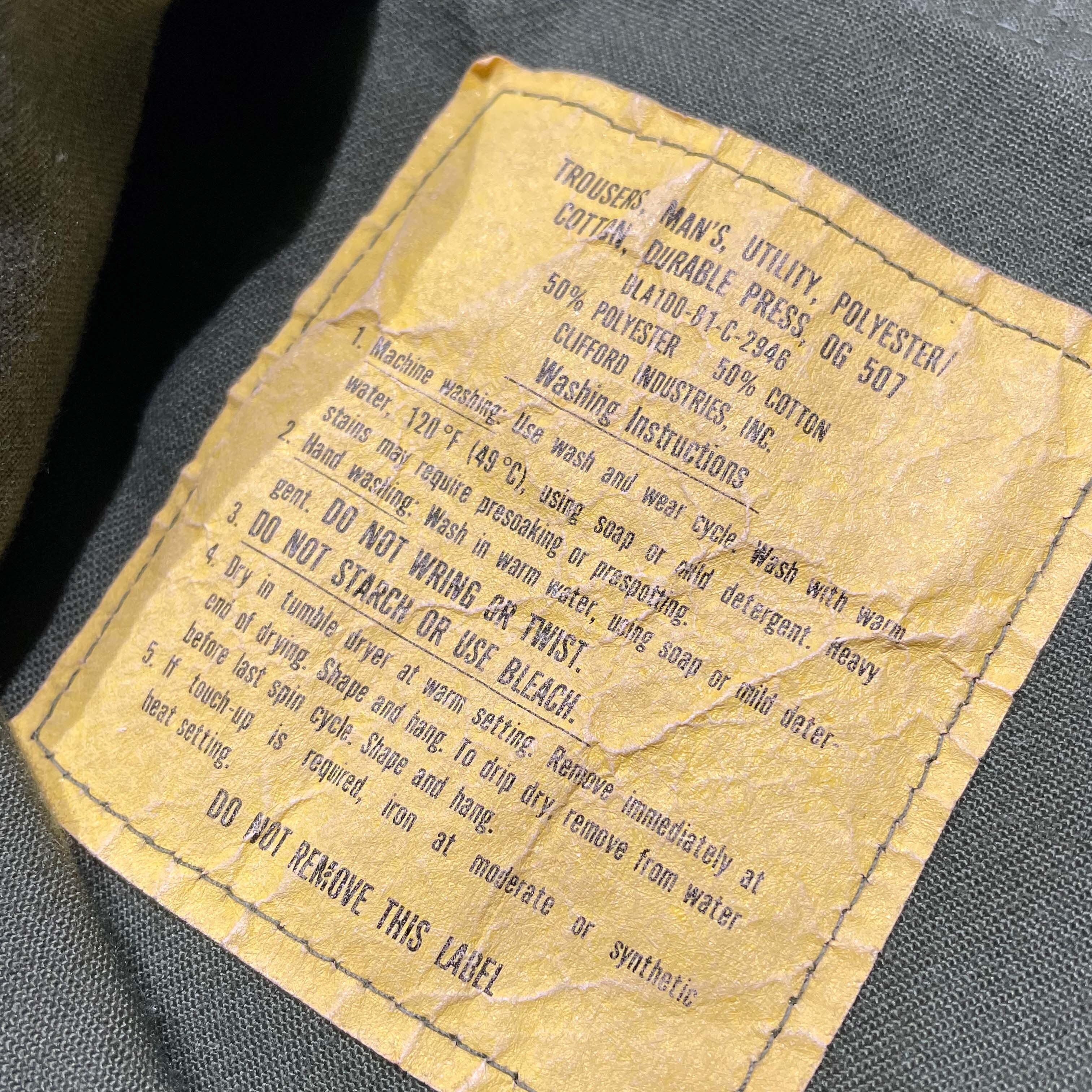 1981年製、米軍実物のOG-507ユーティリティパンツ。コットン×ポリのバックサテン地は、耐久性と履き心地の良さを両立した名作です。
