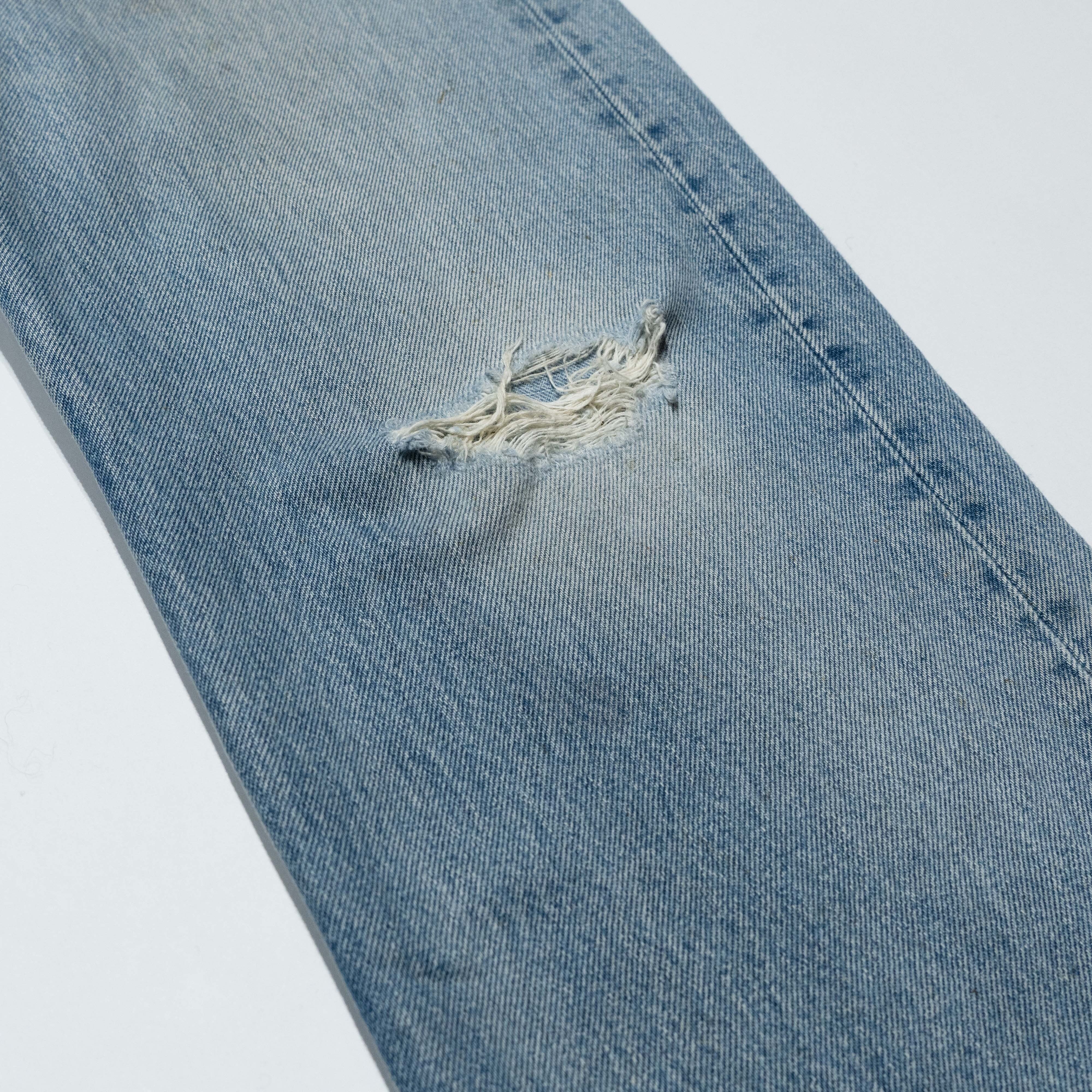 古着ならではのナチュラルな色落ちと膝の破けがオルタナティブな90年代アメリカンカルチャーを感じる1本。