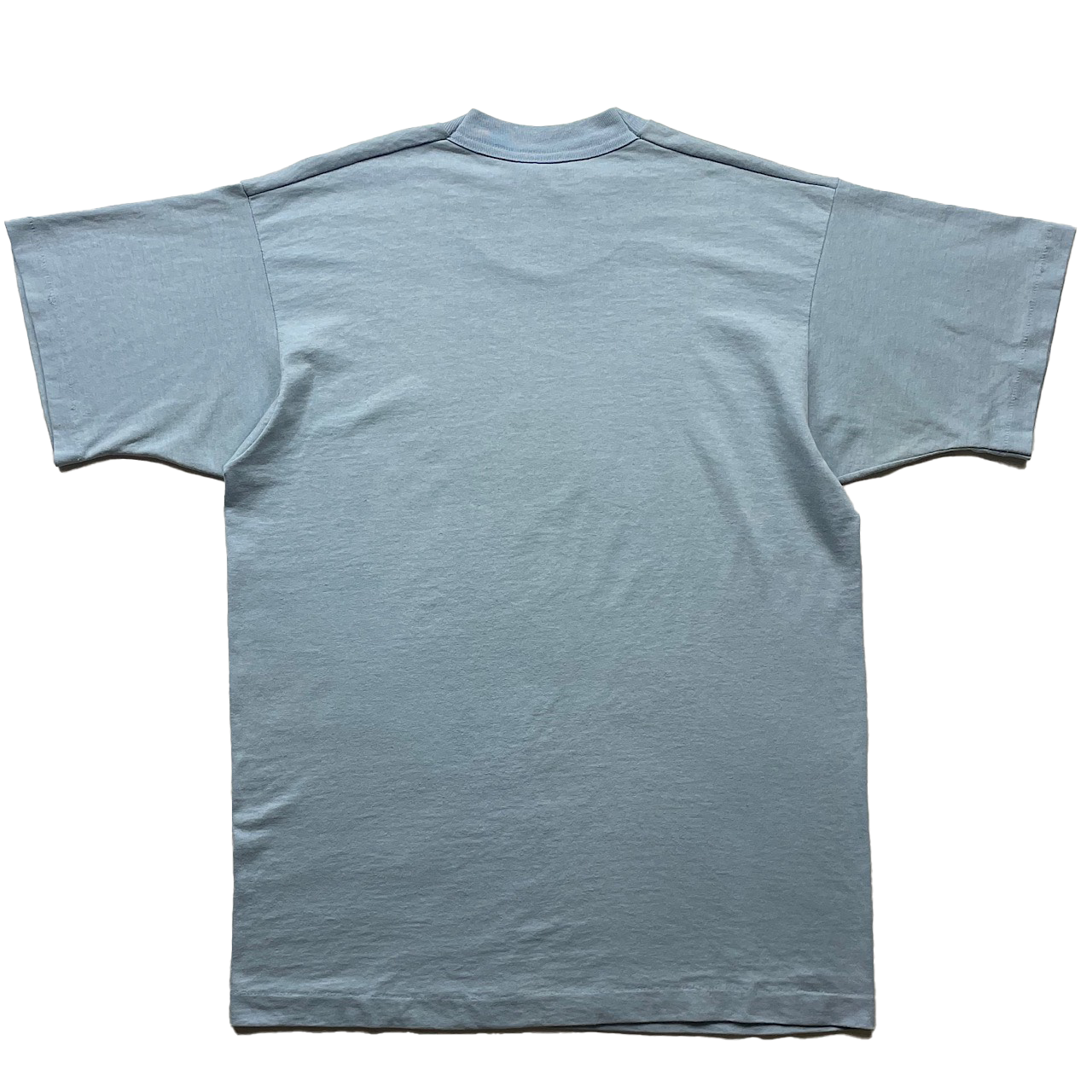 レコードが印象的なグラフィックと水色のボディが珍しい1枚。仕様は裾、袖口がシングルステェッチになっております。
