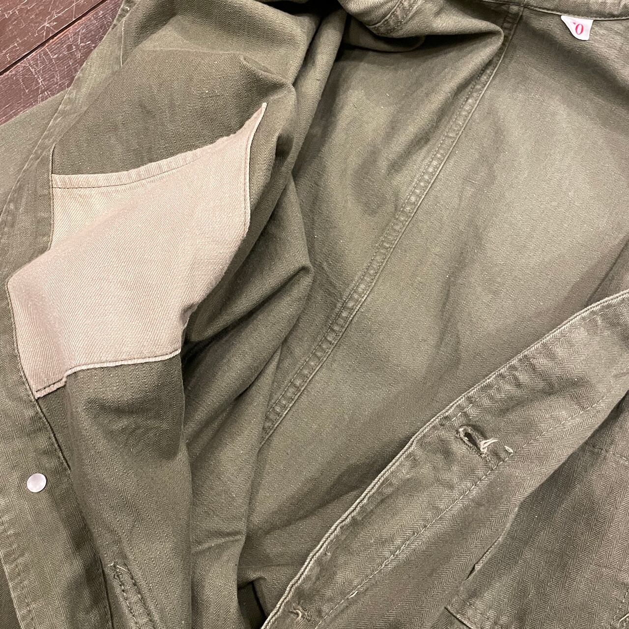 フレンチヴィンテージならではのコットンヘリンボーン素材、台衿なし仕様、ボックスシルエットのワークジャケット。内ポケットもフレンチヴィンテージを感じる仕様です。