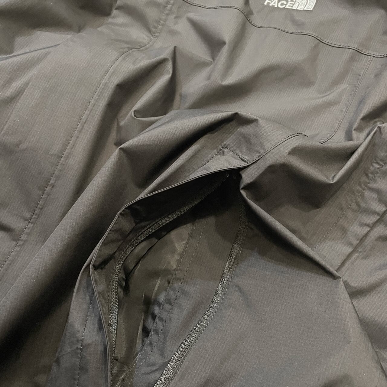 ボディであるノースフェイスは2.5レイヤーと言われる2重生地に樹脂プリントがされている素材を使用に加え、裏面シームテープが貼られており撥水性かつ中に水が入らない構造。