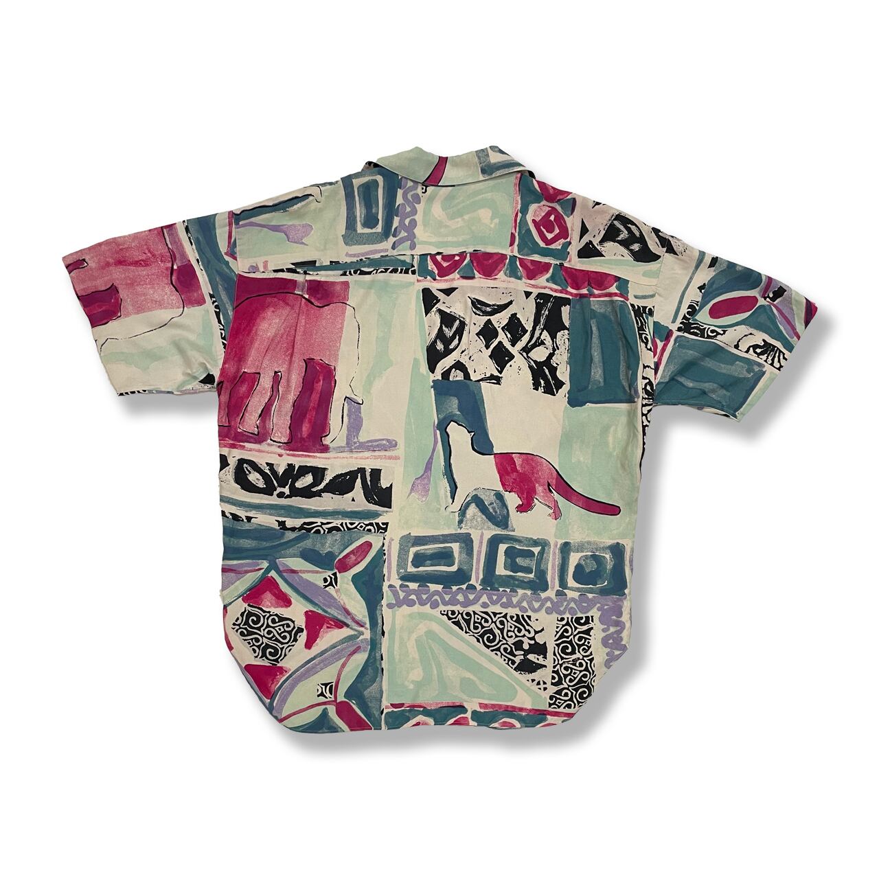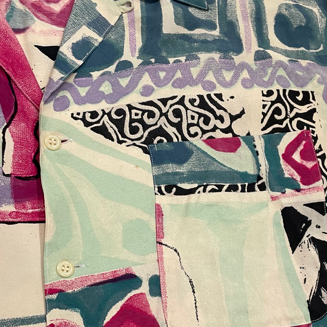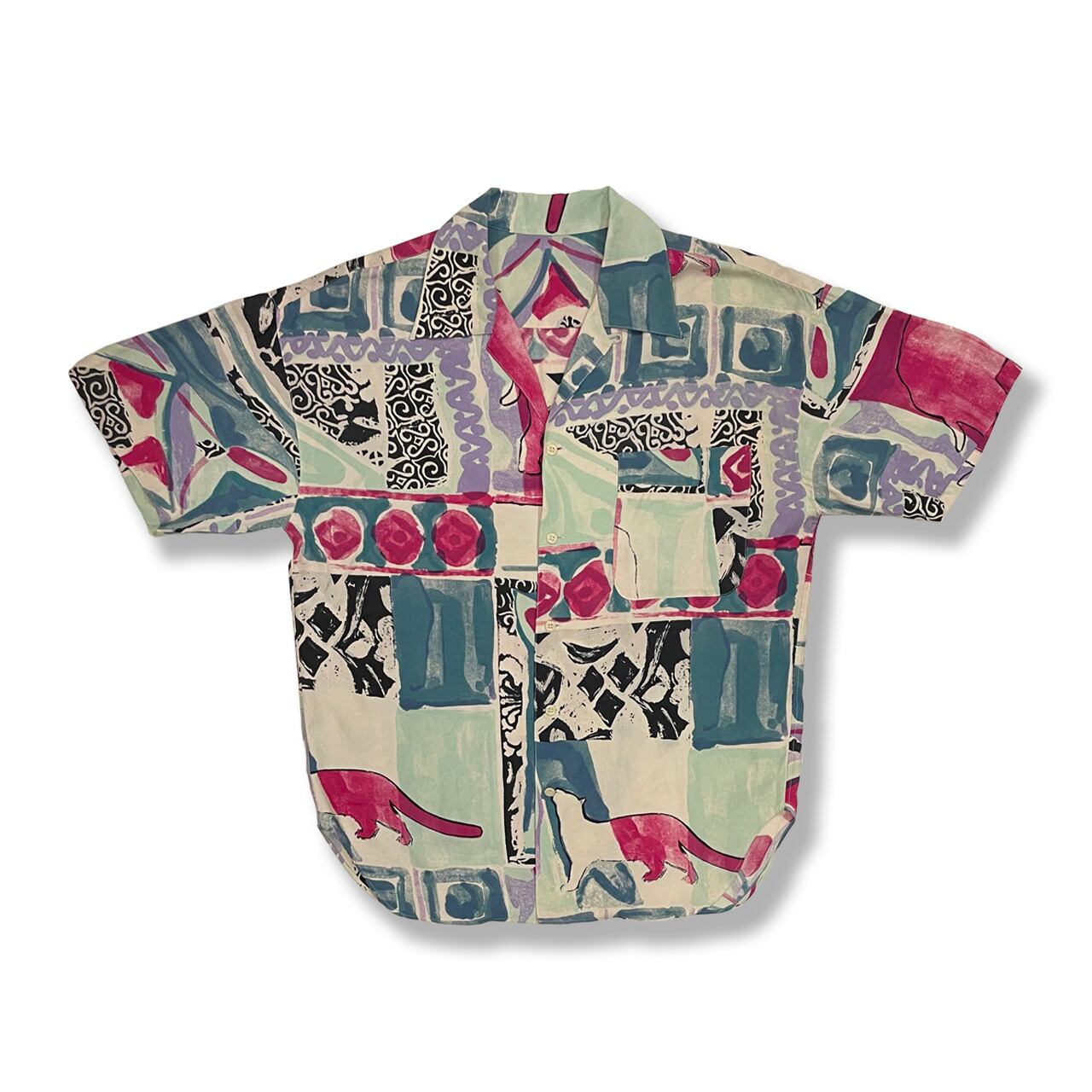 90年代の日本のモノづくりはクオリティが高いです。イタリア製の上品なレーヨン素材に総柄のプリント、綺麗な縫製、特徴的なカッティングなど贅沢な半袖シャツです。