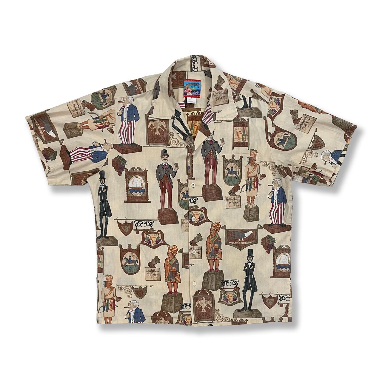 遊び心ある柄でありながら、落ち着いたベージュで大人なオープンカラーシャツになっています。