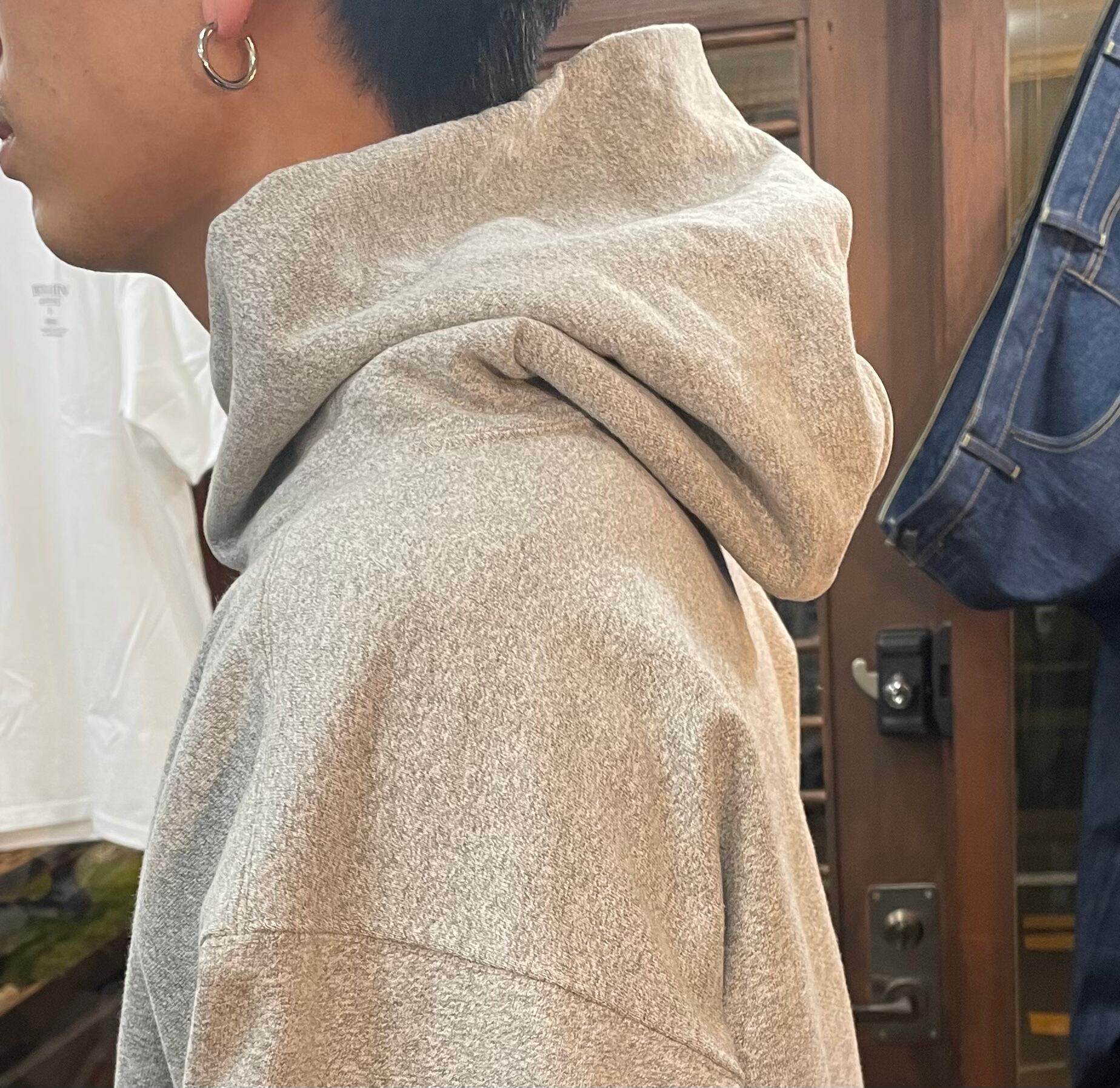 生地は肉厚で、横から見てもフードの立ちがきれいなシルエットになってます。