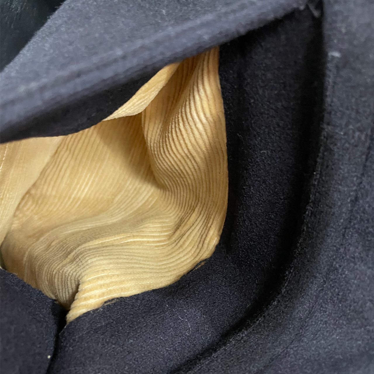 肉厚なメルトンで保温性は抜群。ジャケット袖のパターンのため、肩にしっかりと乗り軽く感じるカッティングが秀逸です。