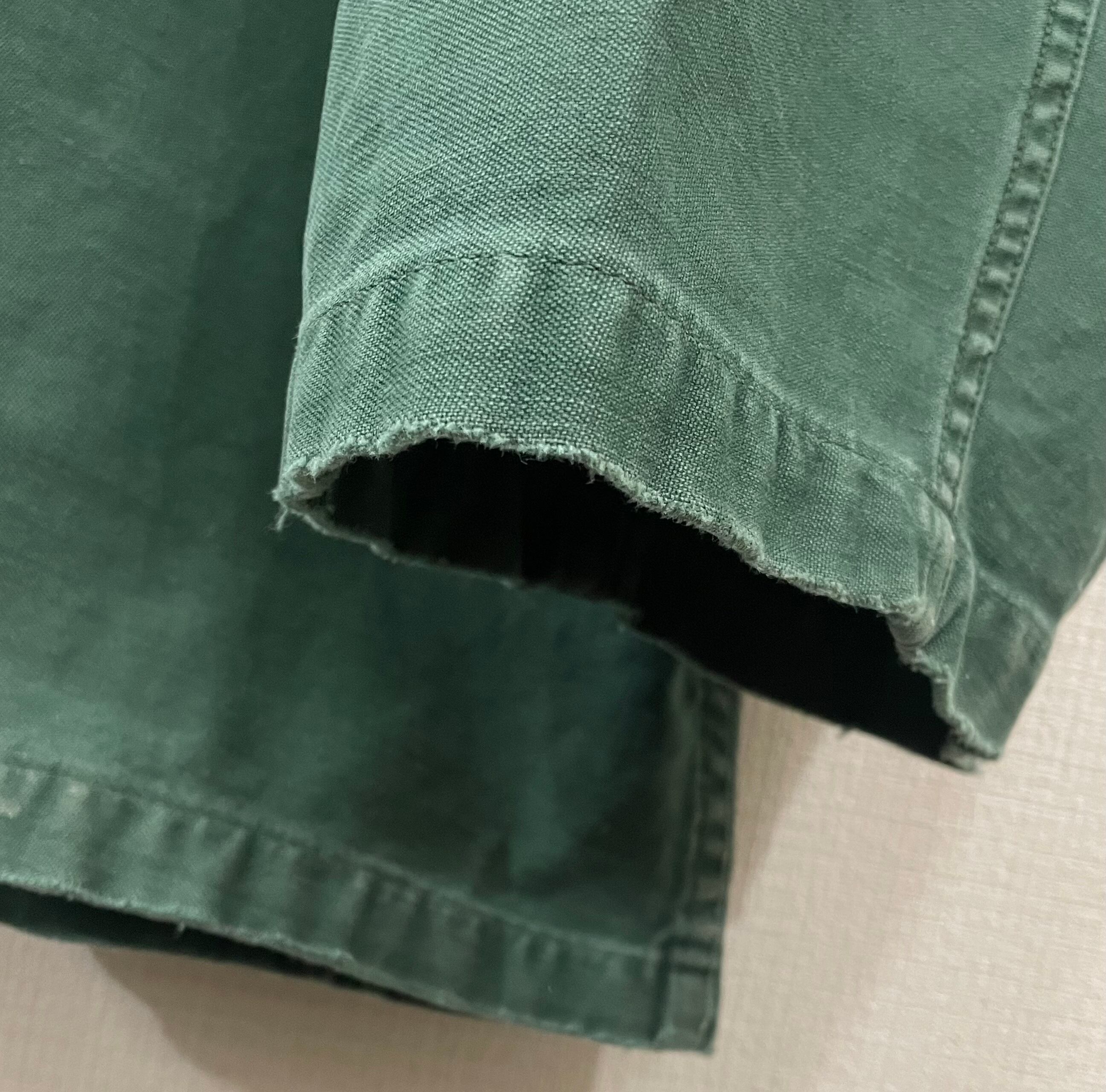 ヴィンテージの珍しいプルオーバーサファリシャツ。綺麗なグリーンの色味でブルージーンズとも相性のいい色合い。シャツでもアウターとしても着れる汎用の高いアイテムです。パーカーと合わせるて着るのが個人的にはおすすめです。