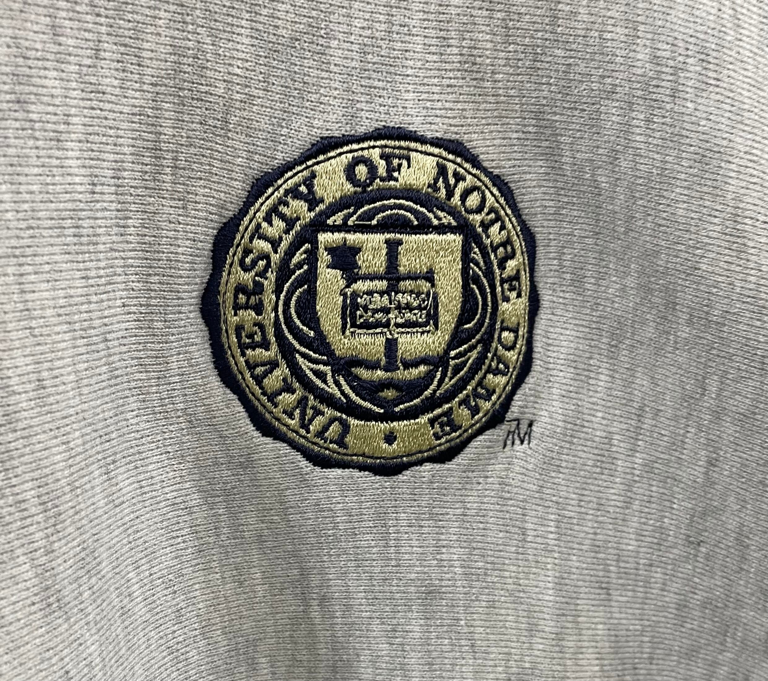 言わずと知れた名作チャンピオンの90sリバースウィーブ。厚みのあるしっかりした生地と細腹リブの唯一無二のトレーナー。今回はノートルダム大学のエンブレムと名前が前後に刺繍された凝ったデザイン。そこまで使用感を感じない、まだまだ活躍してもらえる1着です。