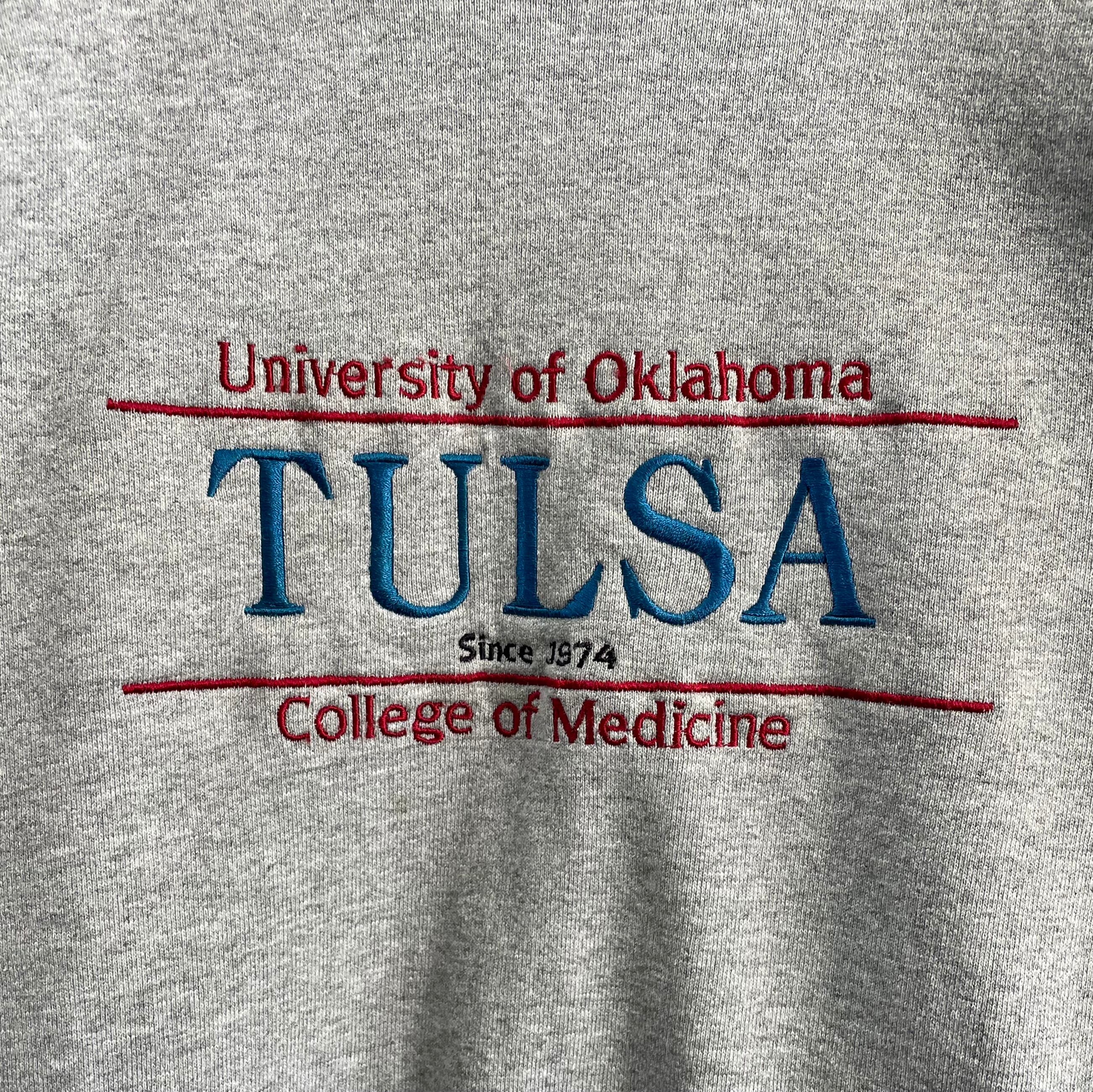 肉厚で着心地の良いフルーツオブザルームの90s SUPPER COTTONスウェット。オクラホマ州にあるタルサ大学薬学部の刺繍が入ったデザイン秀逸な一着。前身・後ろ身にレッドと鮮やかなブルーがバランスの良いデザインです。サイズもXLとゴールデンサイズ。ボディ・刺繍ともに品のある90sグッドレギュラーなスウェットシャツになってます。