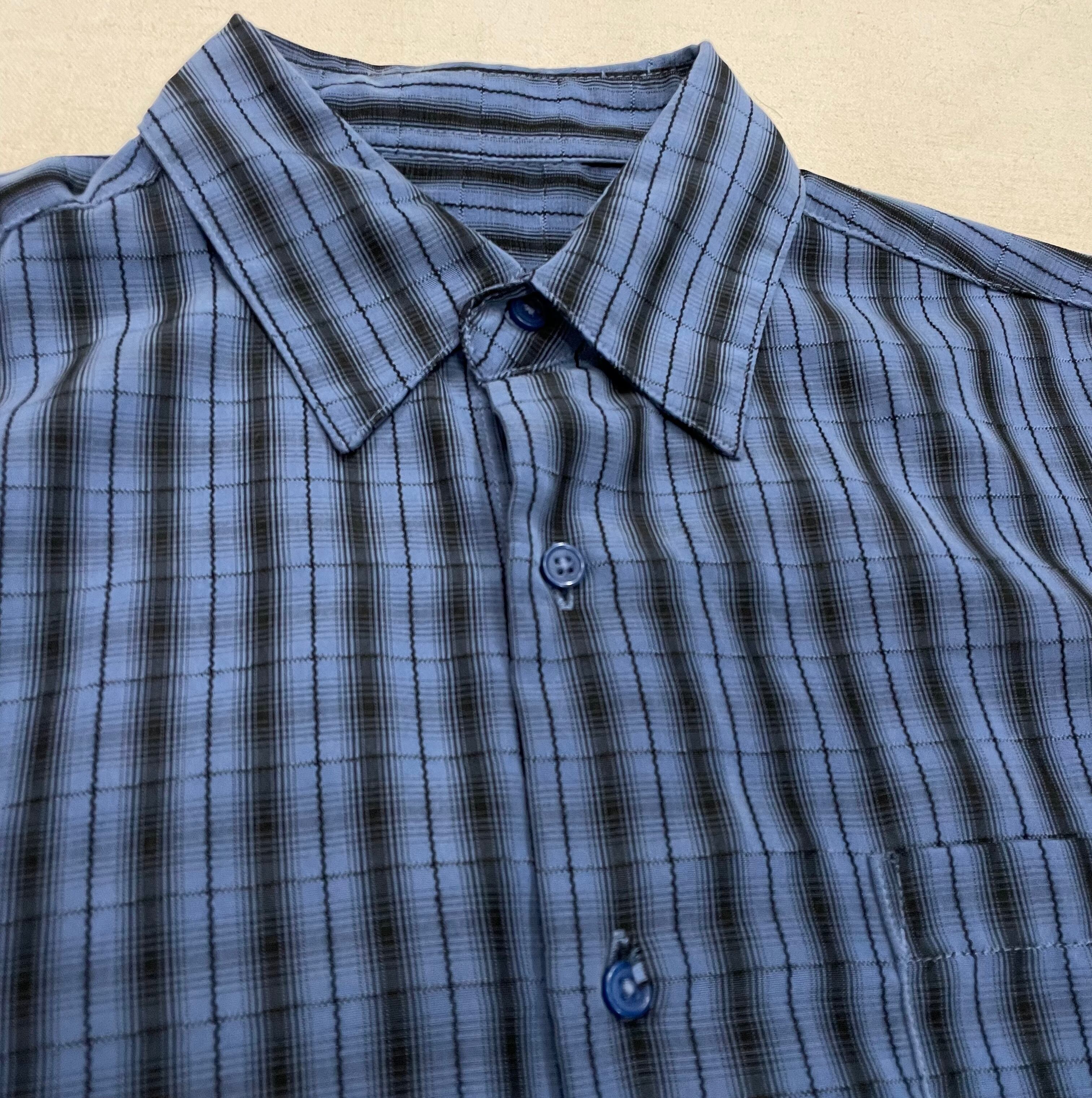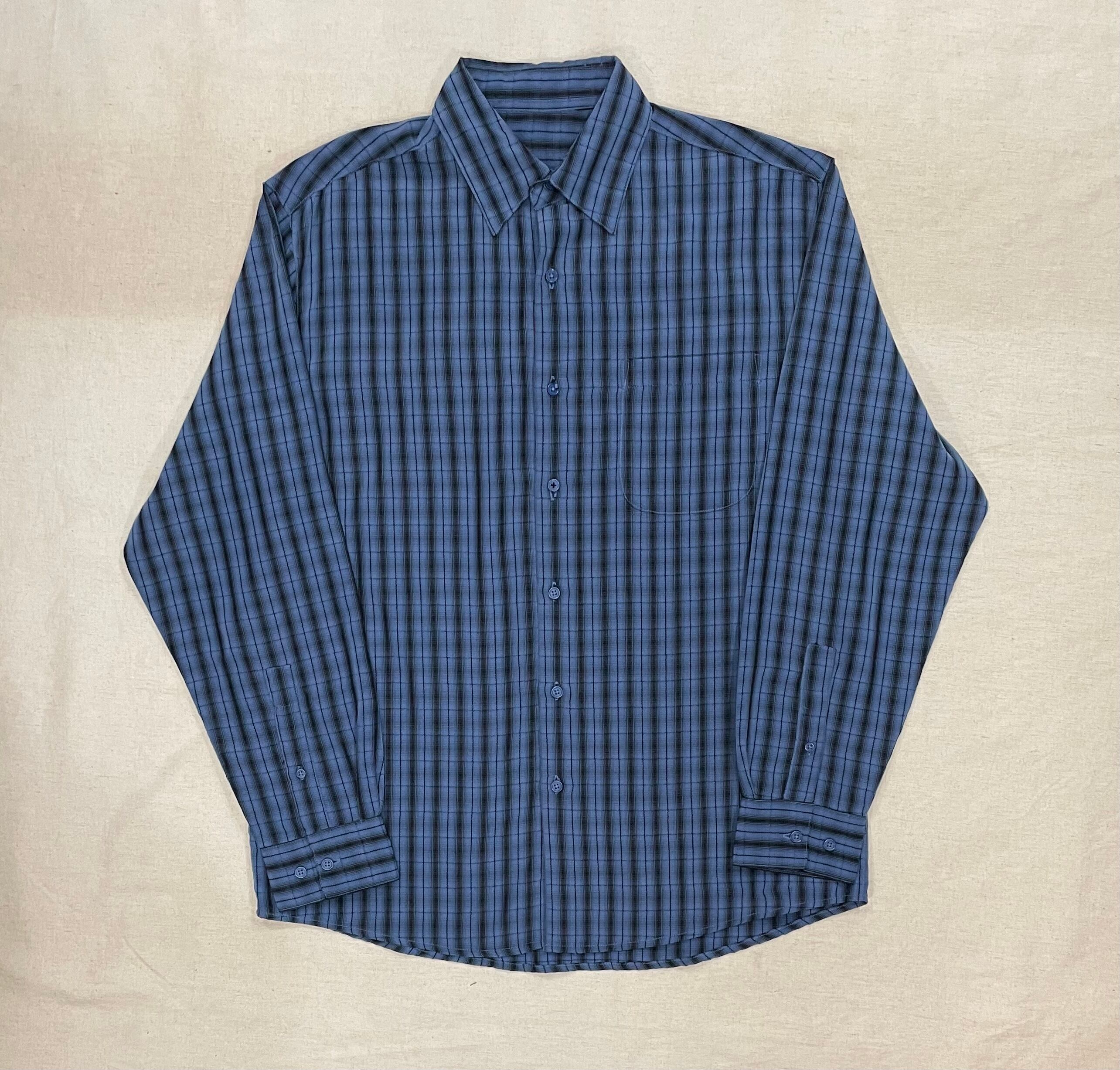 落ち着いたチェック柄のコットン・ポリエステルシャツ。ブランド。年代は不明ですが、綺麗な縫製でありそうでない柄がレギュラー古着っぽく当店の仕入れならではの1着です。大きめのサイズでバサッと羽織って様になるアイテムです。