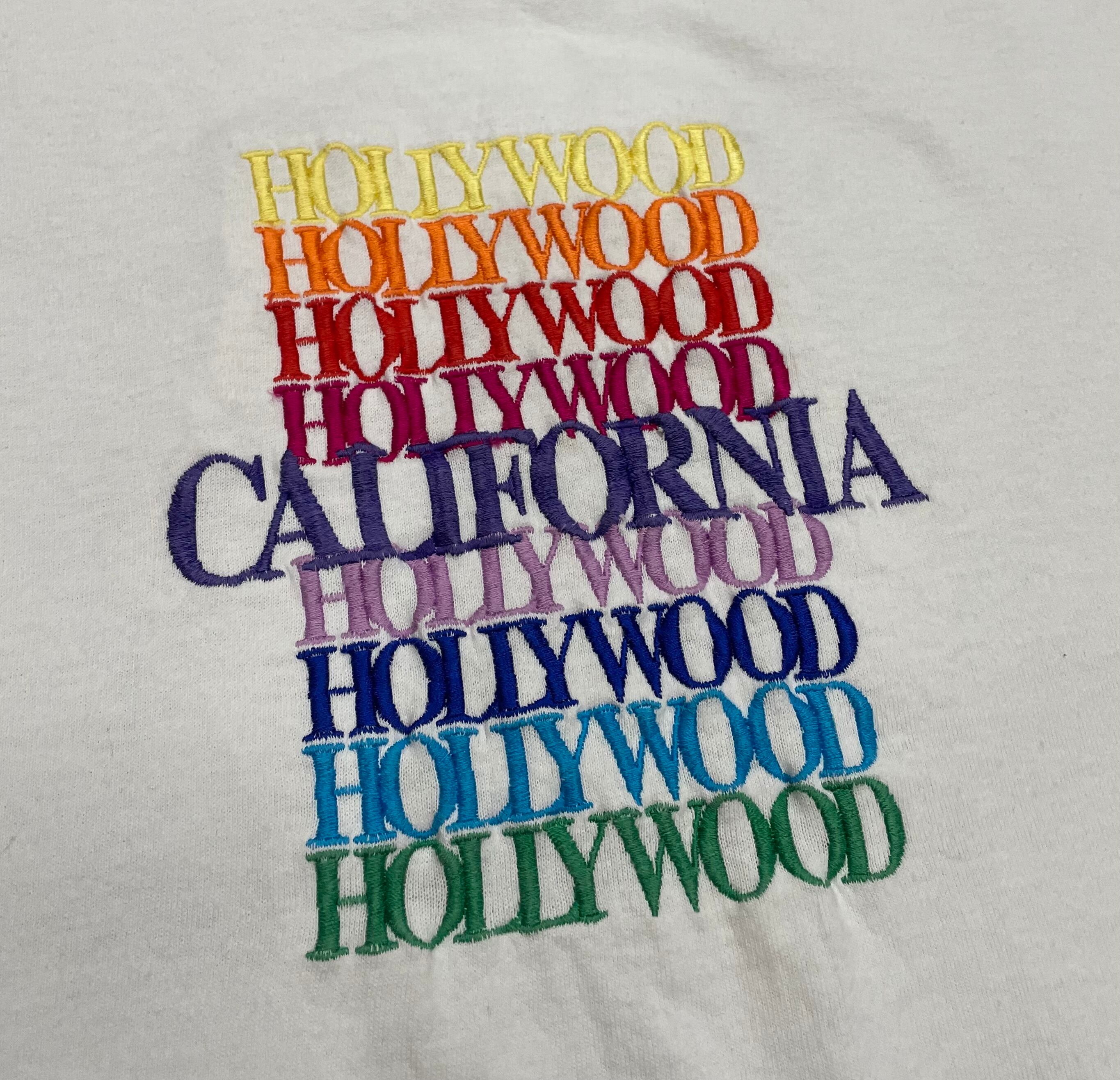 カラフルなHOLLYWOODとCALFORNIAの刺繍が入った90sTシャツ。華やかな色合い、多色で高級感のあるこれぞヴィンテージと感じさせてくれる一着です。個人的に今季1のgood designと思っております。この機会にぜひ。