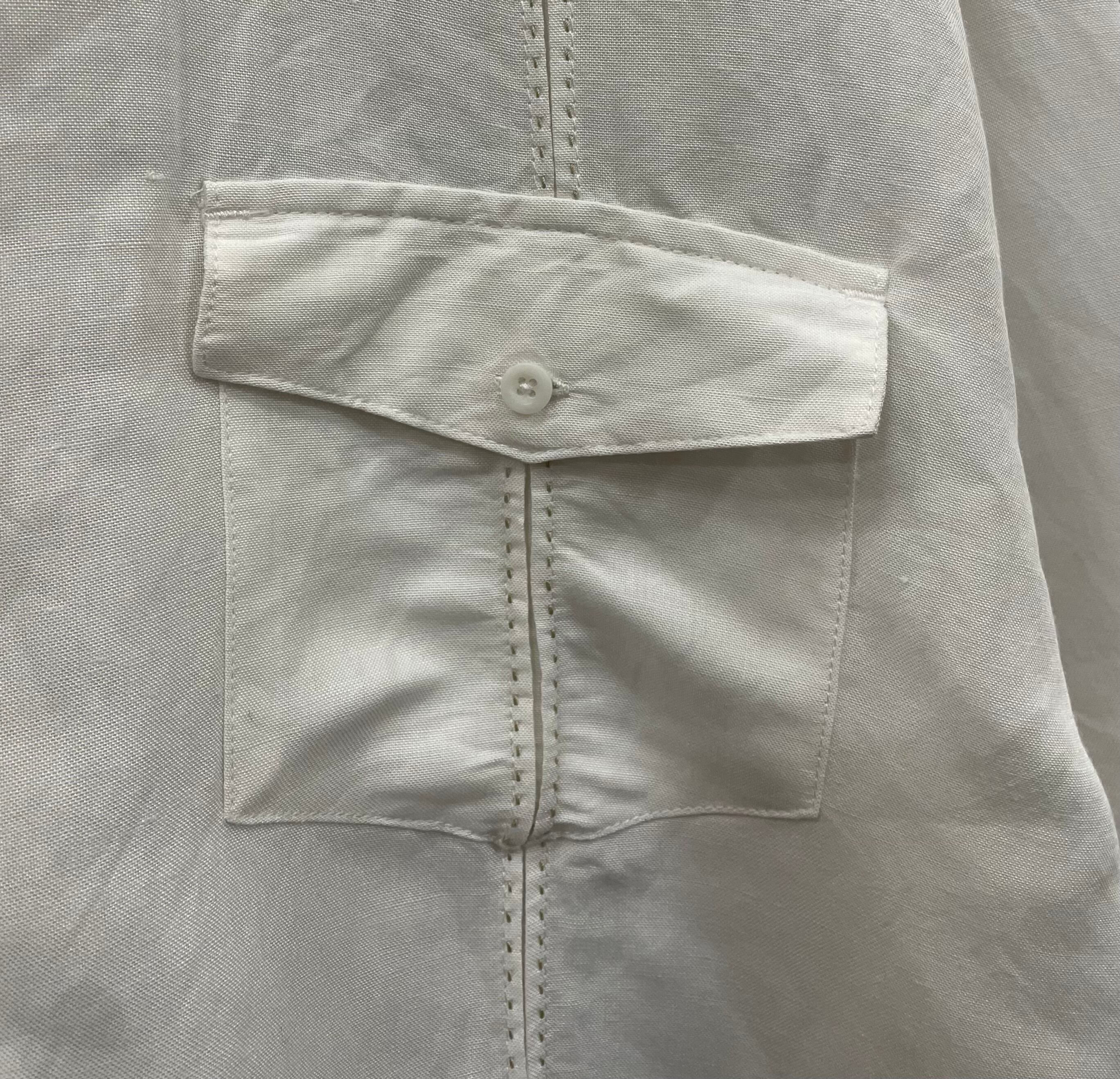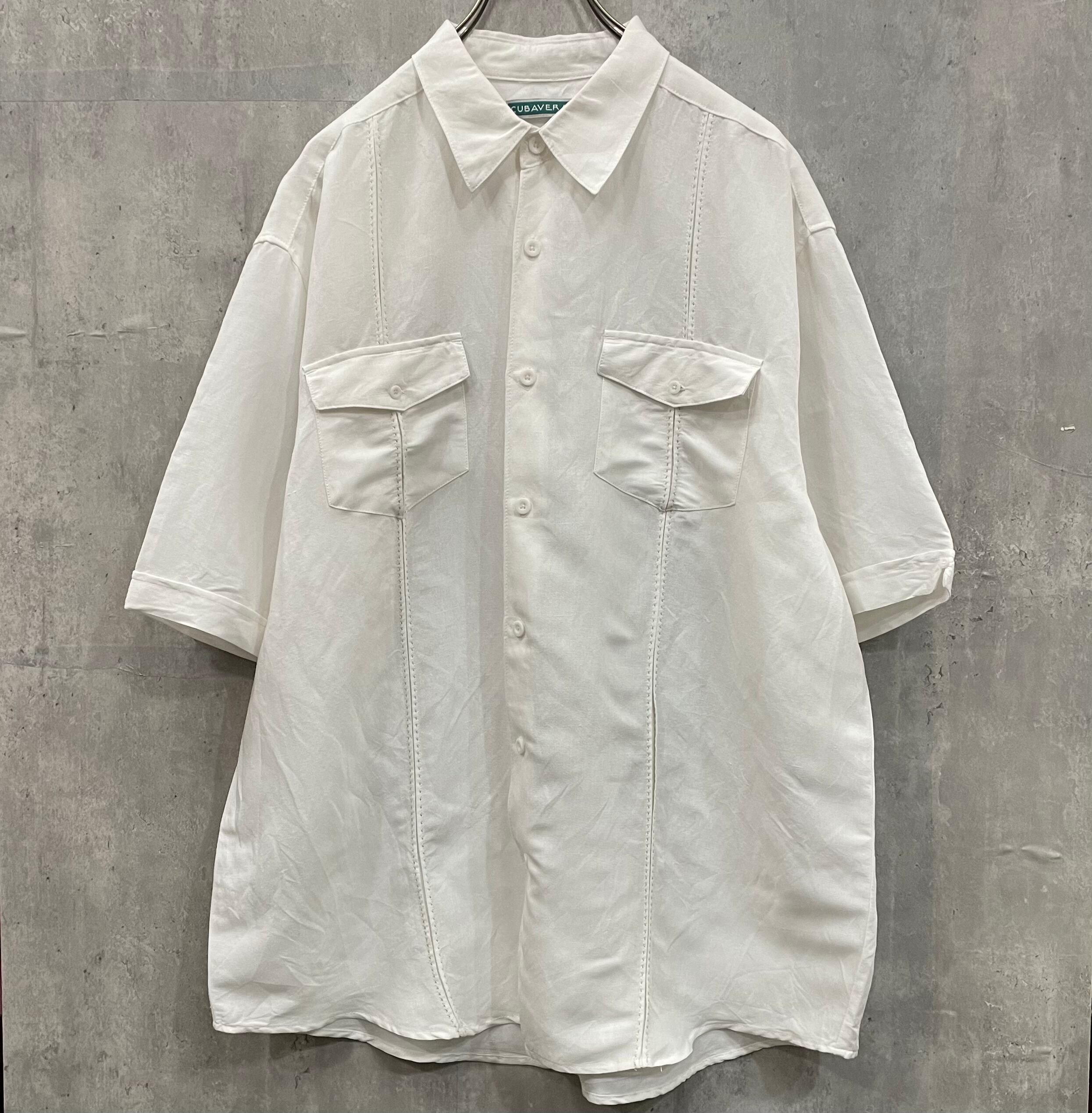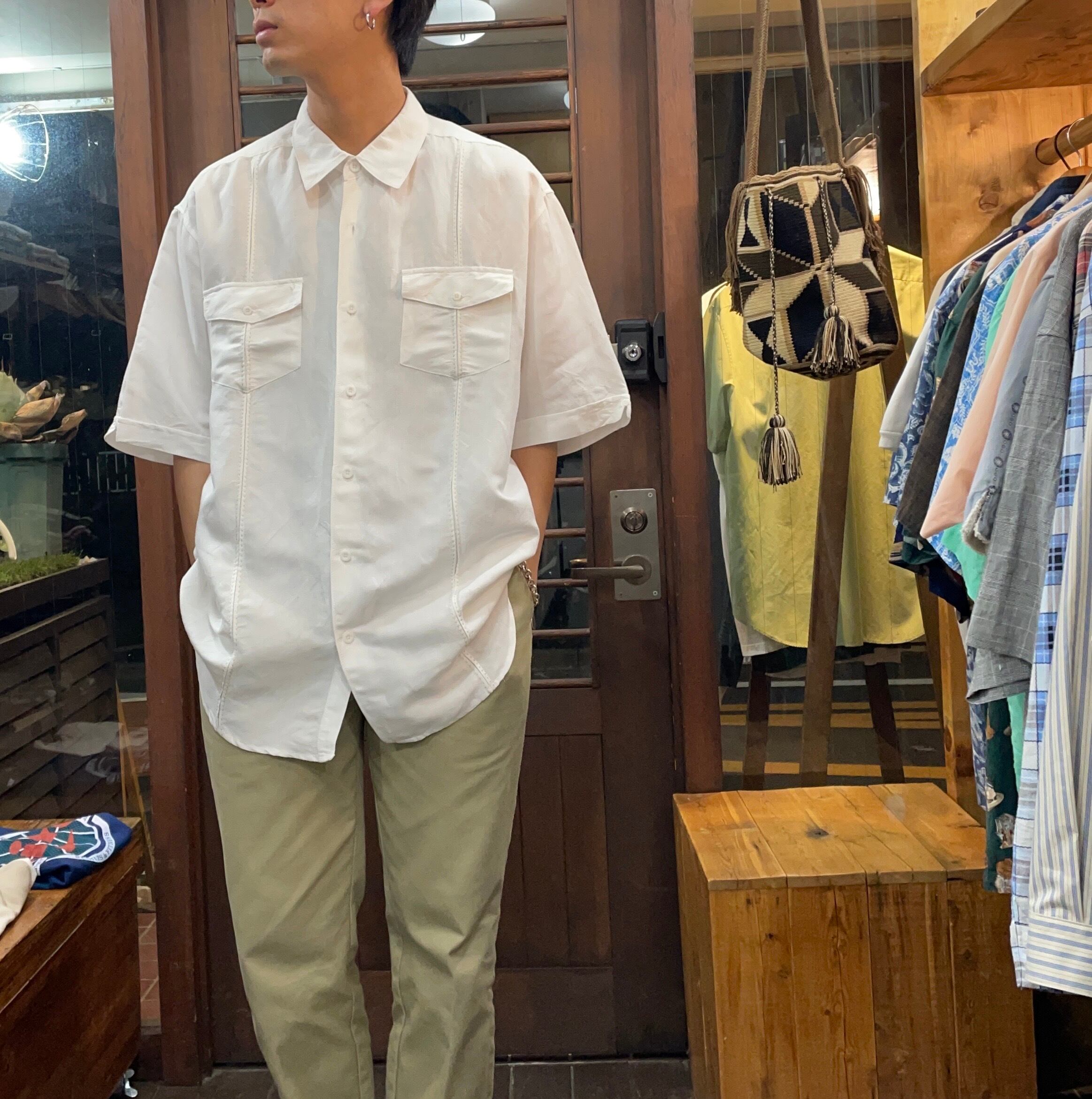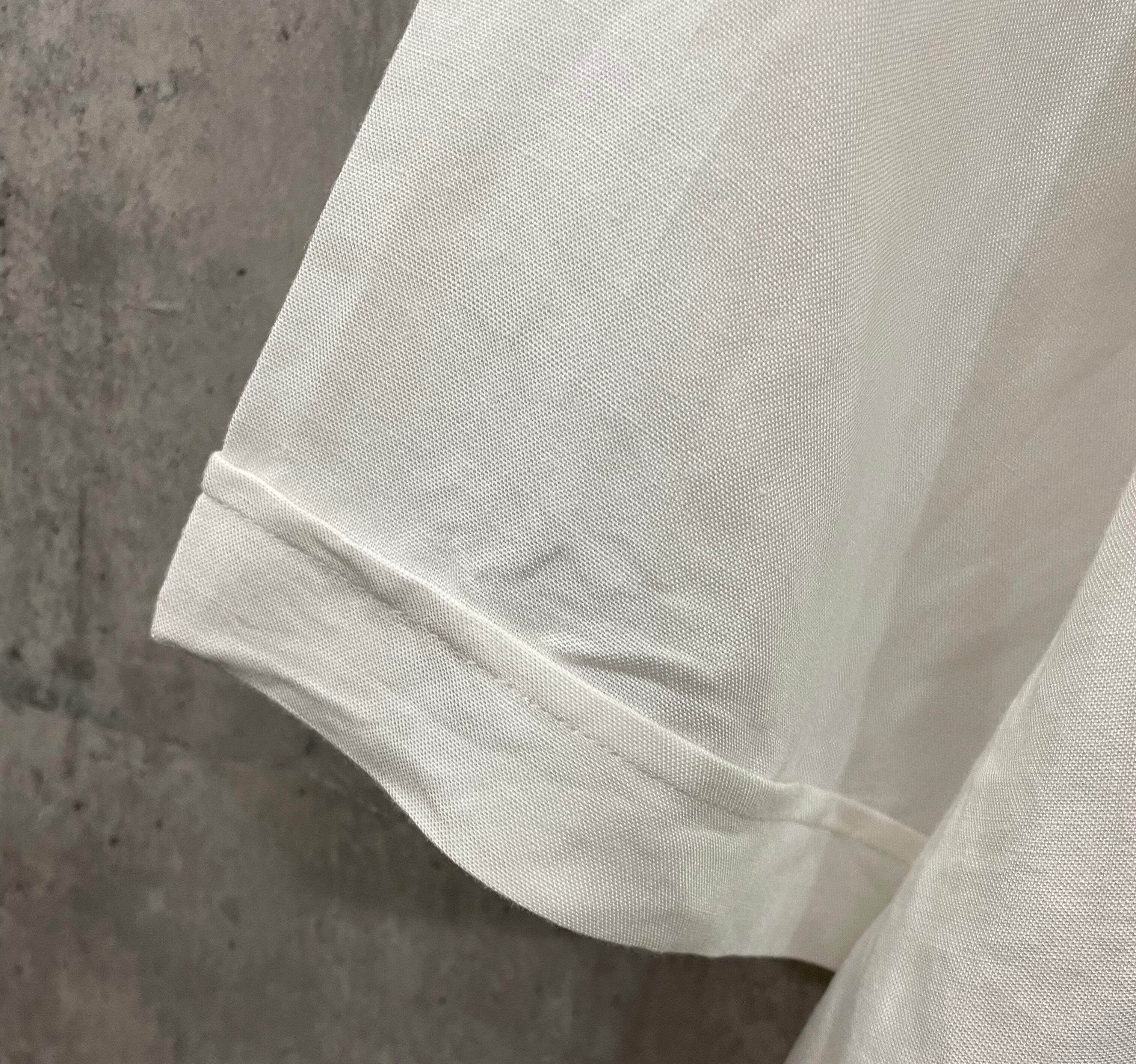 野暮ったさを取ったキューバシャツ。ステッチなどデザインは非常に凝ってます。麻とレーヨンの生地でドレープ感がありながらシャリのあるサラッとした素材で気持ちのいい肌感触。