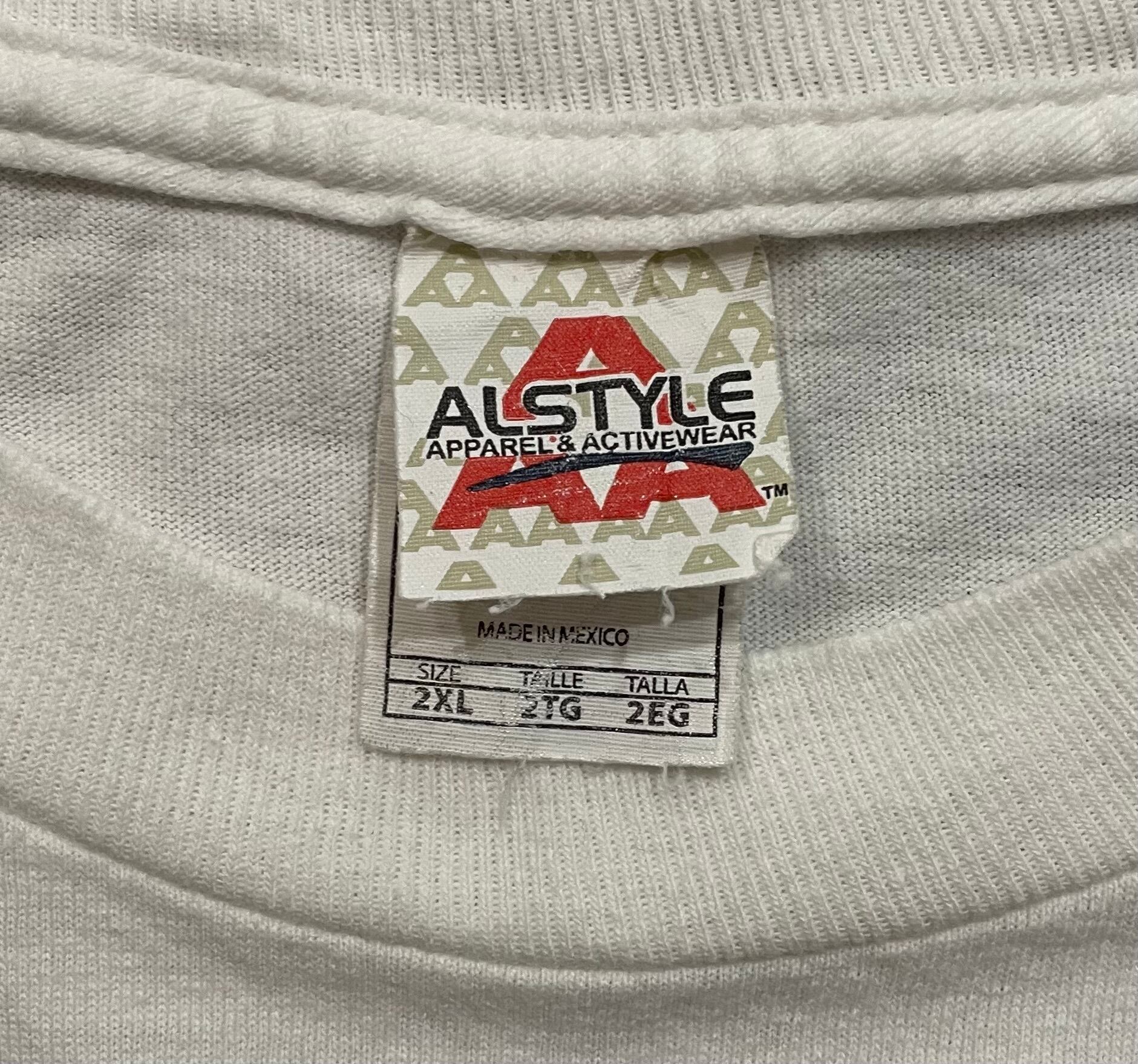 非常に攻めたプリント柄になっています。ヒップホップ好きやカルチャー好きの方におすすめの1着。がさっとした古着ならではの風合いのあるボデイです。着丈が丁度いい丈で身幅広めの着やすいサイズ感です。