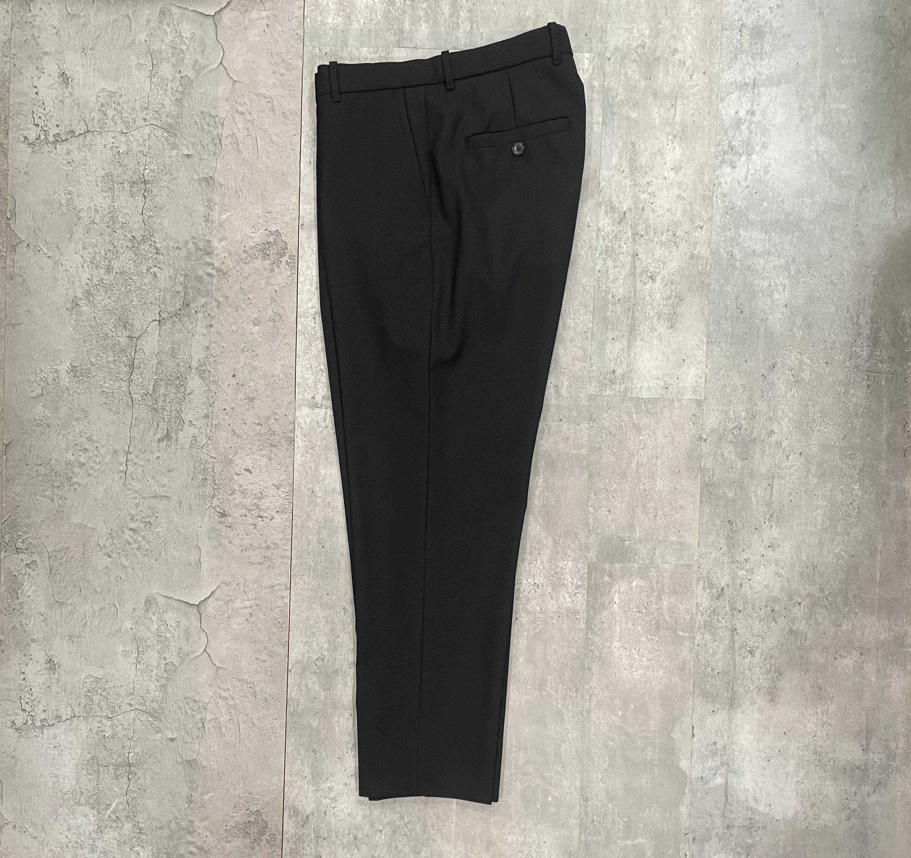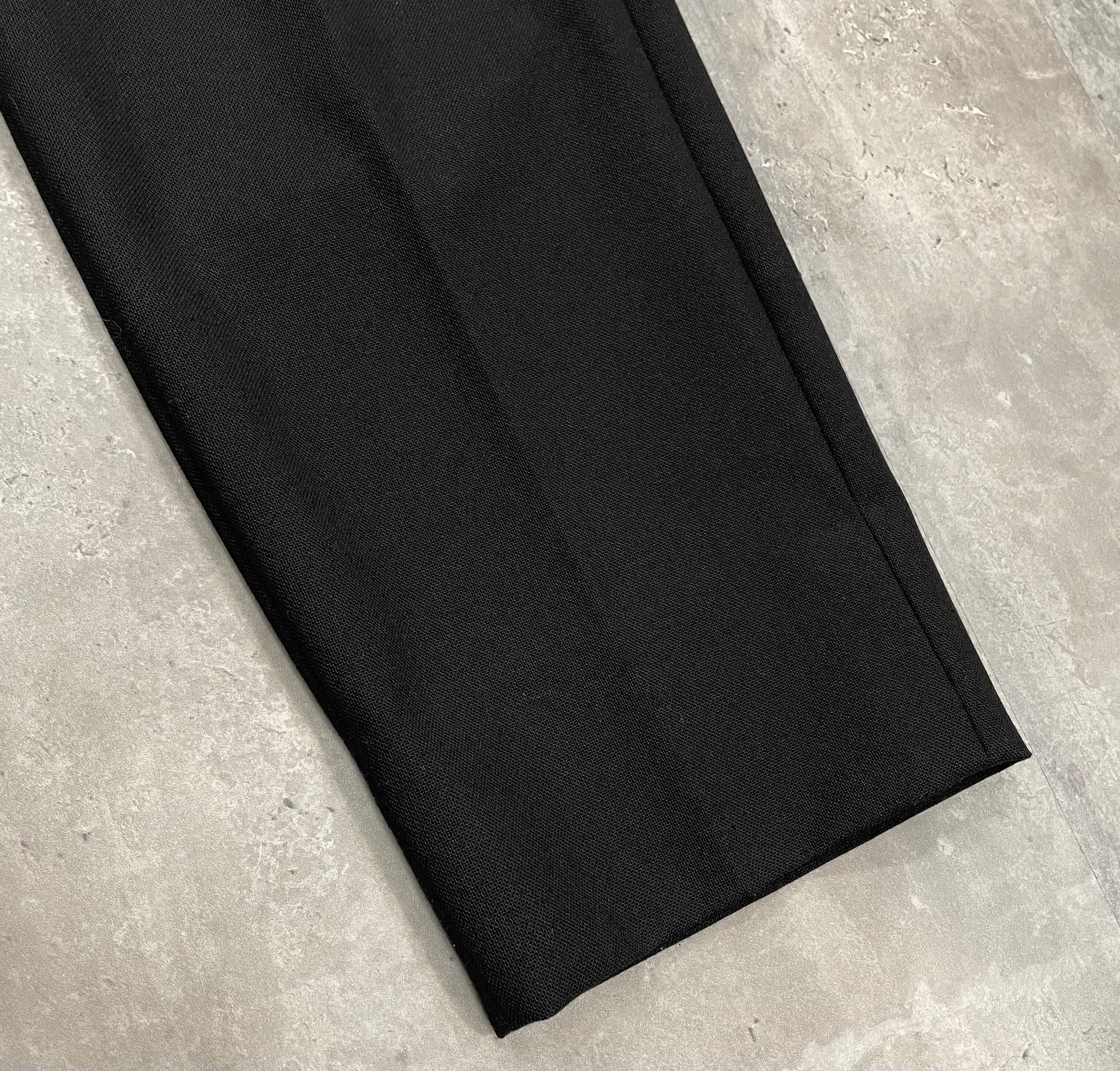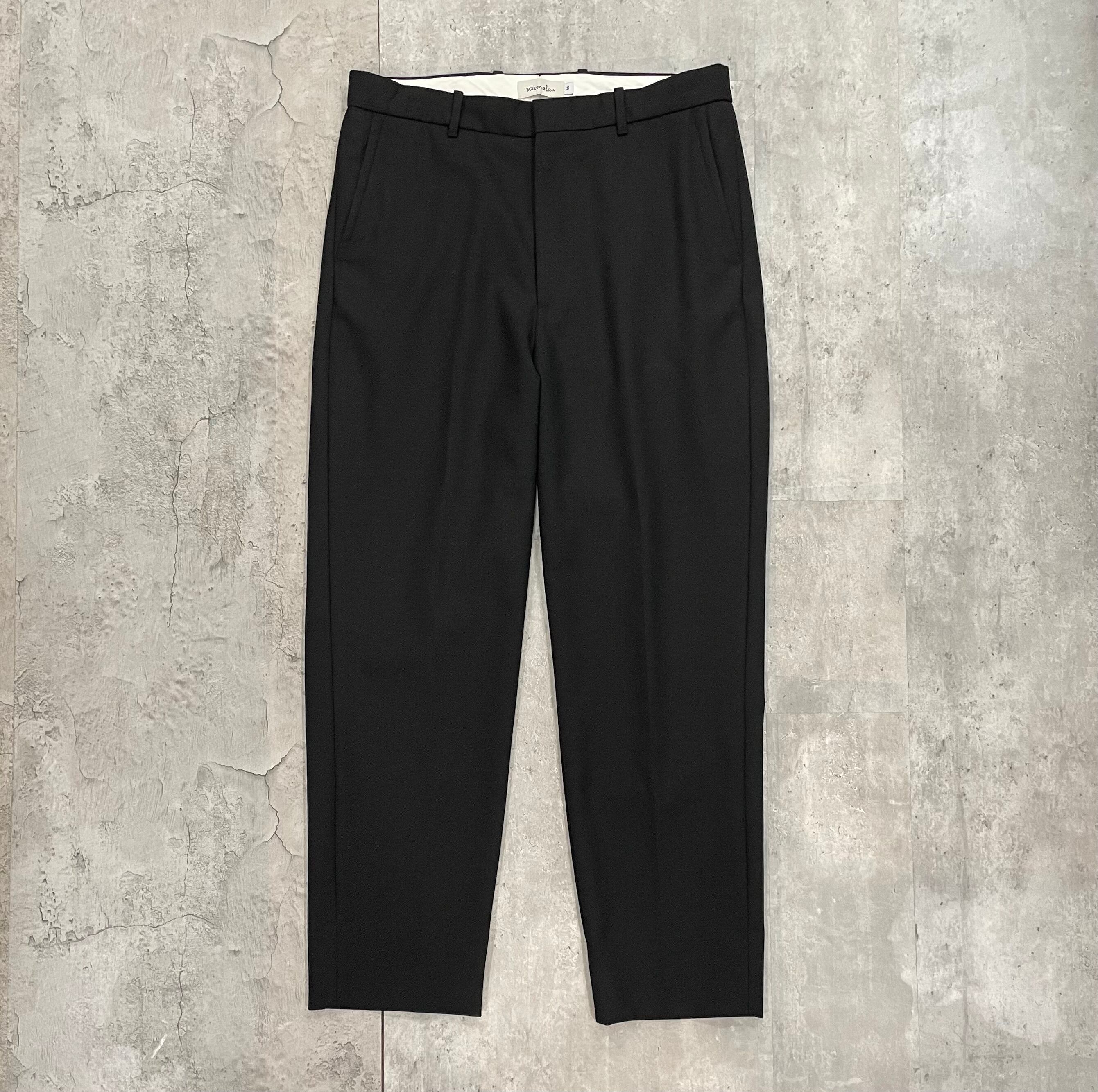 スティーブアランのノータックスラックスパンツ。素材はウールとポリエステル混紡のオールシーズン履ける厚みです。テーパードシルエットで綺麗なカッティング。ドレッシーにもカジュアルにも合わせられる汎用性高いスラックス。持っていて損のないアイテムです。