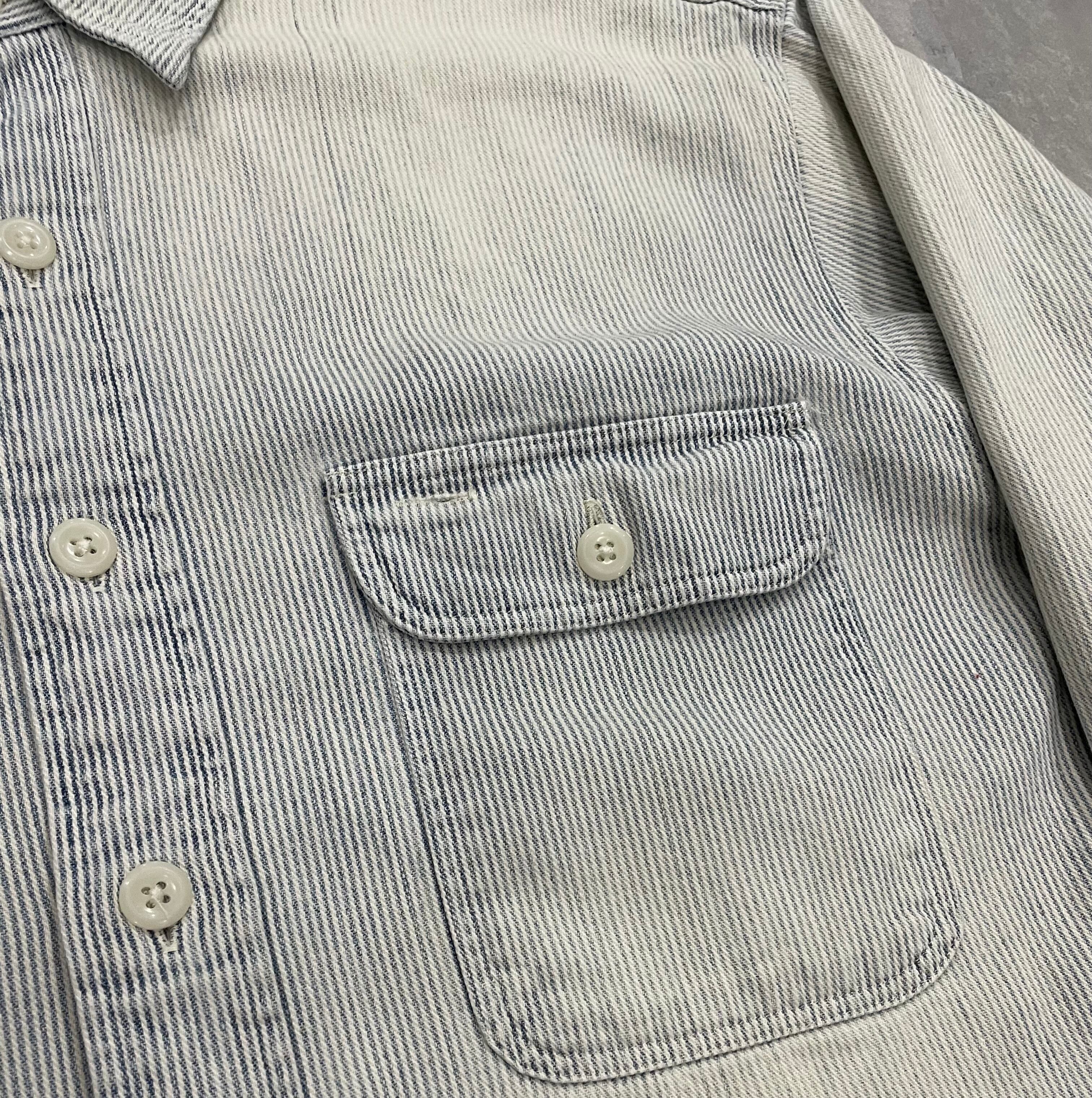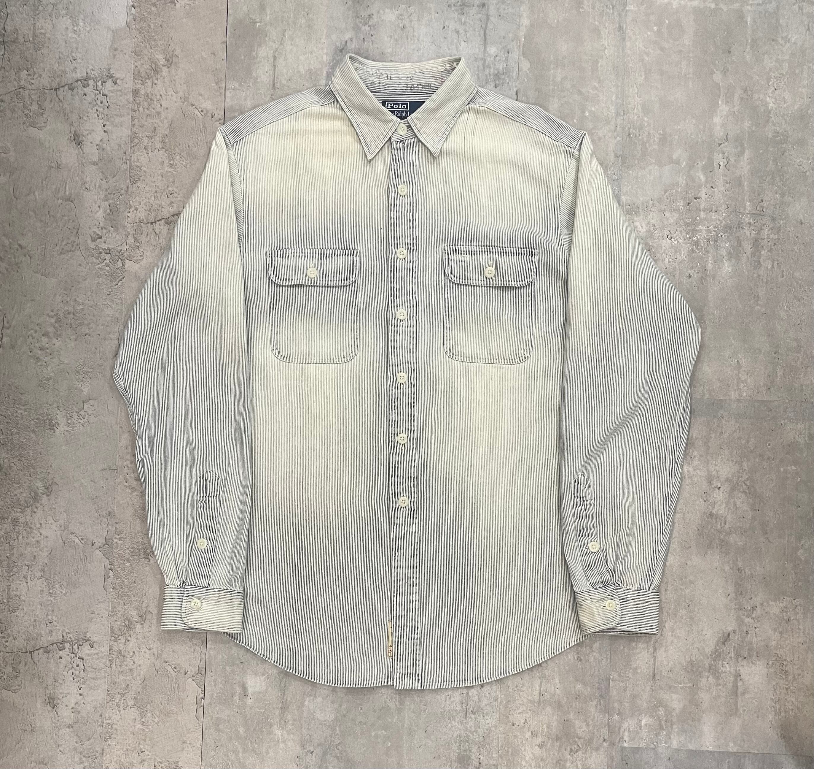 ヒッコリーデニムを加工したラルフローレンらしいワークシャツ。使用感や日焼けのようなヴィンテージっぽさが自然で加工のこだわりは流石ラルフローレン。オンスはやや厚めでシャツとしては、もちろんアウターとしても長く使えるアイテムです。ハイクオリティのデニムシャツをこの機会にぜひ。