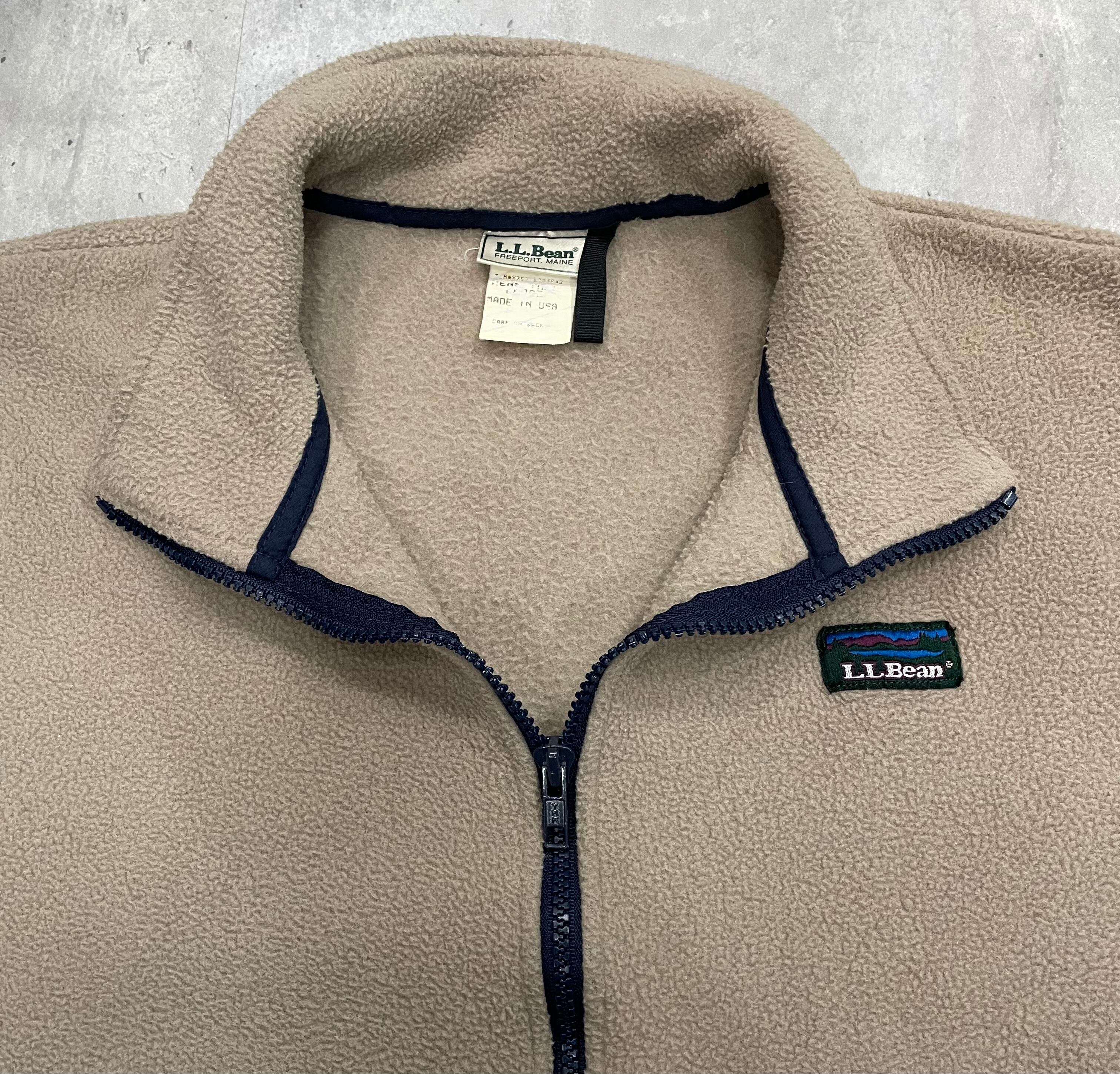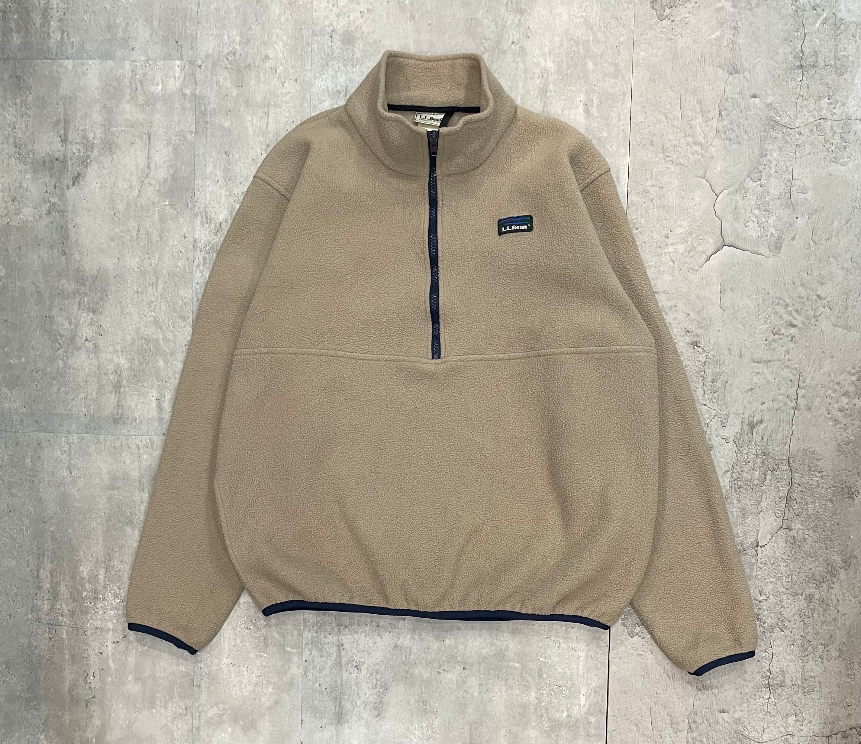 LLBEAN80sフリースプルオーバー。王道のベージュ色にネイビーのパイピング。フロントジップのプルオーバータイプでアウター、インナーどちらもコーディネートしやすいアイテムです。80sの物と思われますが、状態も良好です。
