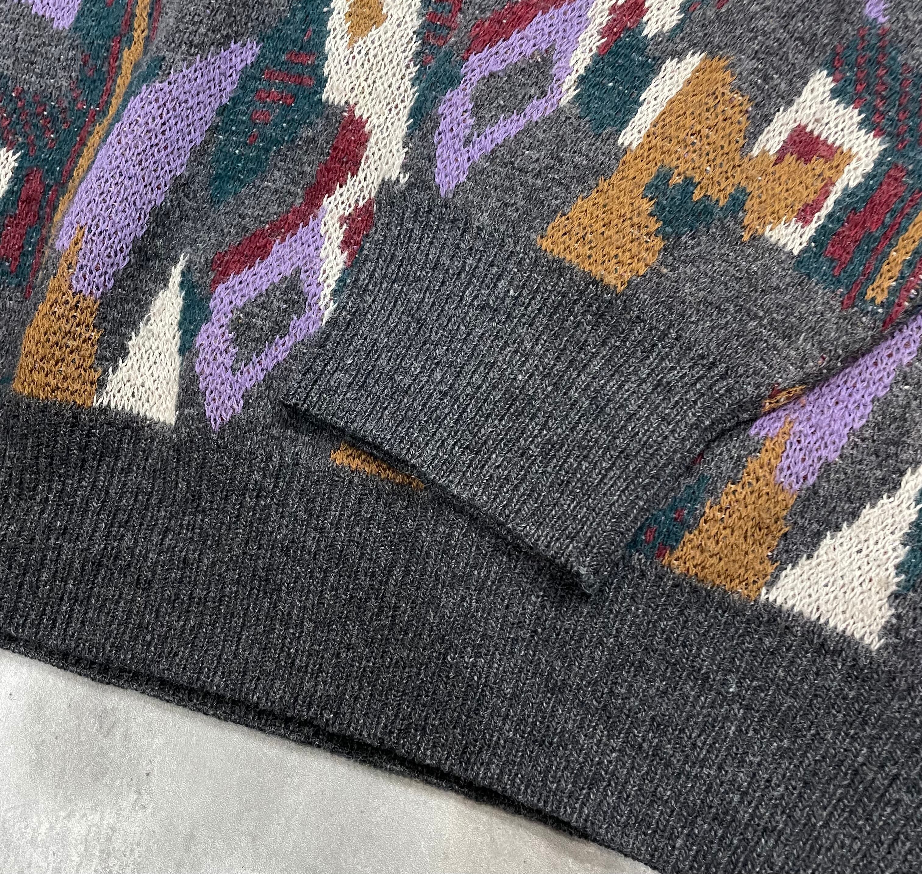 イタリア製のジャガードウールニット。ウール100%で保温性は抜群です。柔らかくチクチク感の少ない上質な編み上がりになってます。レトロありながら、品のある柄で大人にコーディネートができます。肩幅、身幅が大きくゆったりと洒落たシルエットです。