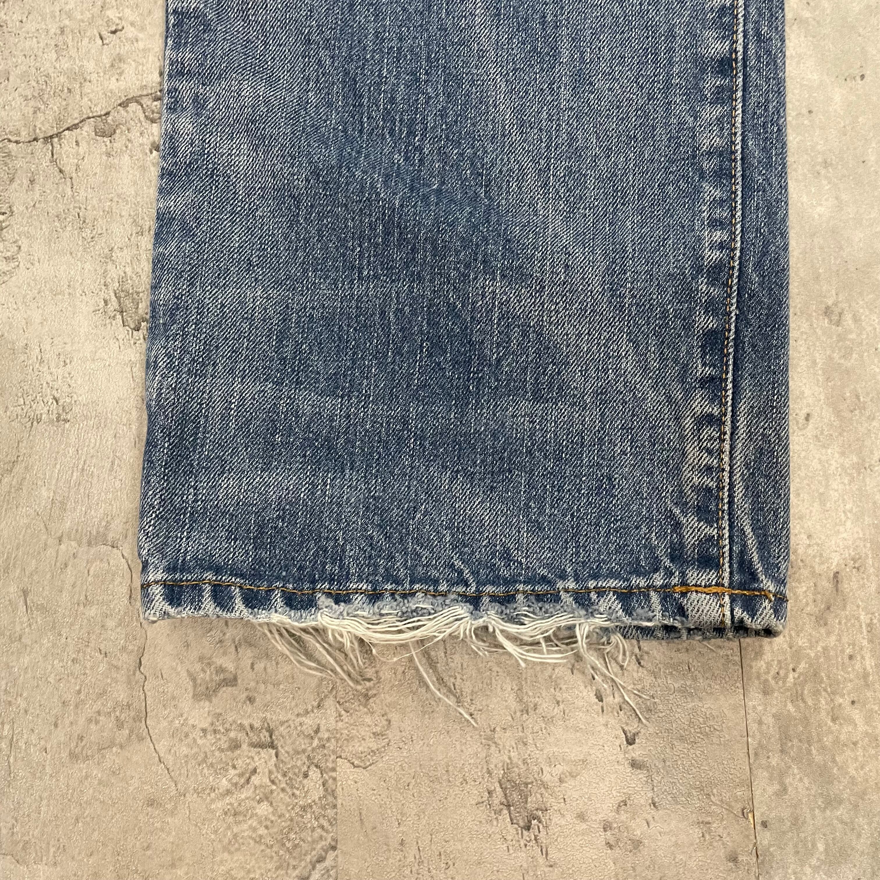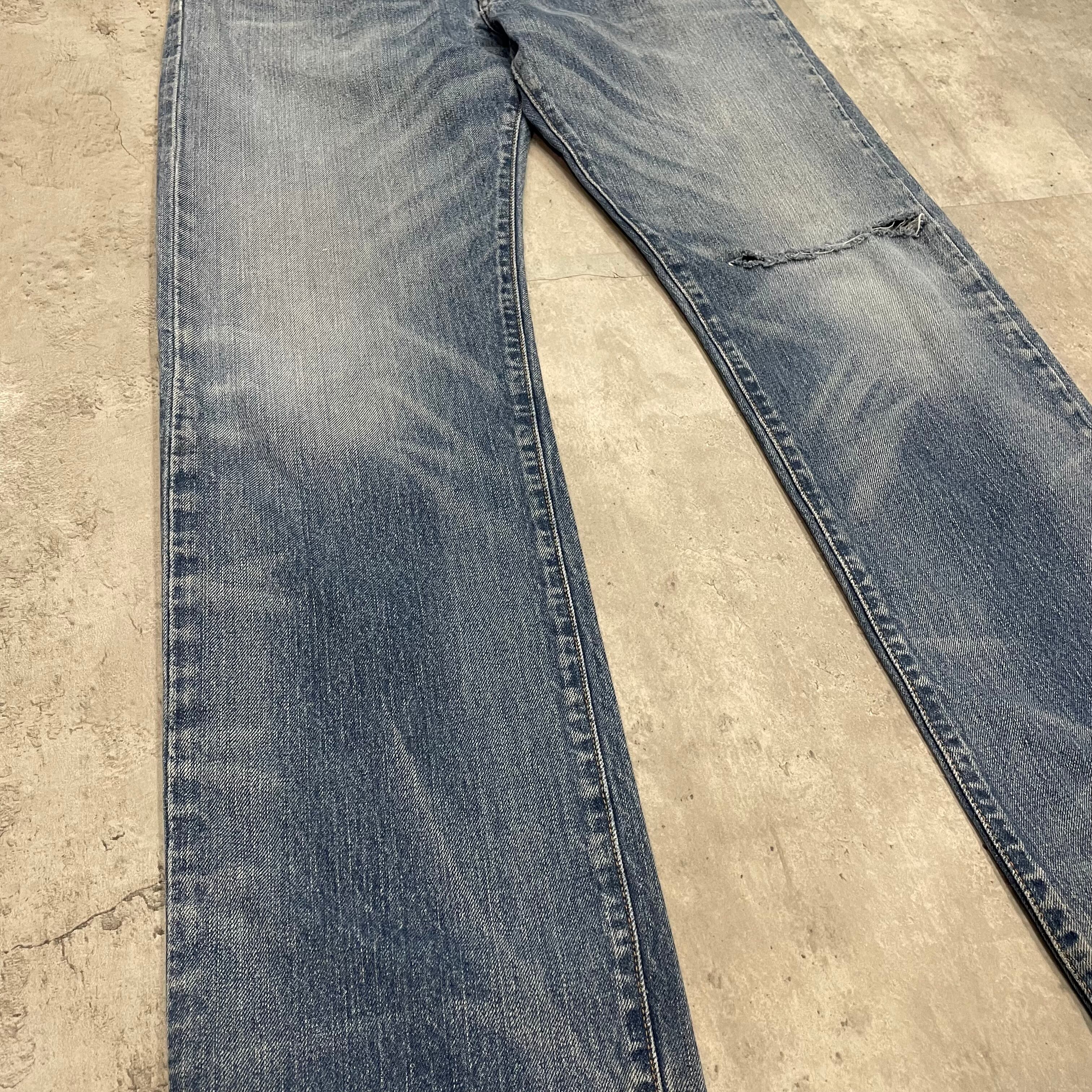 POLO RALPHLAURENのメキシコ製ダメージデニムパンツ。程よいベースの色落ち、ヒゲ、ハチノス、ダメージが入っておりラルフローレンなのにグランジ感のある1着になってます。革パッチや刺繍、スレキプリントも入っておりクオリテイの高い1本になってます。細すぎず太すぎない合わせやすいシルエット。カーディガンとコーディネートにお勧めです。