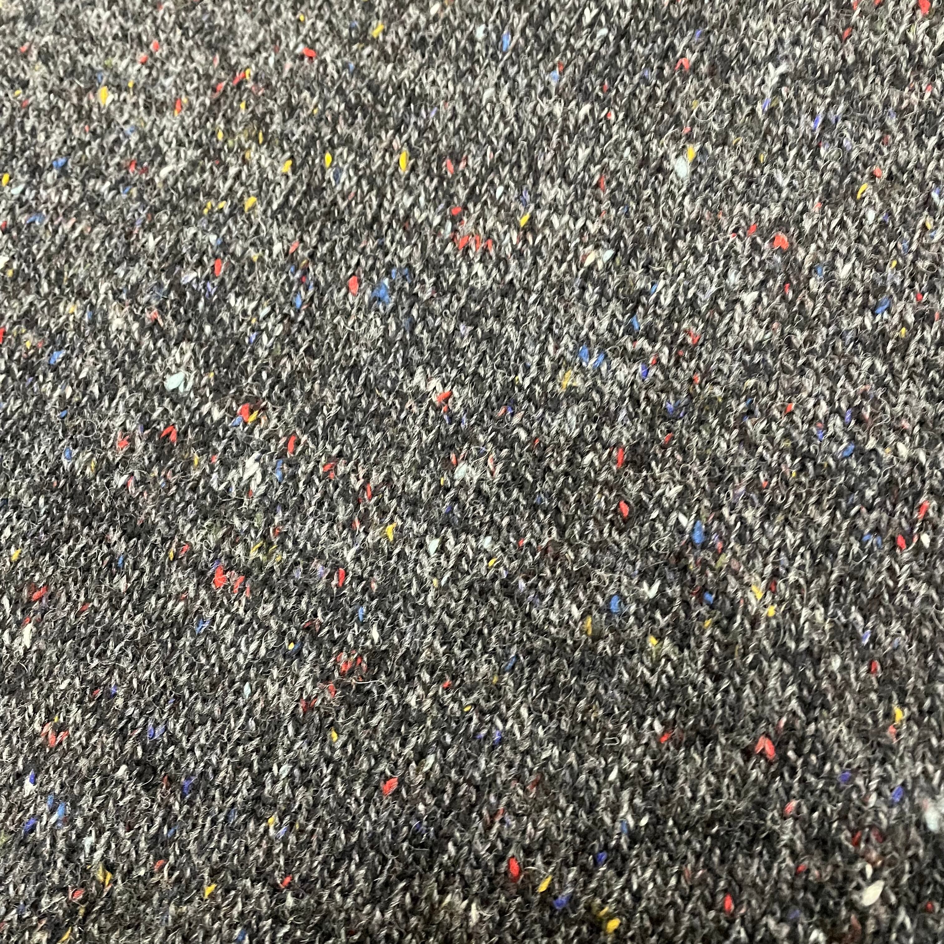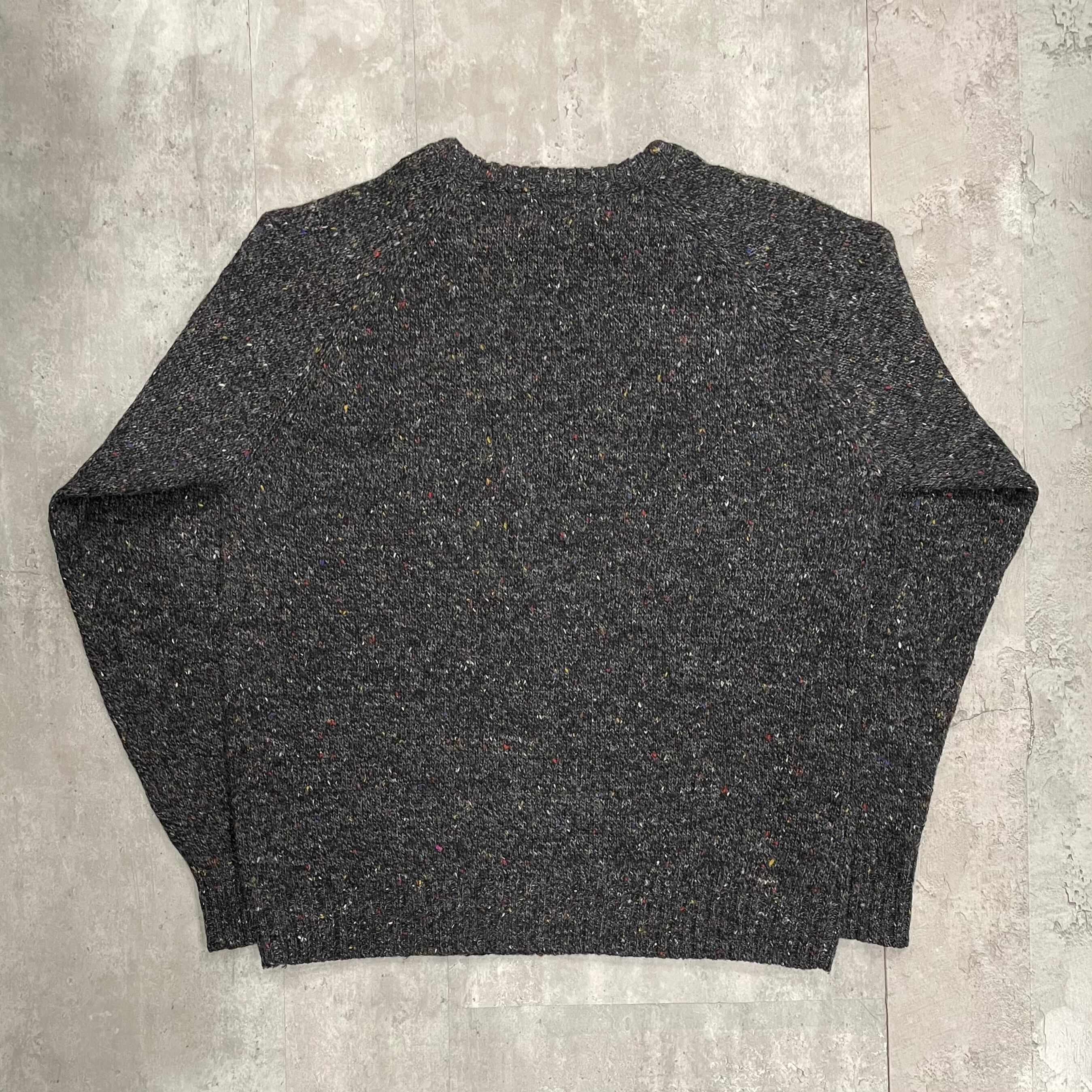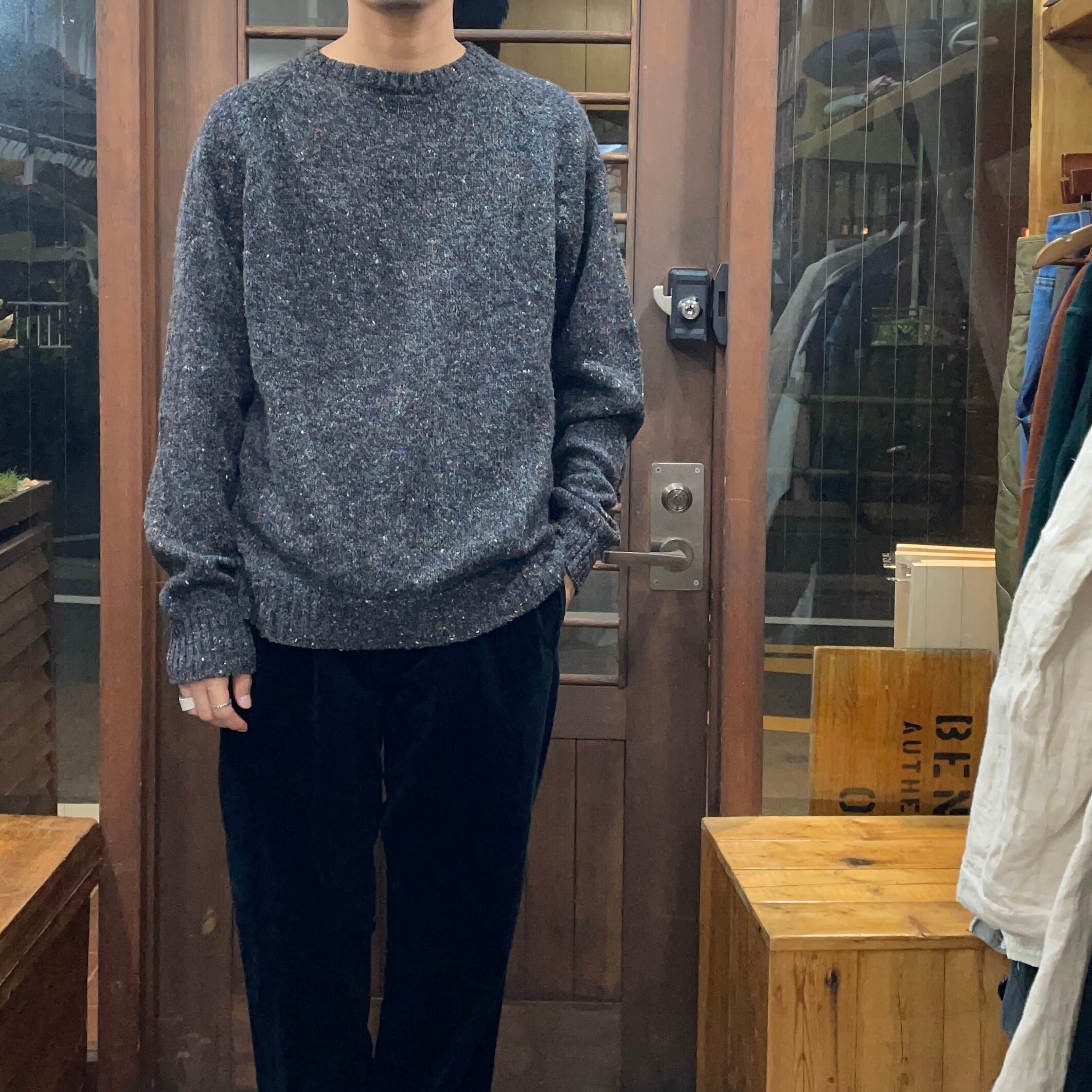 無地だと個性がなく、柄だと派手に感じてしまい選ぶの難しいクルーネックセーター。今回入荷のものは、よく見ると赤、青、黄、白などの色が入った遊び心のある糸で編まれ、大人かつ個性的に着れるラグランニスリーブセーターです。厚すぎない生地感でゆるっと着るのがおすすめです。ウール70%の混用率のため保温性もあります。個人的にも大好きな古着の良さが詰まったアイテムです。