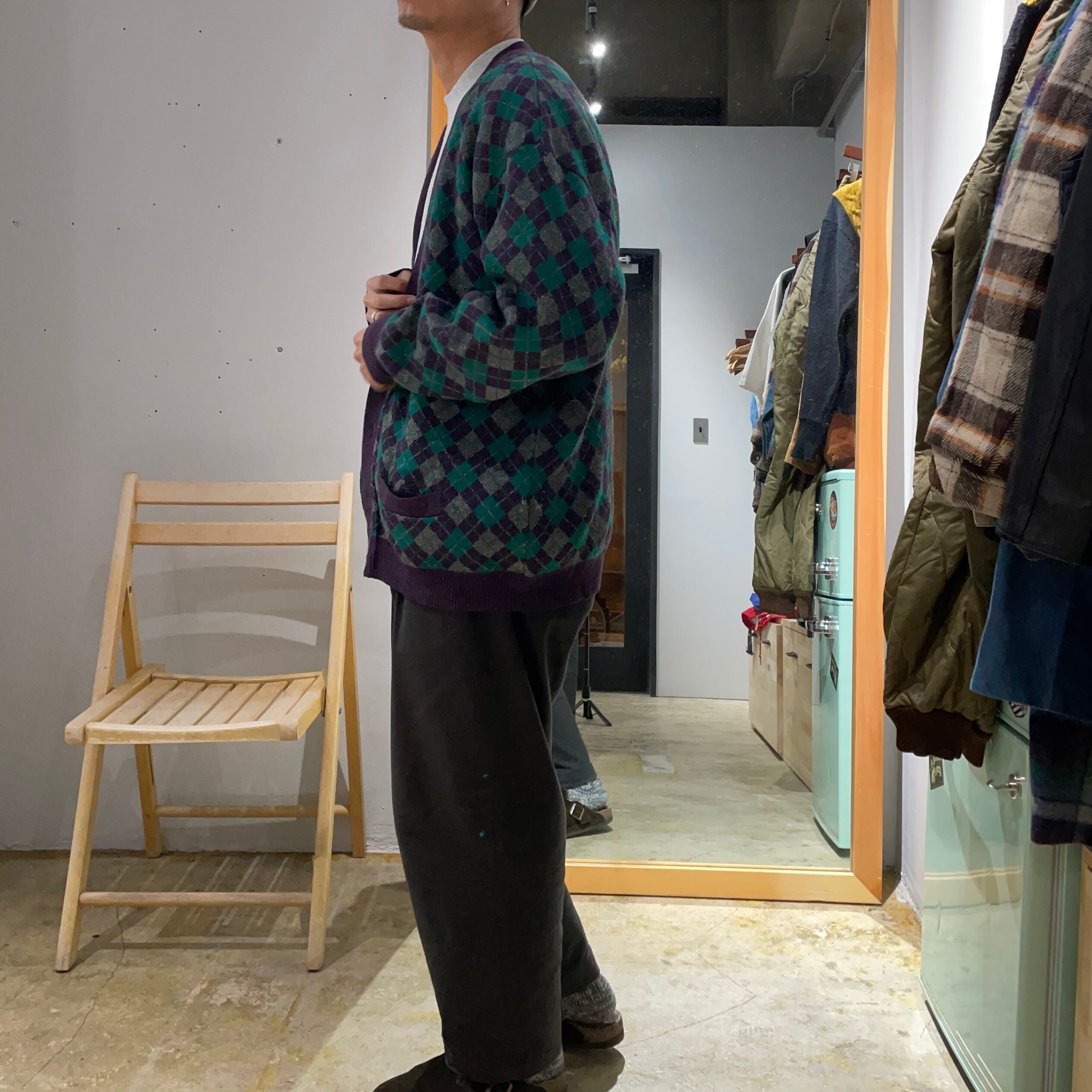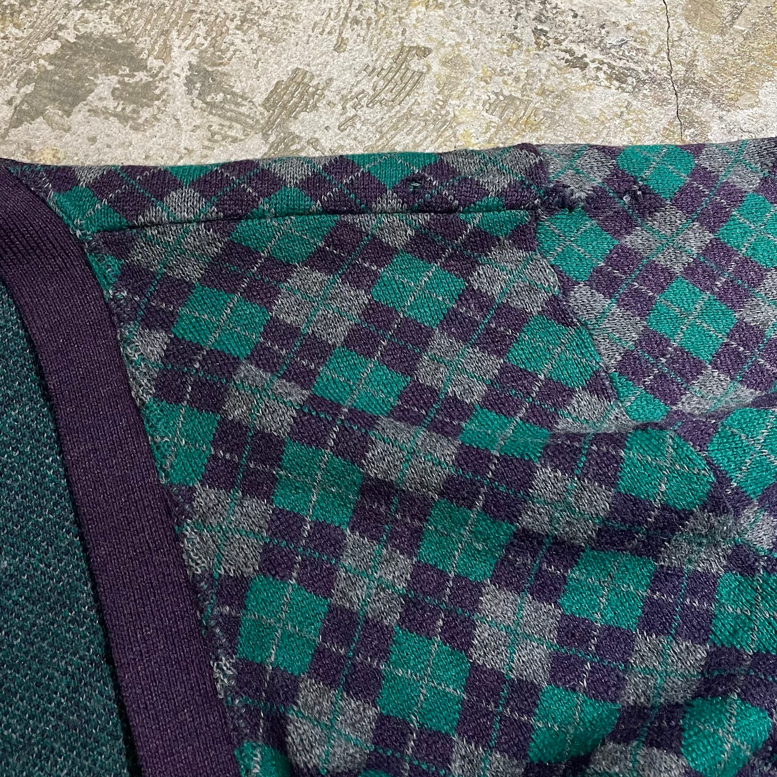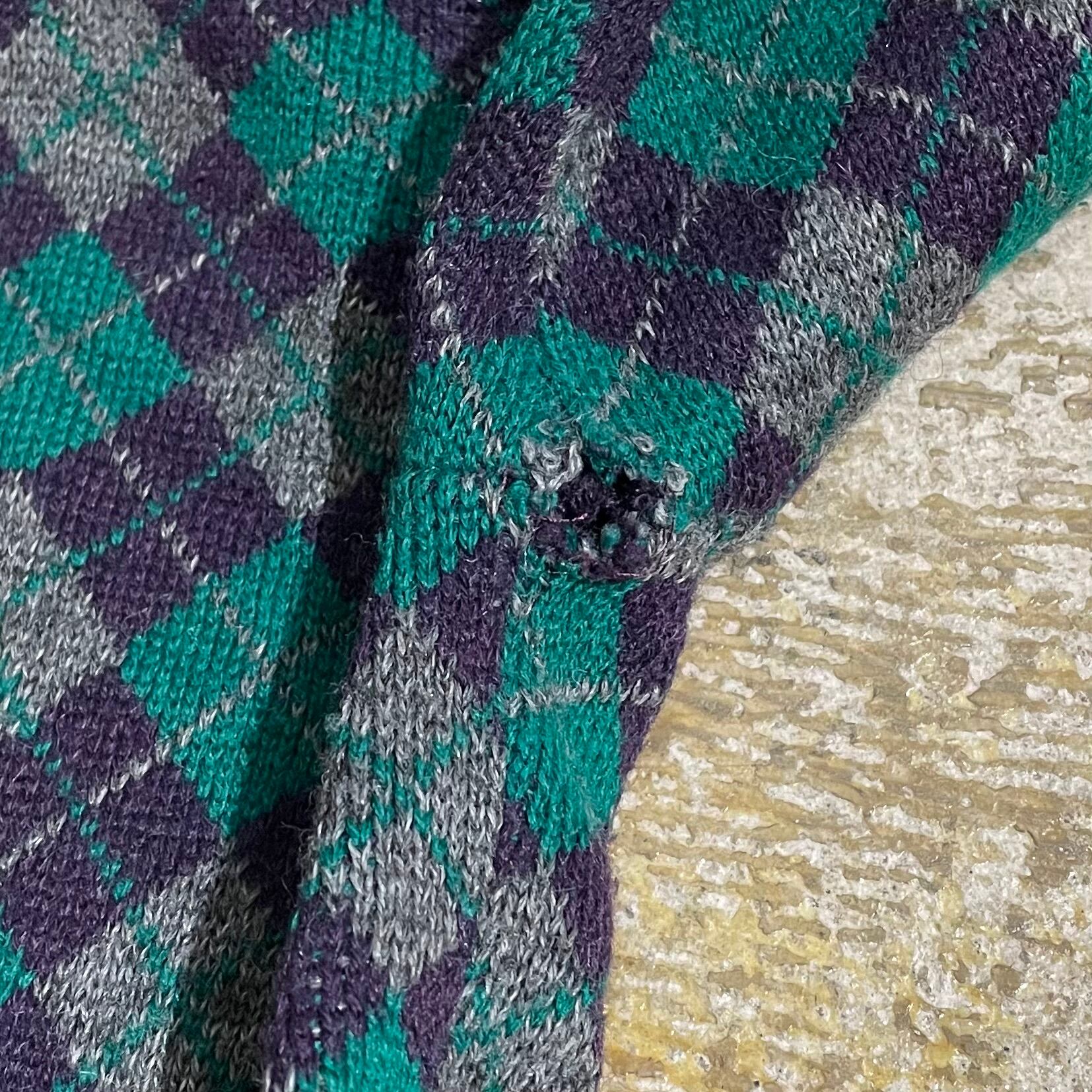 パープルとグリーンの組み合わせが個性的で、グランジ感を感じるジャガードアーガイルニット。高級素材であるアルパカが混紡されており品のあるアイテム。ですが、所々のダメージが時代、カルチャーを感じさせてくれる1着です。サイズはM表記ですが、L-XLくらいのゆったりしたサイズ感です。