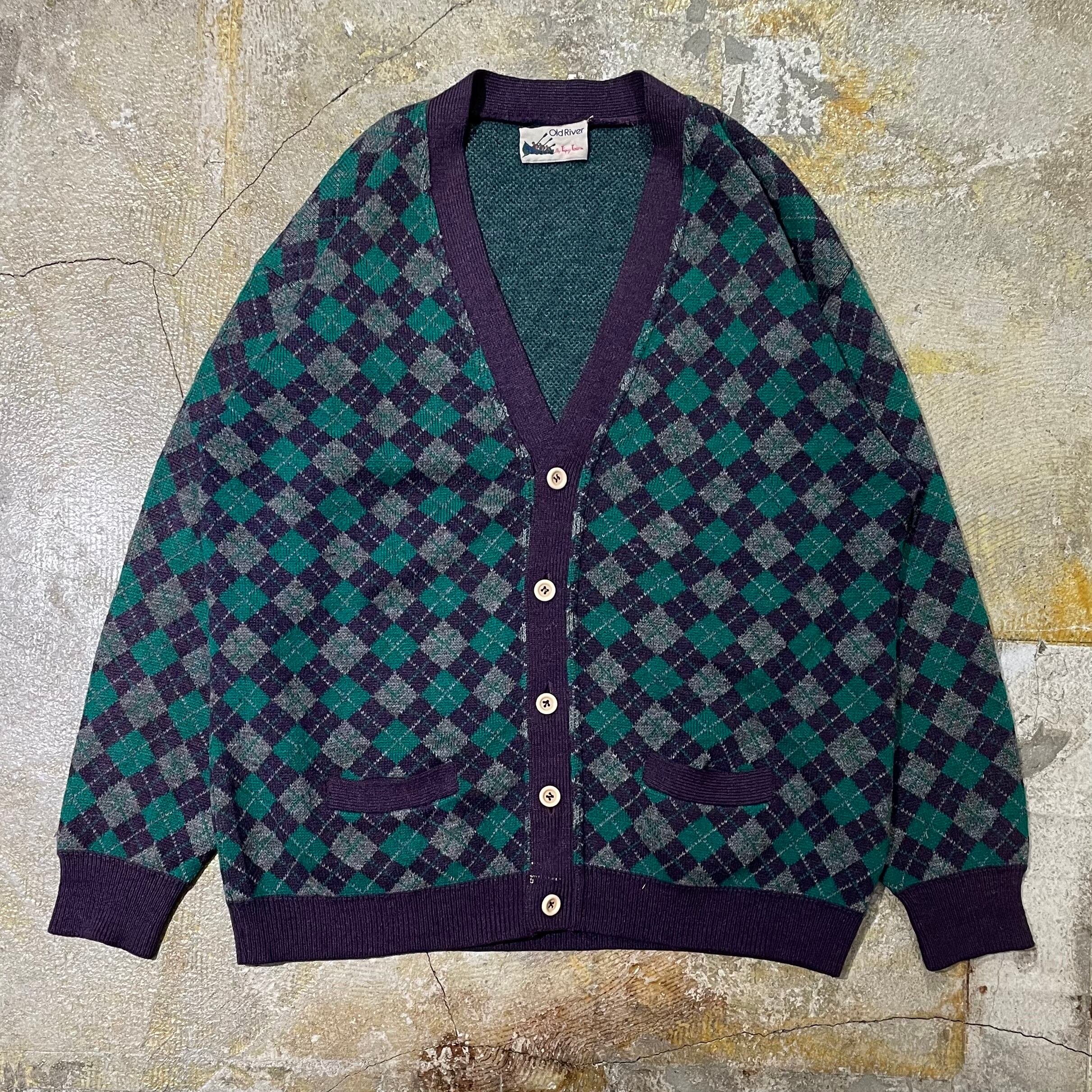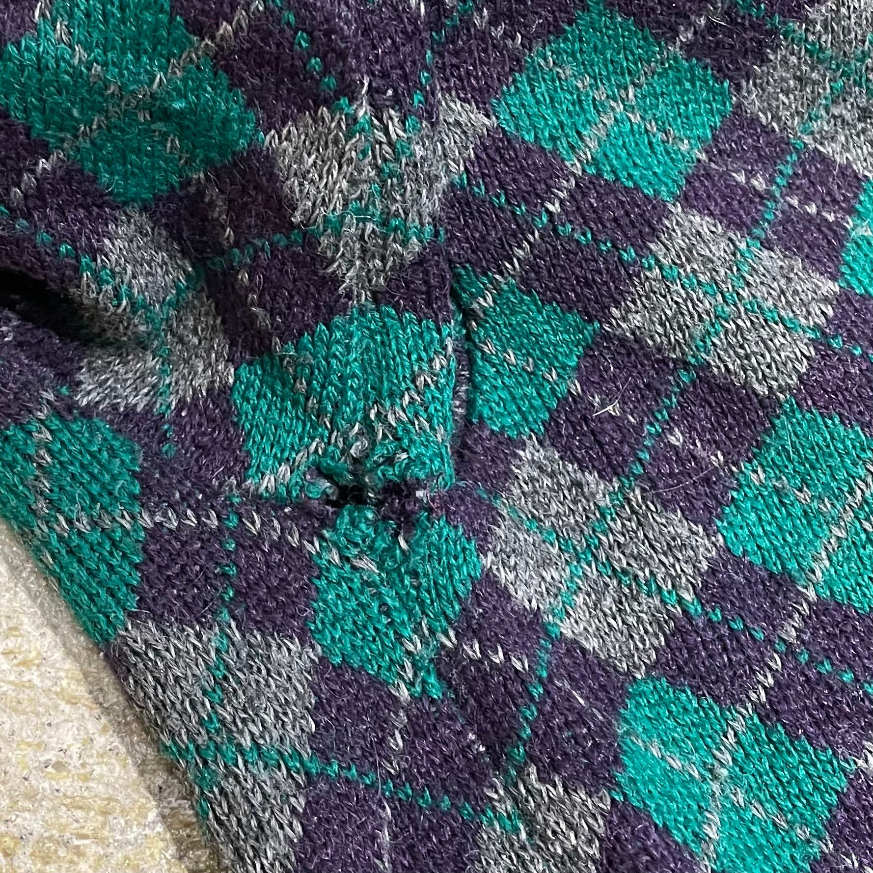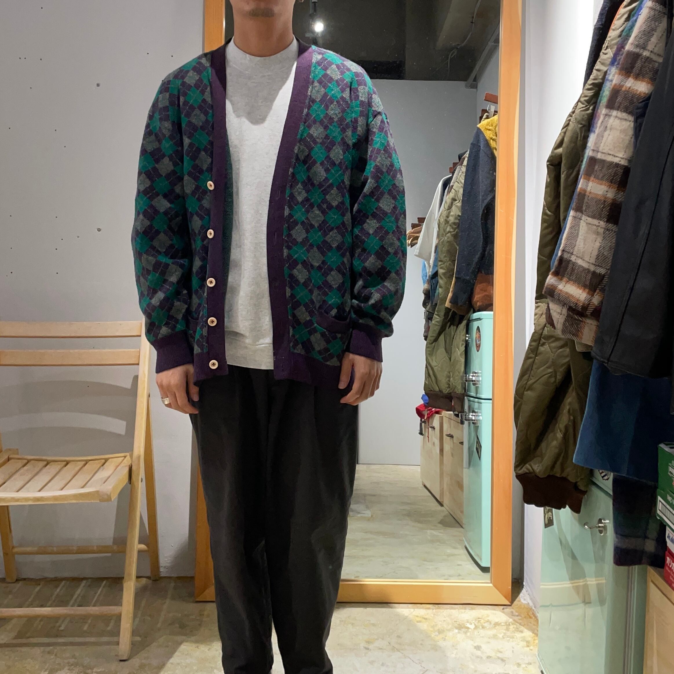 パープルとグリーンの組み合わせが個性的で、グランジ感を感じるジャガードアーガイルニット。高級素材であるアルパカが混紡されており品のあるアイテム。ですが、所々のダメージが時代、カルチャーを感じさせてくれる1着です。サイズはM表記ですが、L-XLくらいのゆったりしたサイズ感です。