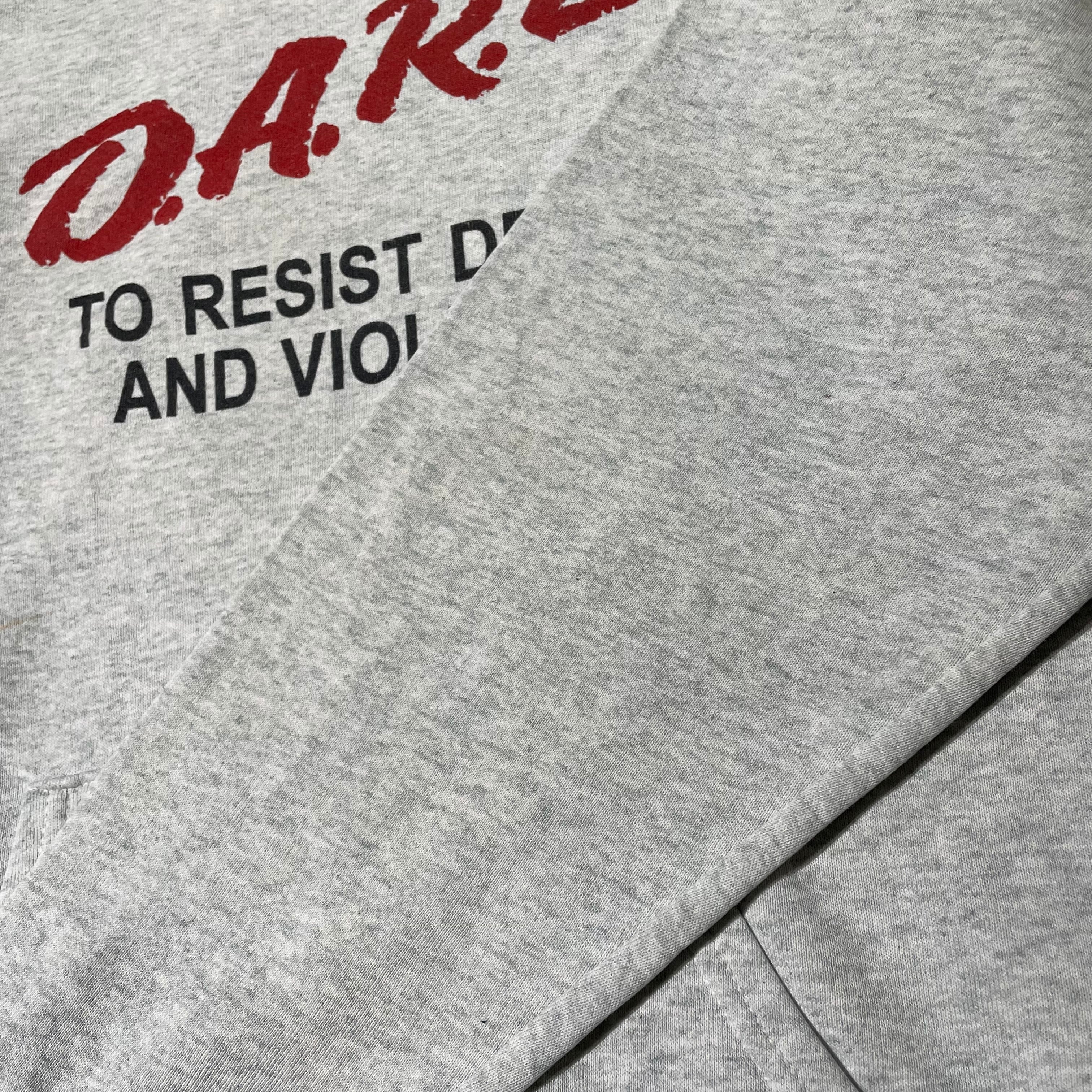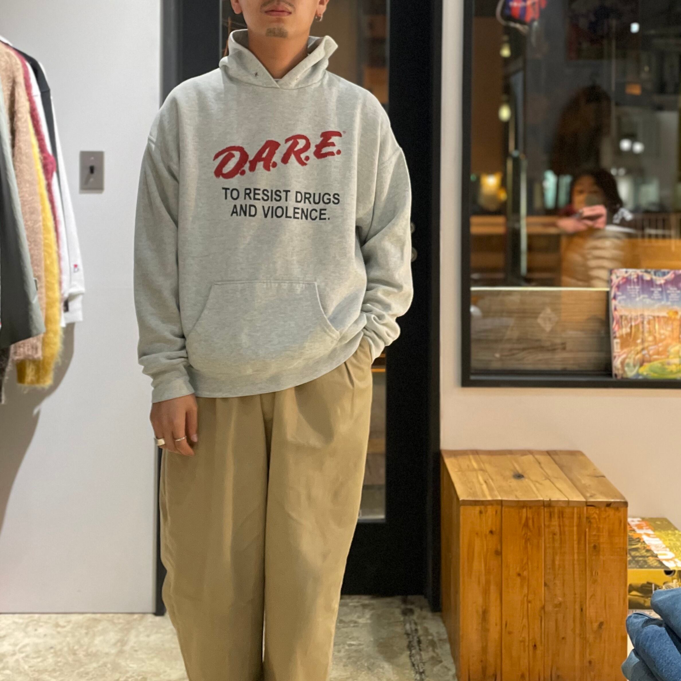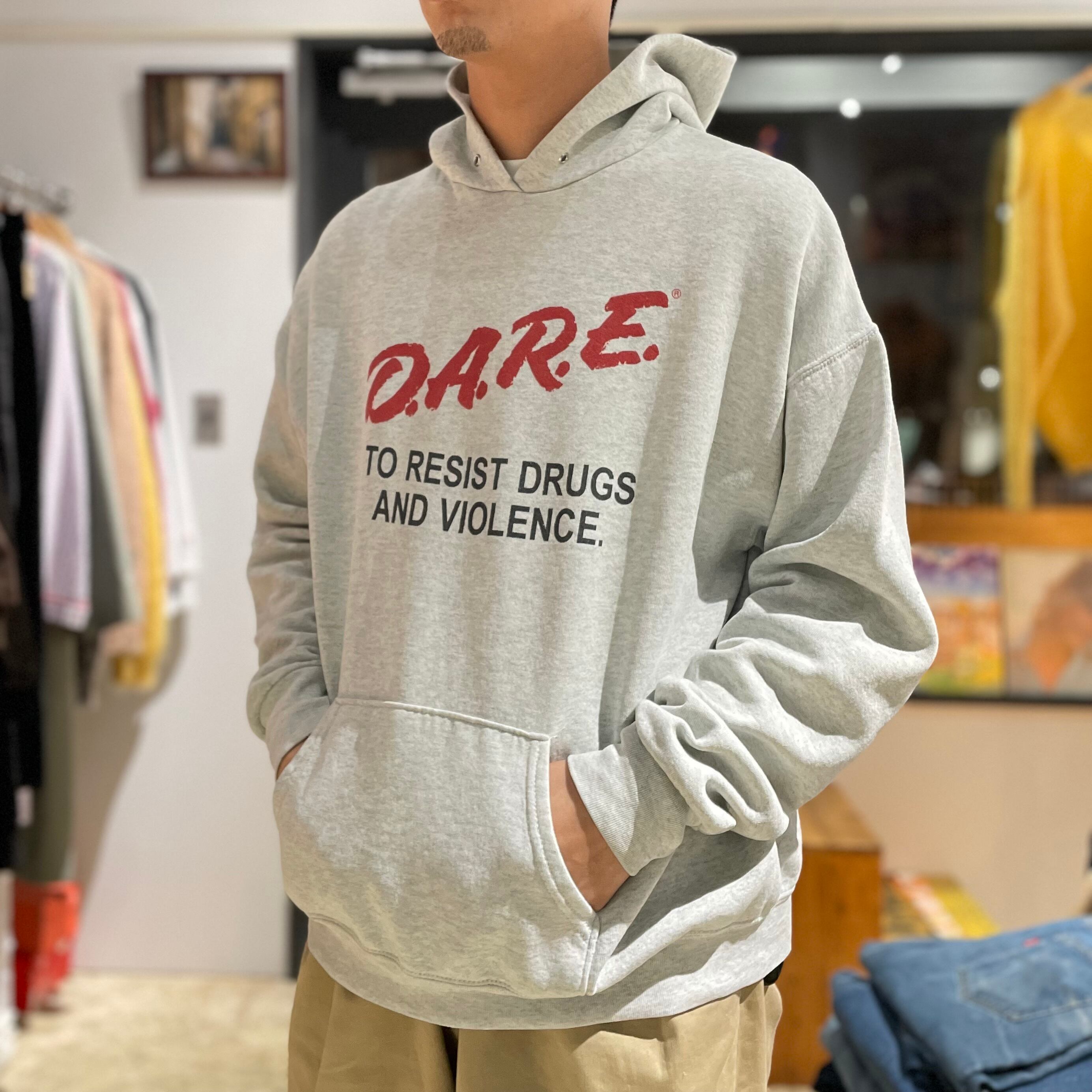 DRUG ABUSE RESISANCE EDUCATIONの略D.A.R.E。子供達を薬や暴力から守る教育団体の90年代フーディです。密かに古着の中でも人気のあるメッセージロゴシリーズです。フルーツのコットンポリエステルのボディを使用ています。そこまで素材としては厚くありませんが、レイヤードや着回し易いアイテムです。身幅、肩幅が大きく今っぽいシルエットです。ワイドパンツとの相性良い1着になってます。