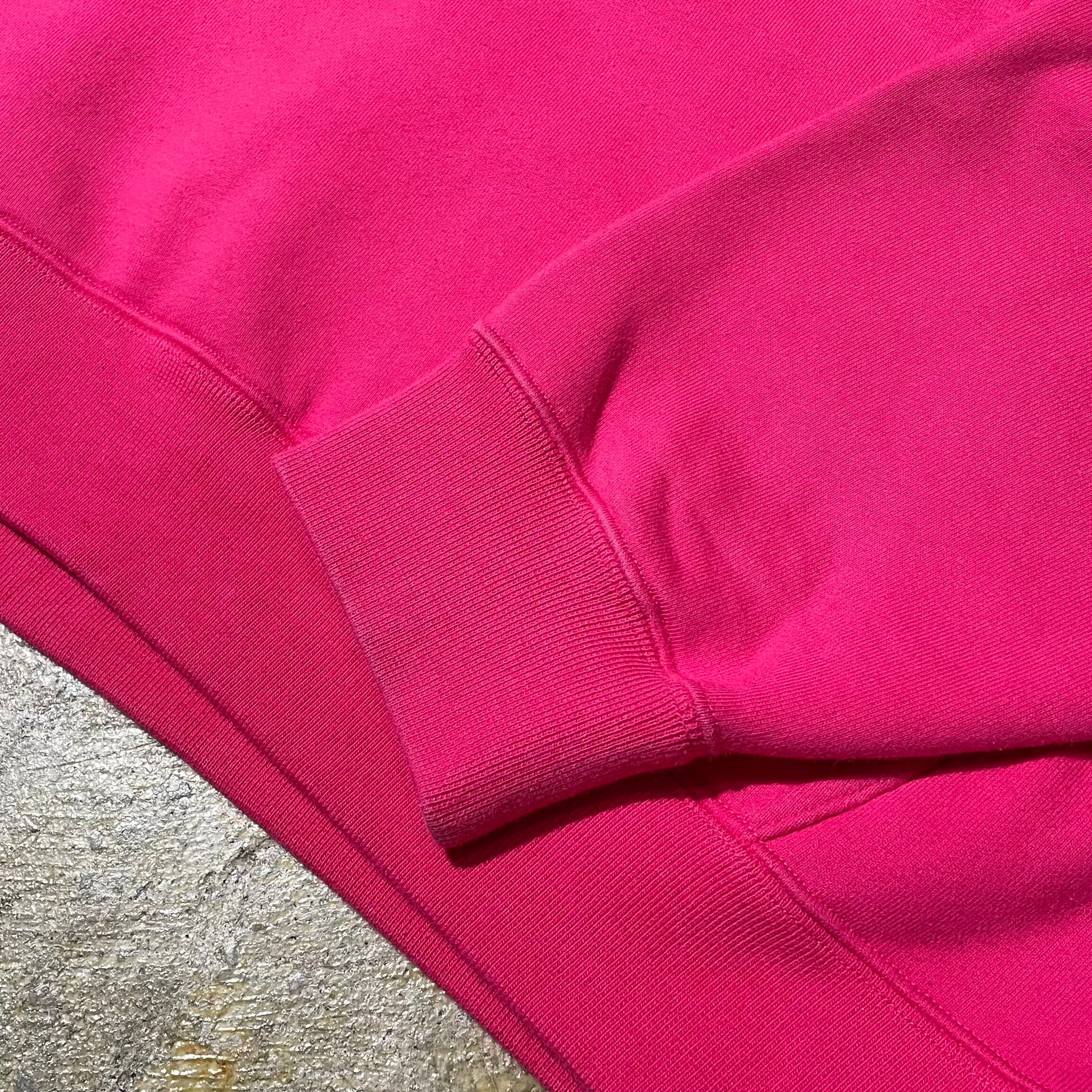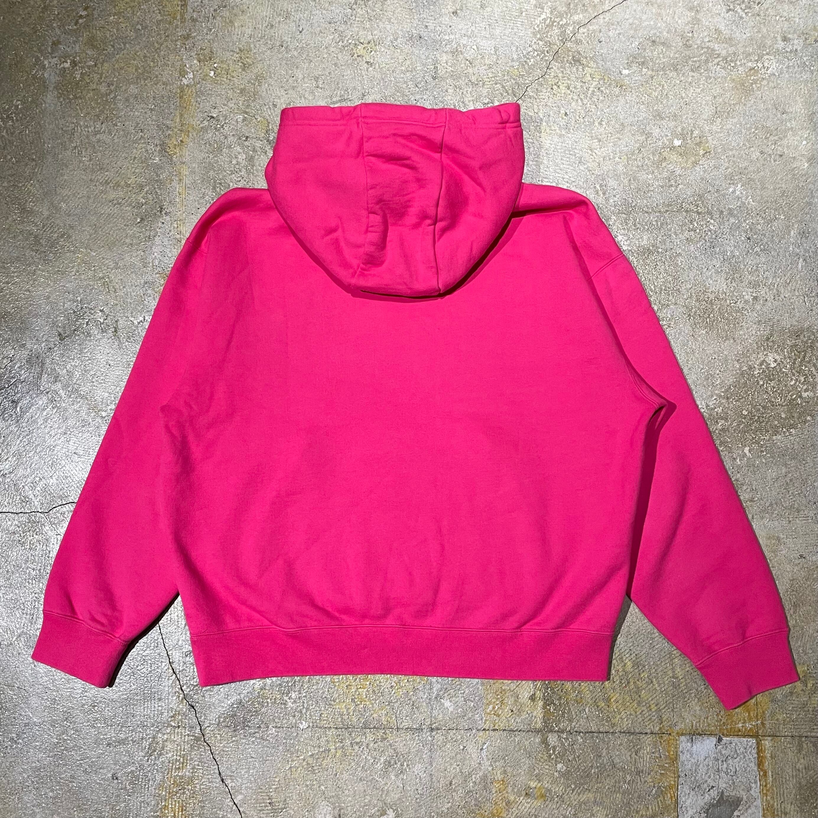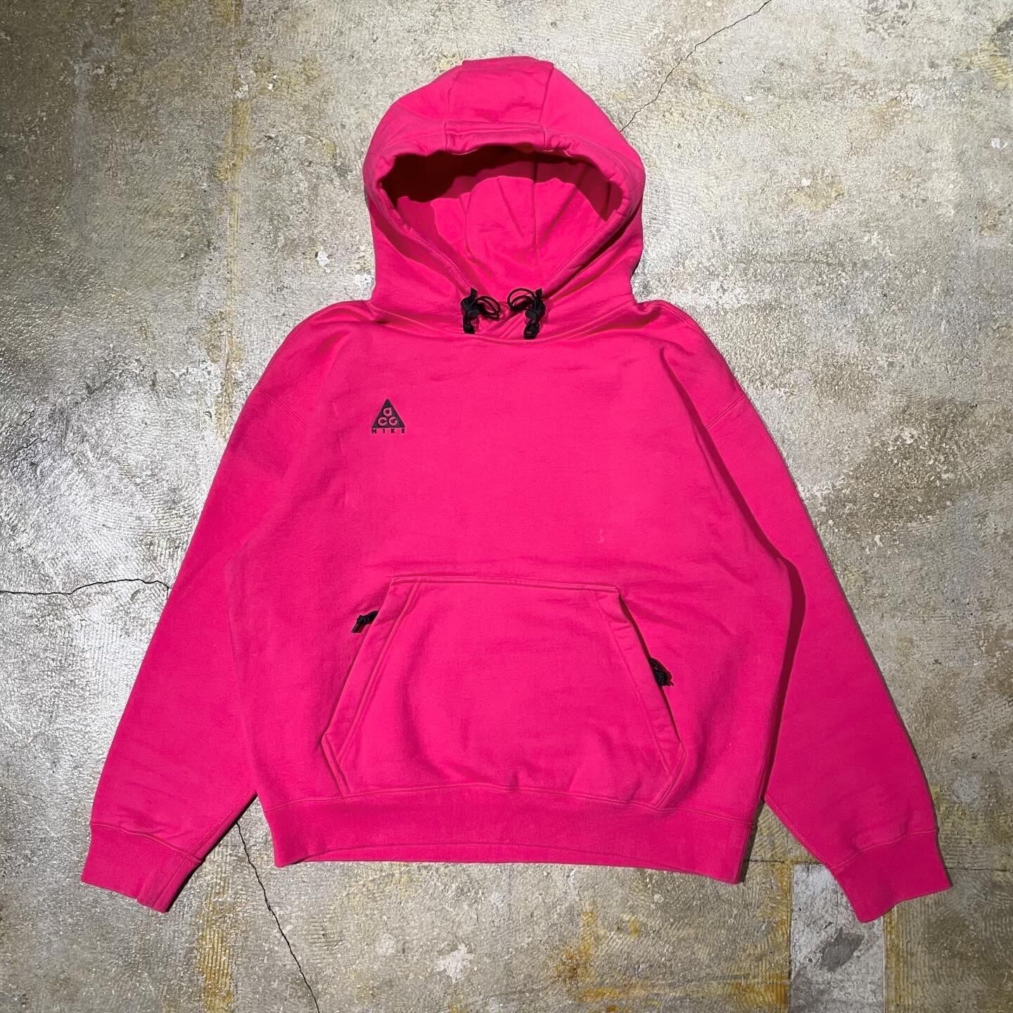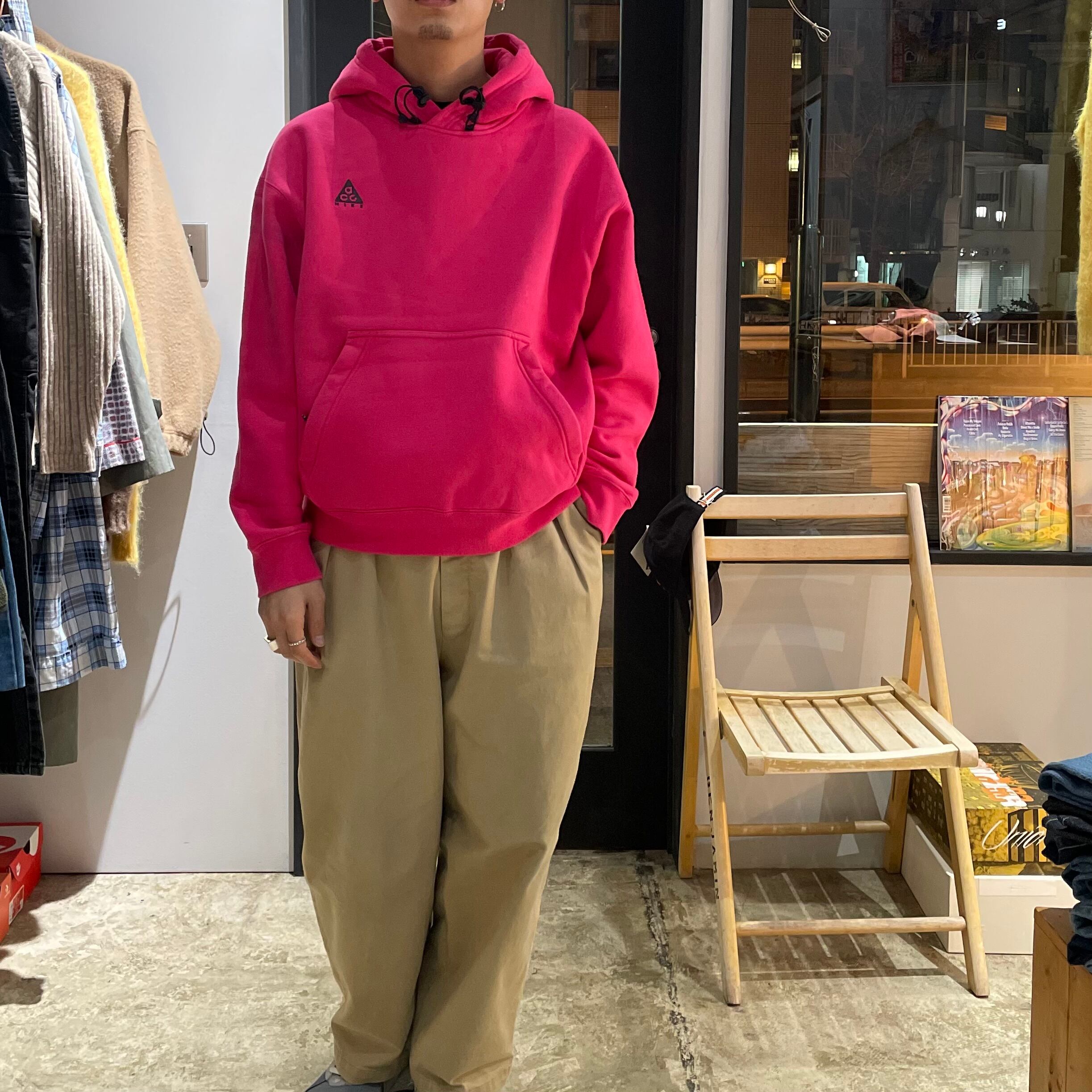 裏起毛のヘビーオンスのNIKE ACGのコットンパーカー。発色の良いカラーリングにフード、ポケットにはスポーティーなデザインの1着。24ssのトレンドカラーであるピンクで差し色、コーディネートの主役になるアイテムです。胸にはACGの刺繍ロゴ入っています。新しいデザインでありながらどこがレトロさを感じられるACGならではのパーカーになっています。