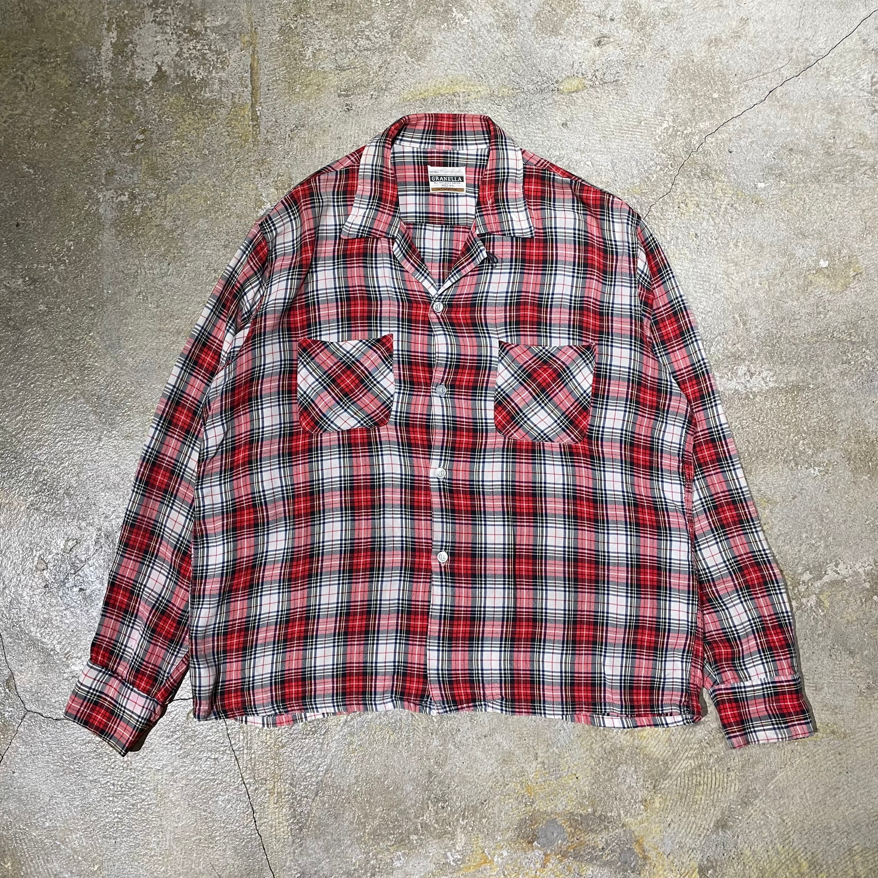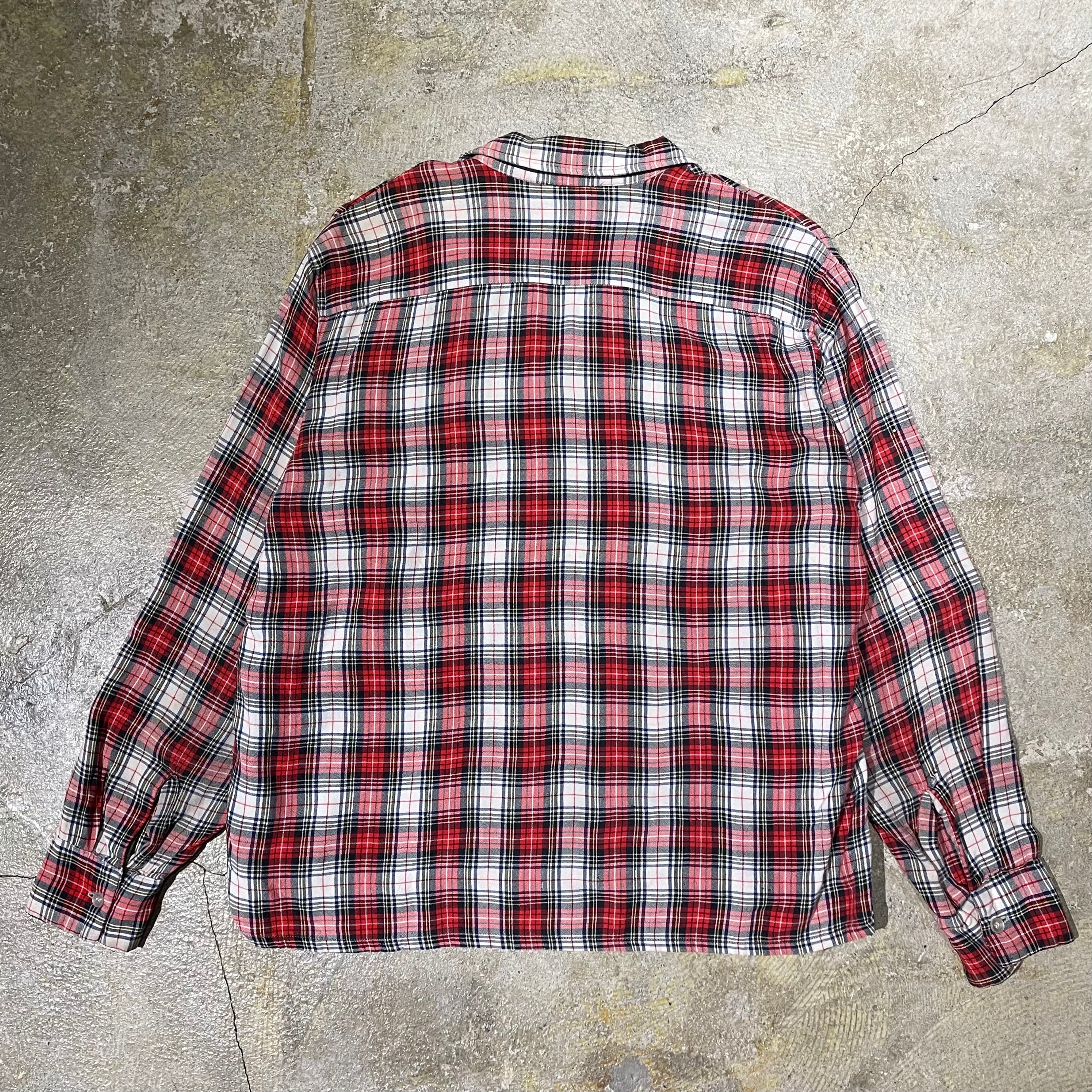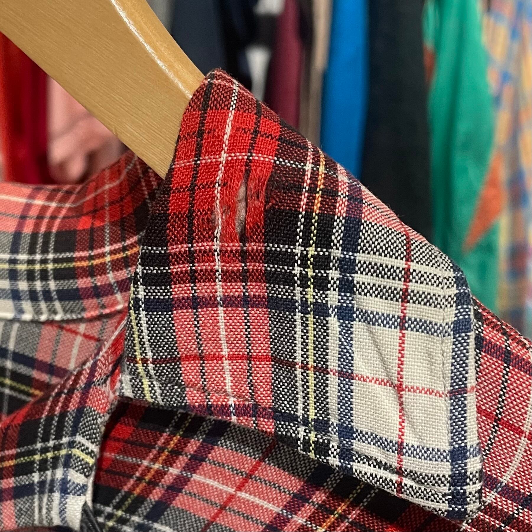 1960〜70年代のヴィンテージチェックレーヨンシャツ。白ベースに赤と黒で構成された渋くも綺麗なチェック柄。ヴィンテージならではの柔らかく落ち感のあるたまらない素材感です。Tシャツの上から羽織るだけでスタイルの決まる間違いのない1着です。今より50年ほど前の商品のため襟にやぶれや所々スレ等ありますが、風合いも合わせてヴィンテージを楽しめる方にはおすすめの1着です。