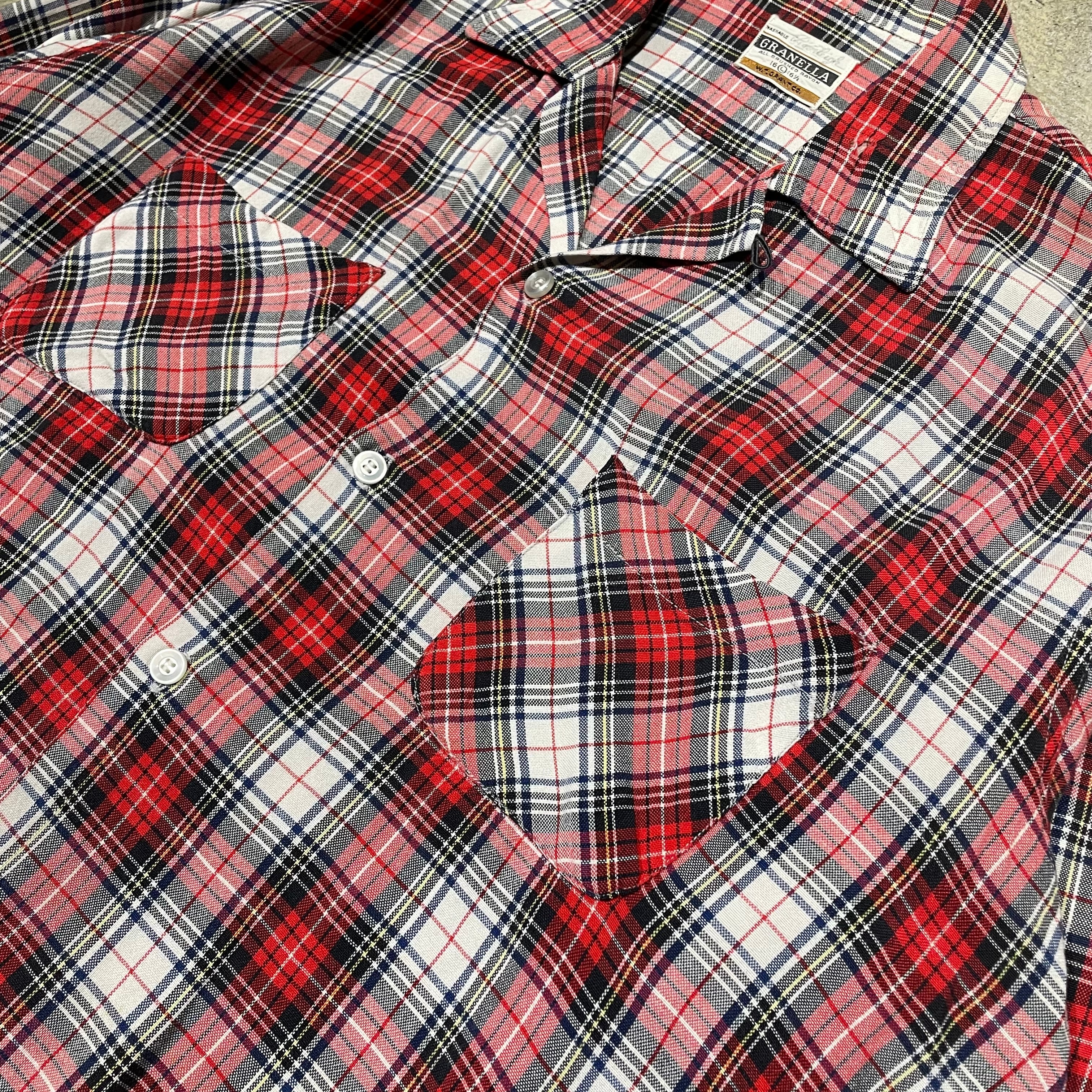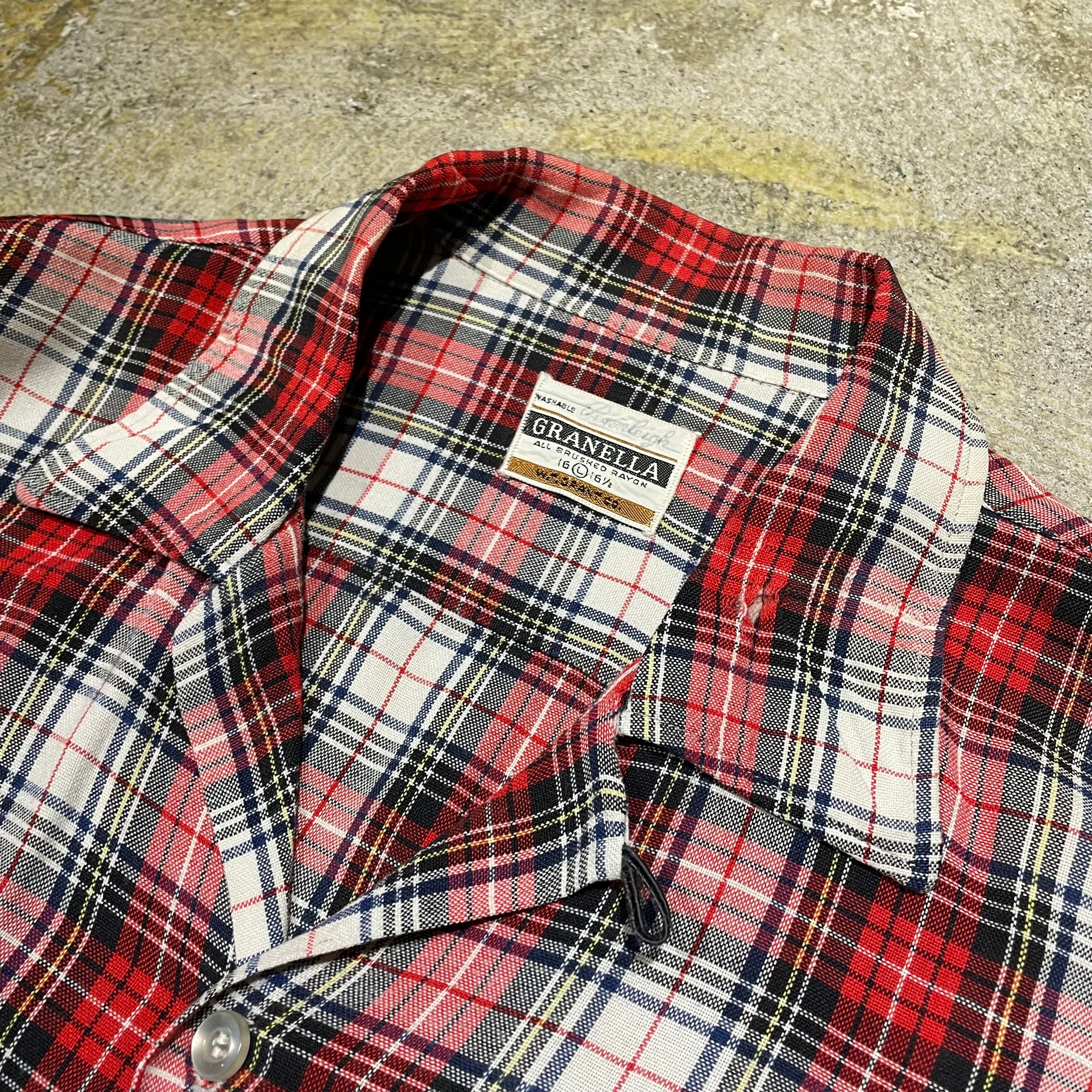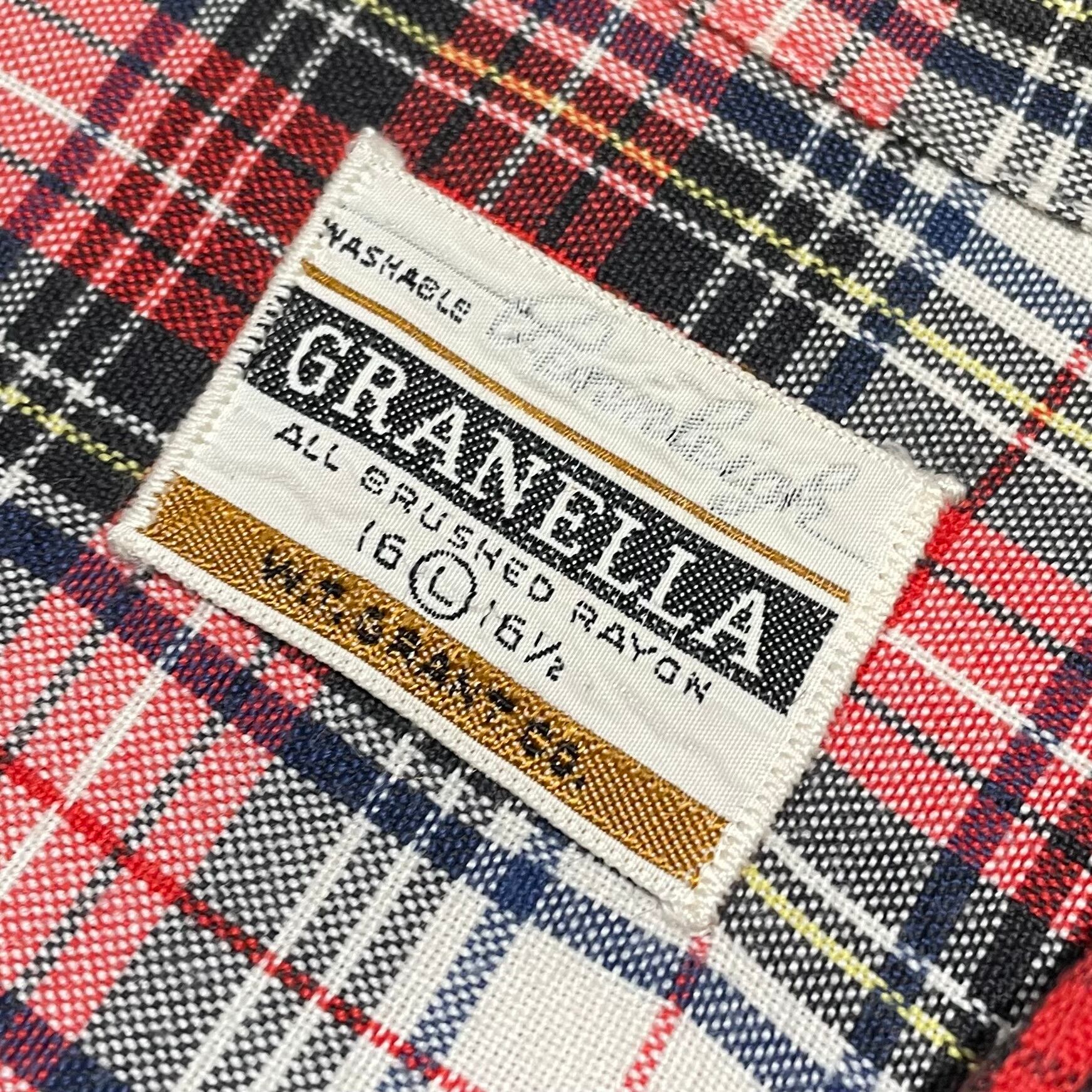 1960〜70年代のヴィンテージチェックレーヨンシャツ。白ベースに赤と黒で構成された渋くも綺麗なチェック柄。ヴィンテージならではの柔らかく落ち感のあるたまらない素材感です。Tシャツの上から羽織るだけでスタイルの決まる間違いのない1着です。今より50年ほど前の商品のため襟にやぶれや所々スレ等ありますが、風合いも合わせてヴィンテージを楽しめる方にはおすすめの1着です。