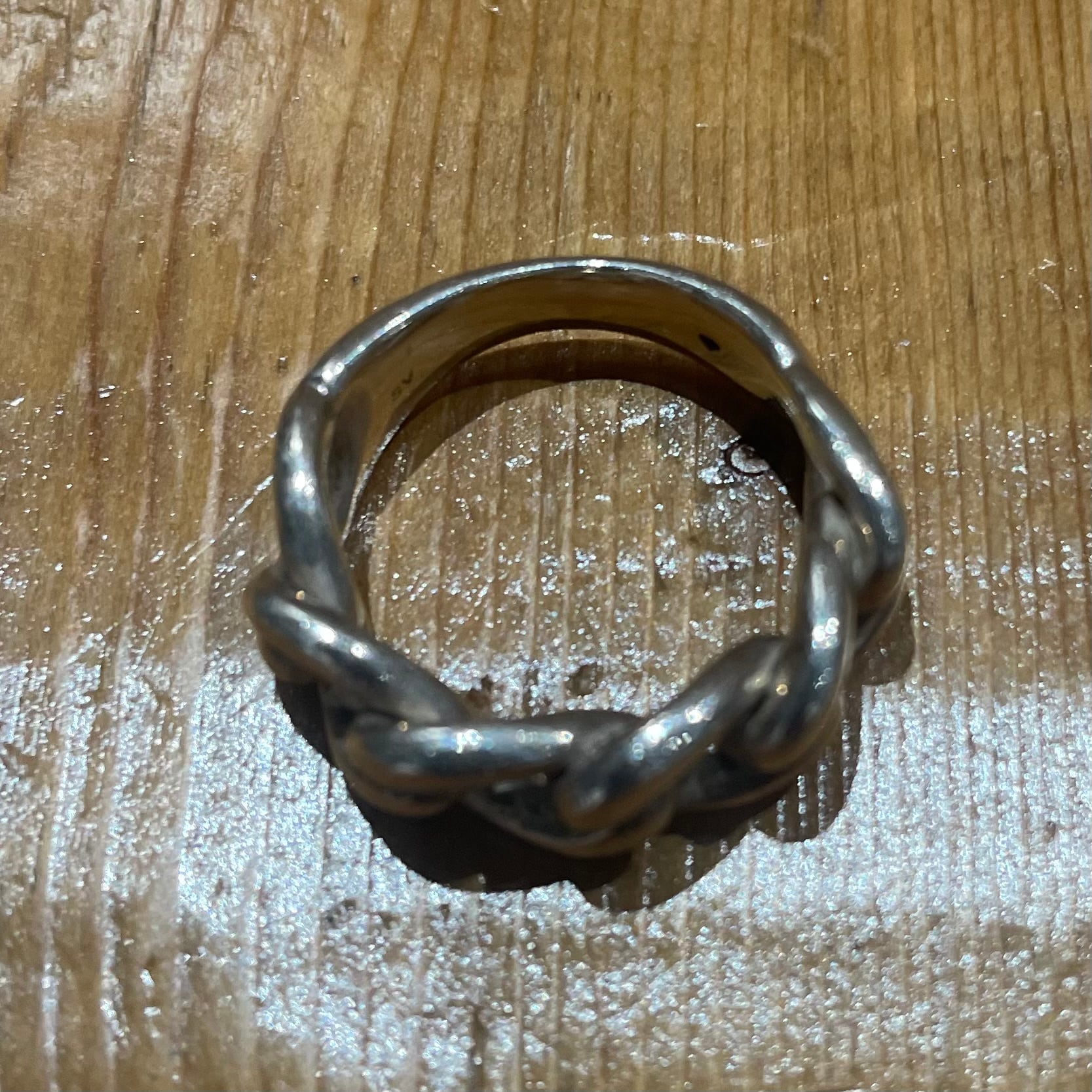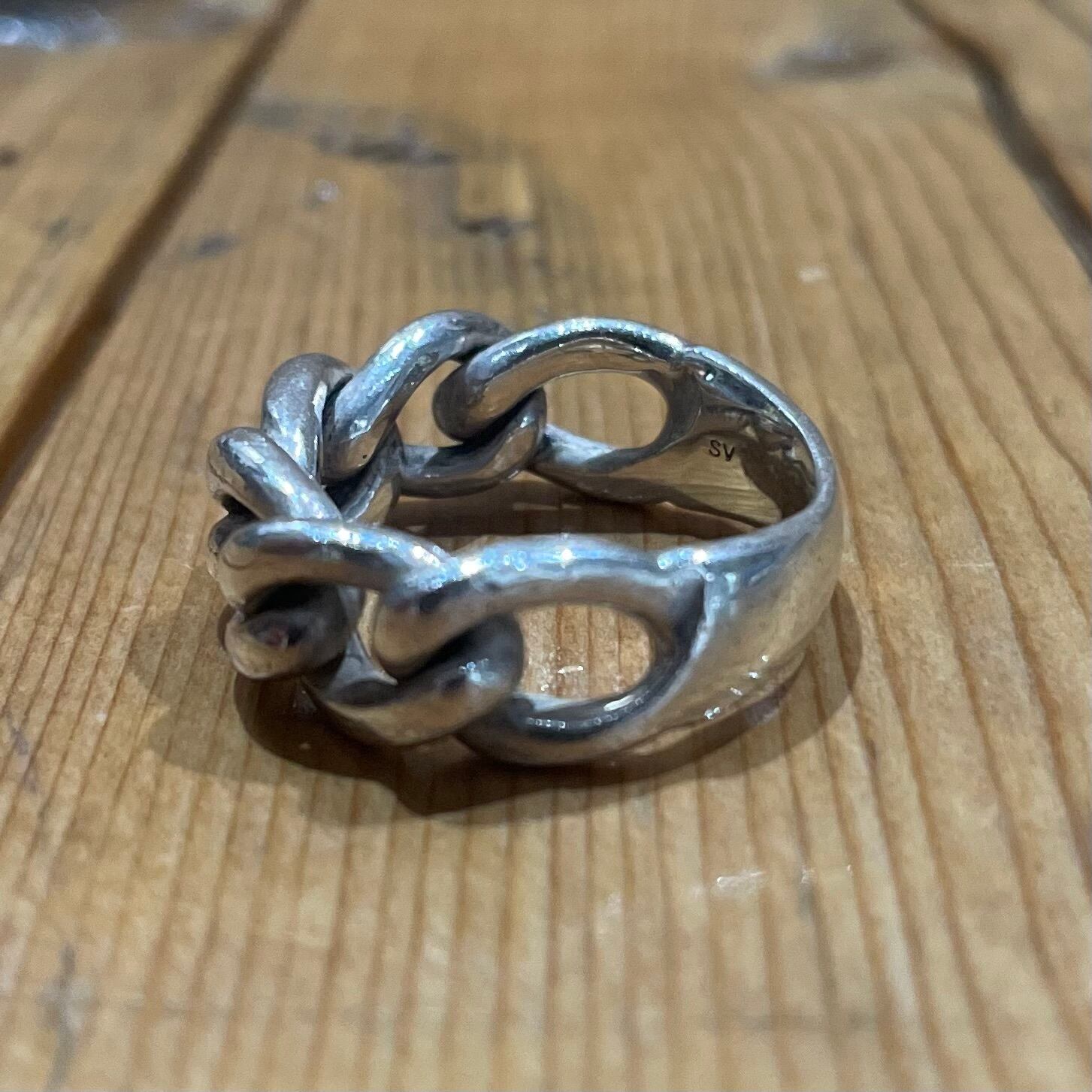 チェーンの模様をあしらったシルバーリング。綺麗な光沢感としっかりと重みのあるシルバー素材のアイテム。品のある素材でありながら、しっかりとデザイン性に富んだリング。夏に1つ付けているだけで、コーディネートの枠が広がるアクセサリーなっています。