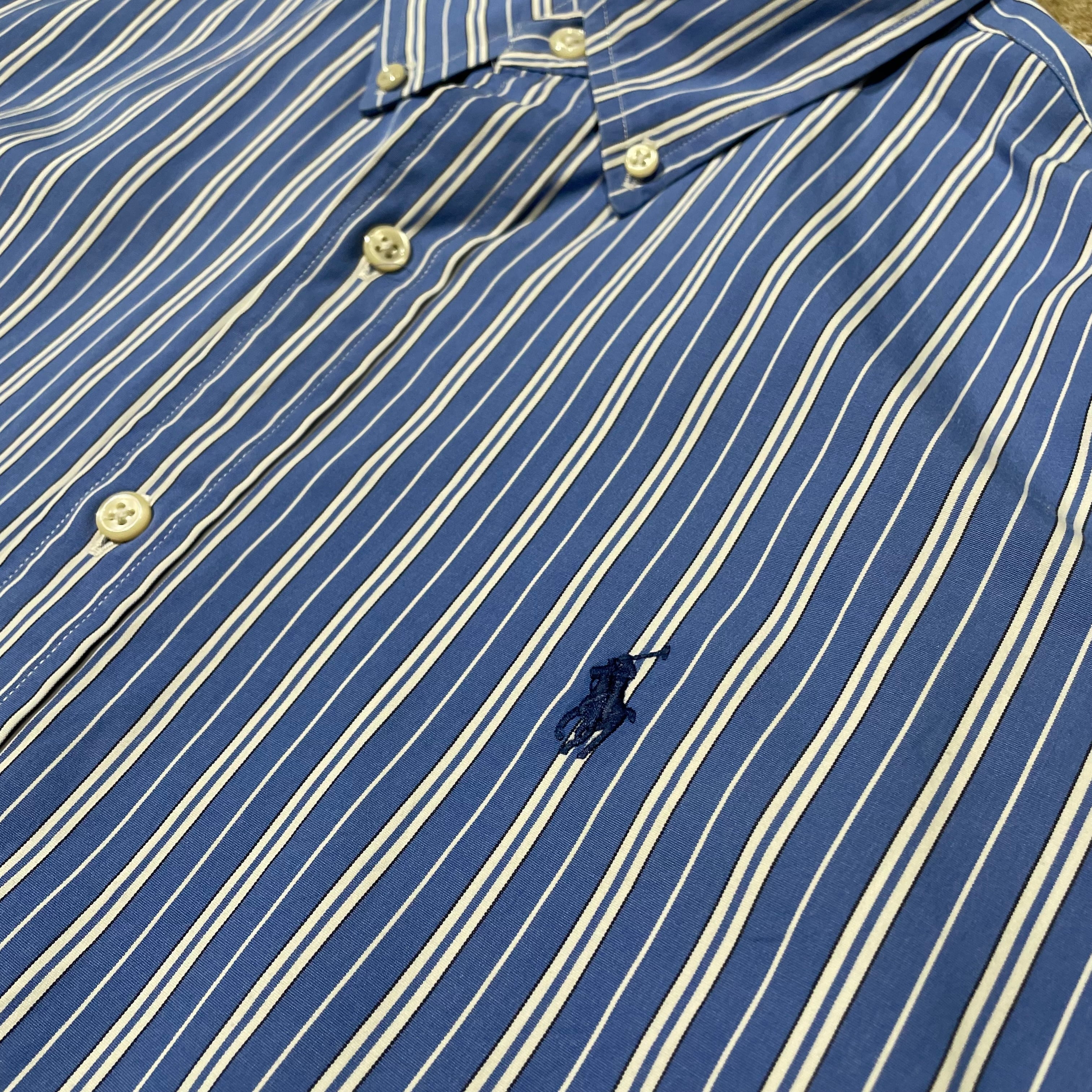 ポロラルフローレンの名作BDシャツ。中でもストライプブロード素材のシャツは生地、縫製、シルエットバランスどこをとっても非の打ち所がないアイテム。ブルーベースに白ストライプで綺麗な配色柄で汎用性の高いアイテム。打ち込みの良いコットン素材でサラッと肌触りの良いシャツになってます。ジャストサイズでも、ばさっとオーバーサイズに着用してもコーディネートの纏まる1着です。