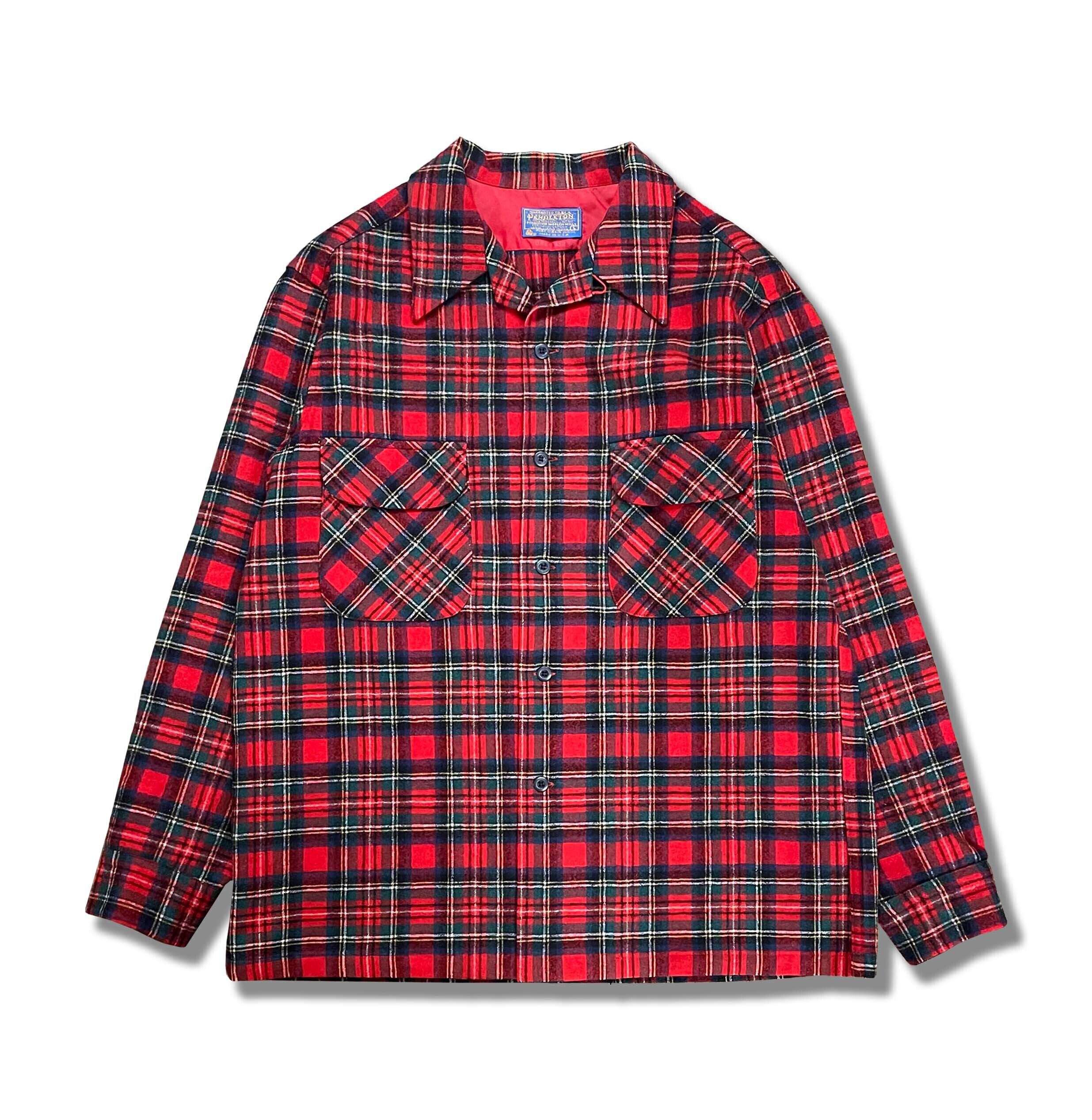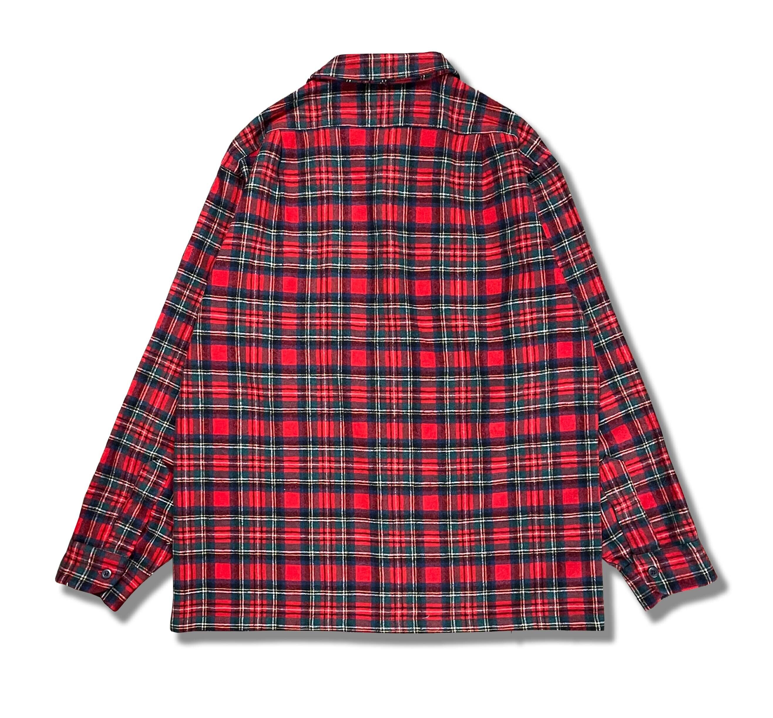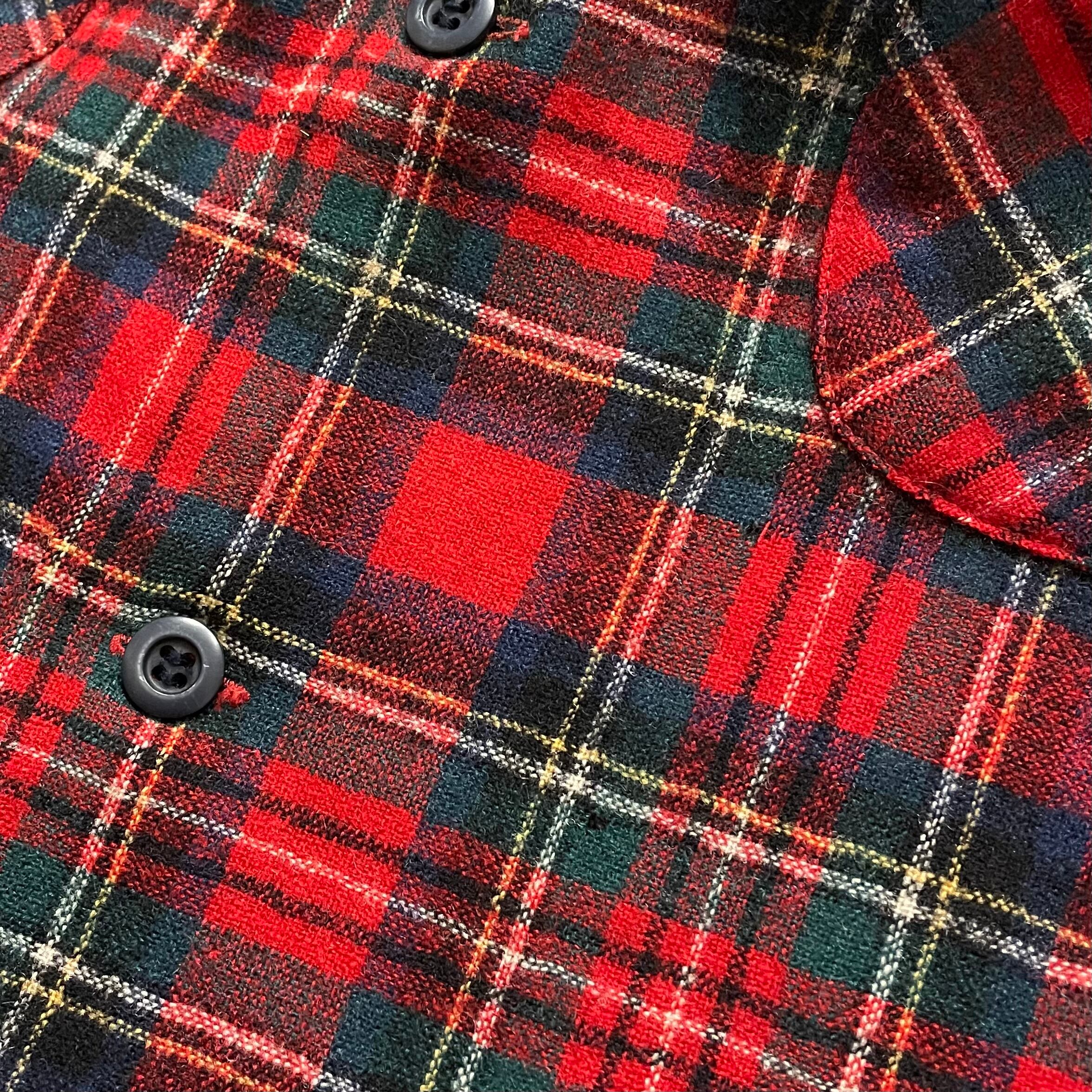 ウールのチェックシャツといえばペンドルトンではないでしょうか。1920年代から続く伝統的なブランド。近年ではモードブランドとも多くコラボしていおり唯一無二のペンドルトン。今回は80年代の定番ボートシャツ。ベーシックでありながら最も愛されているモデルです。しっかりとしたウール素材でありながら、柔らかく着やすいのが特徴的な生地。今回は赤ベースにグリーン、ブルーの差し色の入った秀逸なチェック柄。フロントに小さい穴が見られますが、全体的に状態は良く、また縮みの見られない1着。ゆったりとしたサイズ感も球数が少なくなっているアイテムです。こんな機会にぜひ。