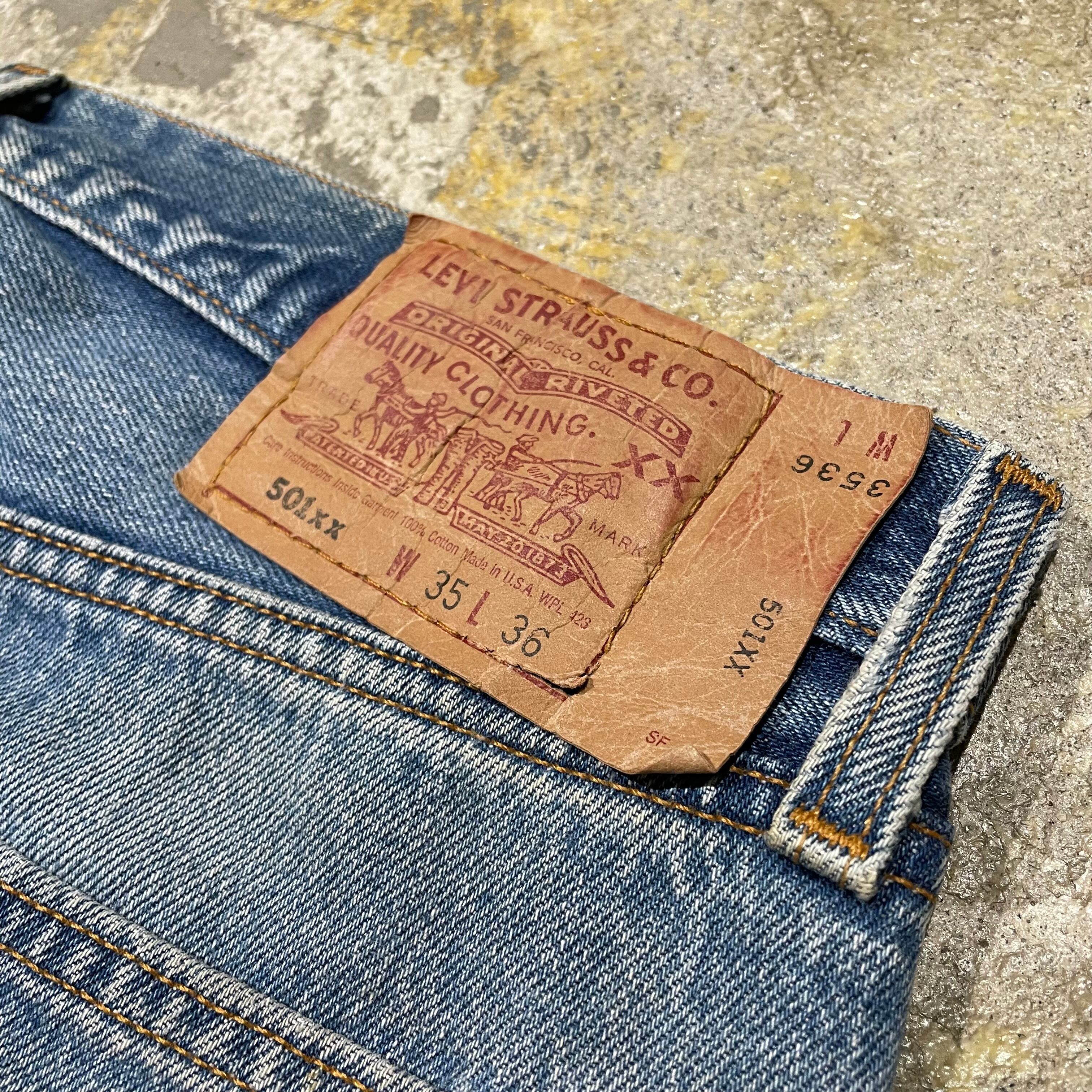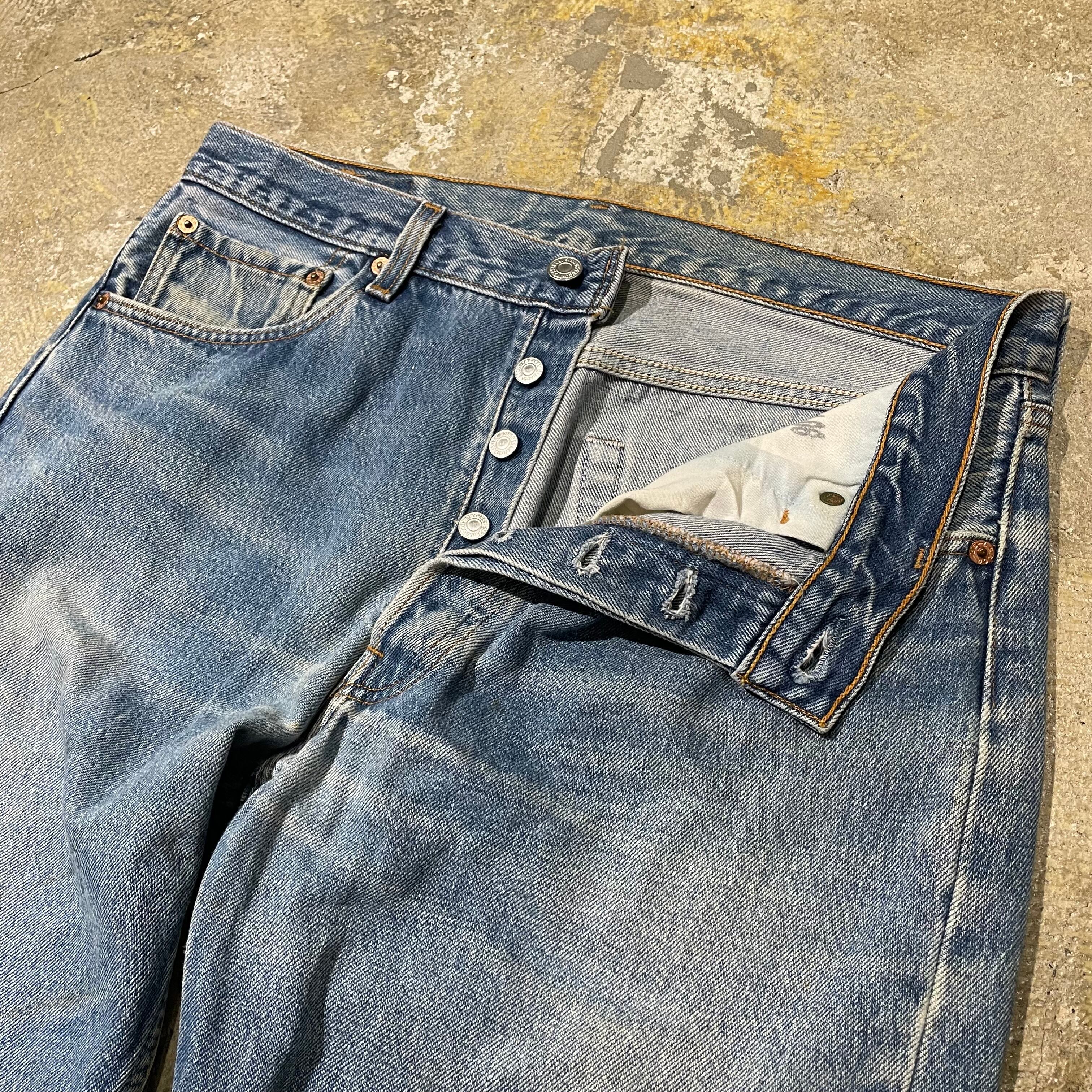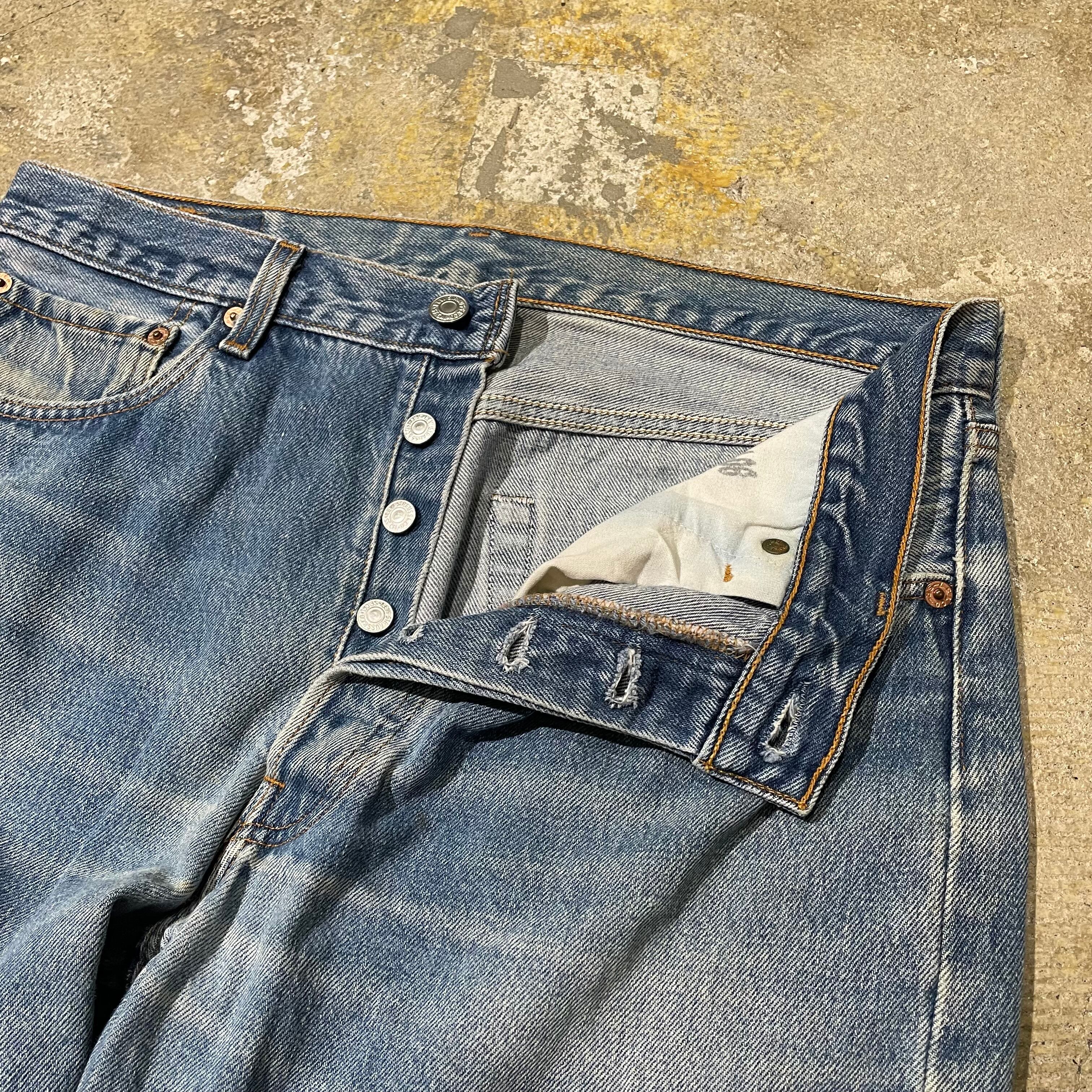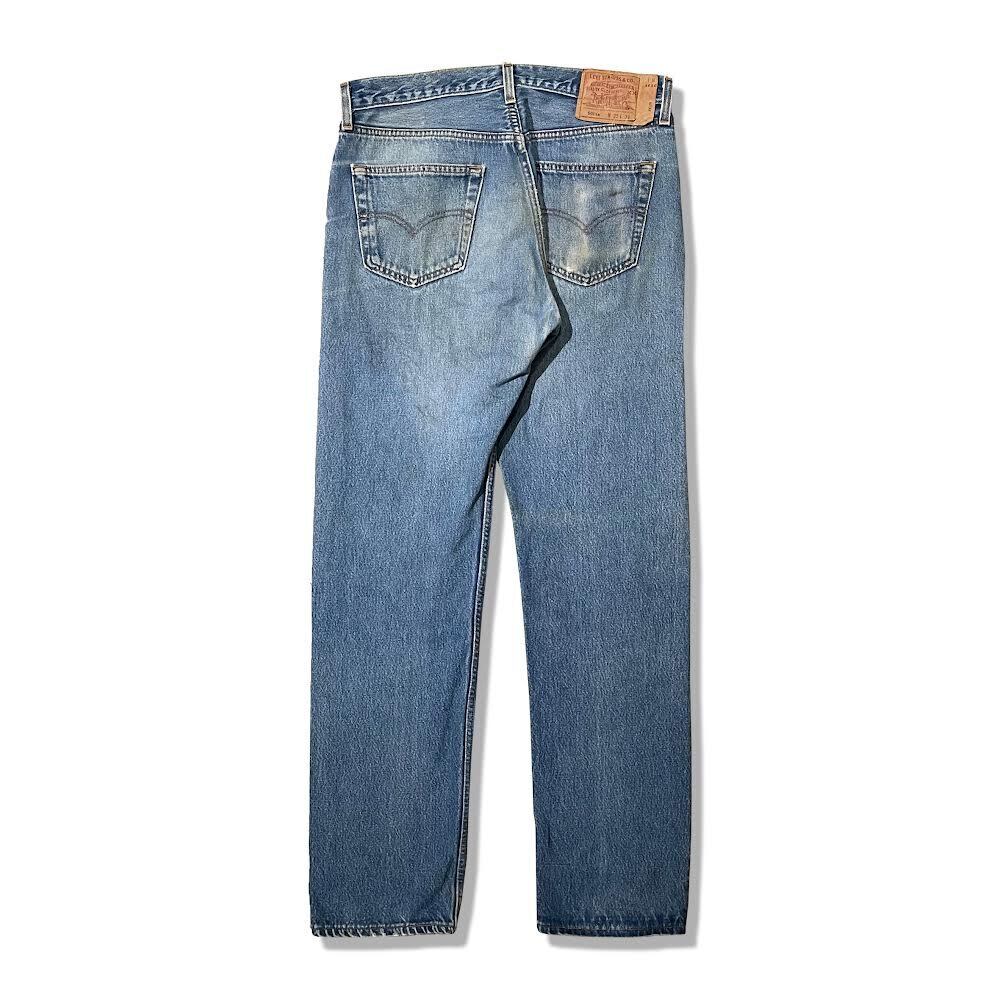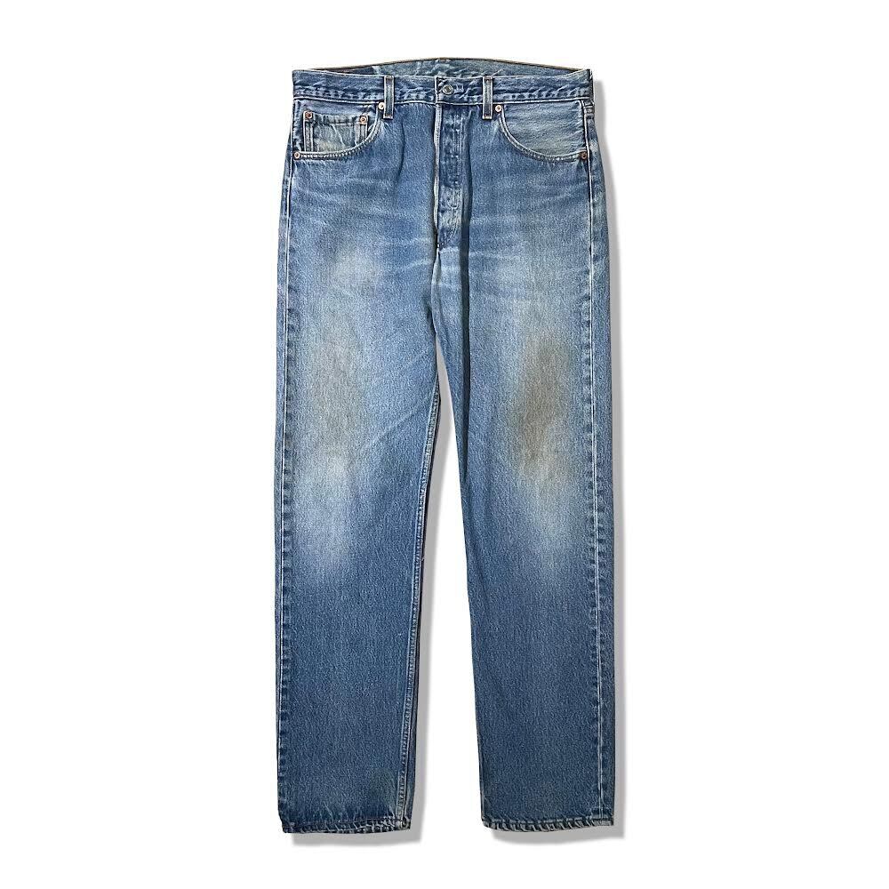 90年代Levis 501xxモデル。良く90年代は色落ちがのっぺりすると言われていますが、モノによってはしっかりとヒゲ、色の濃淡、コントラストしっかり出ています。こちらは日焼け感もよく雰囲気良い1着になってます。レングス表記はL36ですが、裾上げされており、L32(股下83cm)程。ワイド目に履きたい人にはおすすめなアイテムです。年々上がり続けている90s 501をこの機会にぜひ。