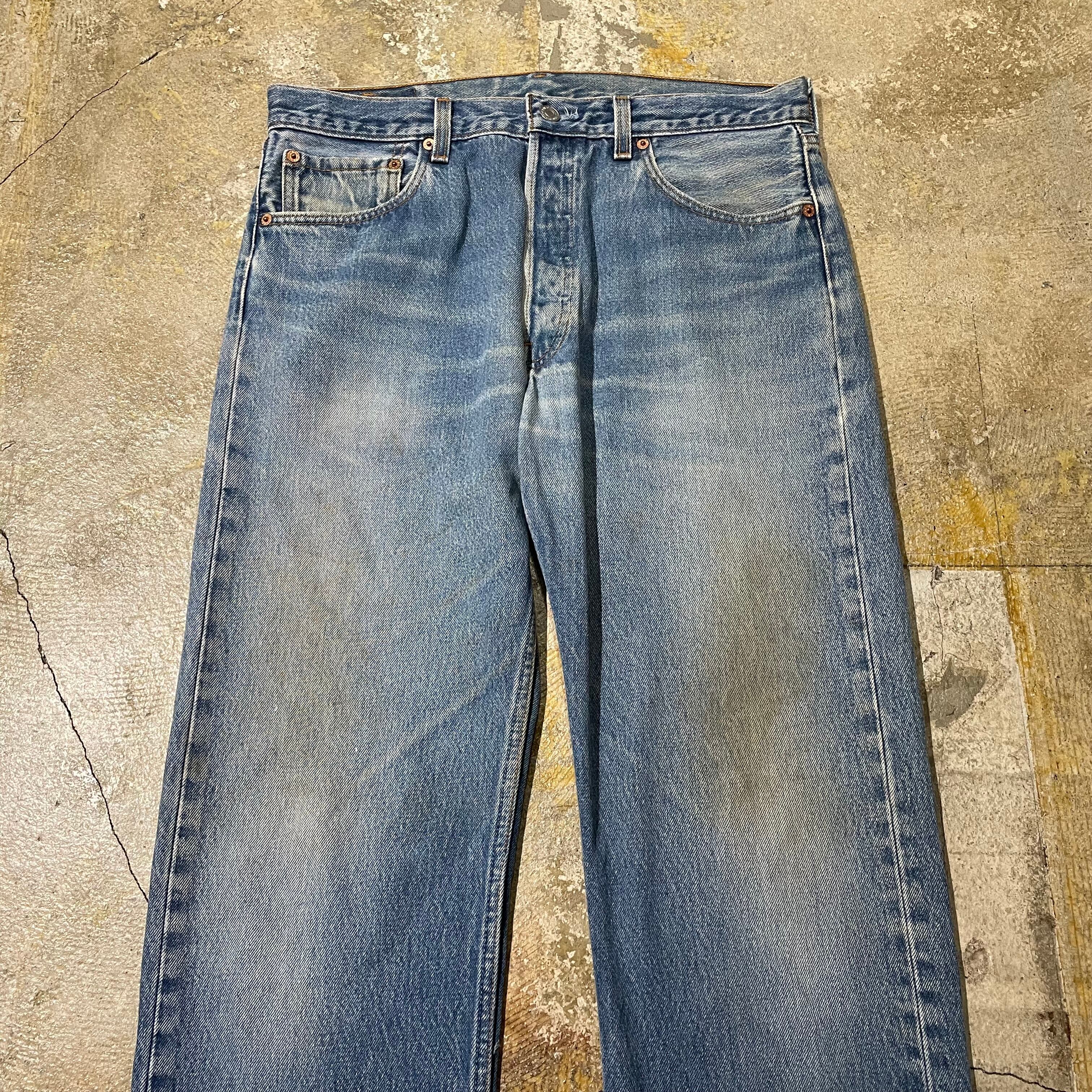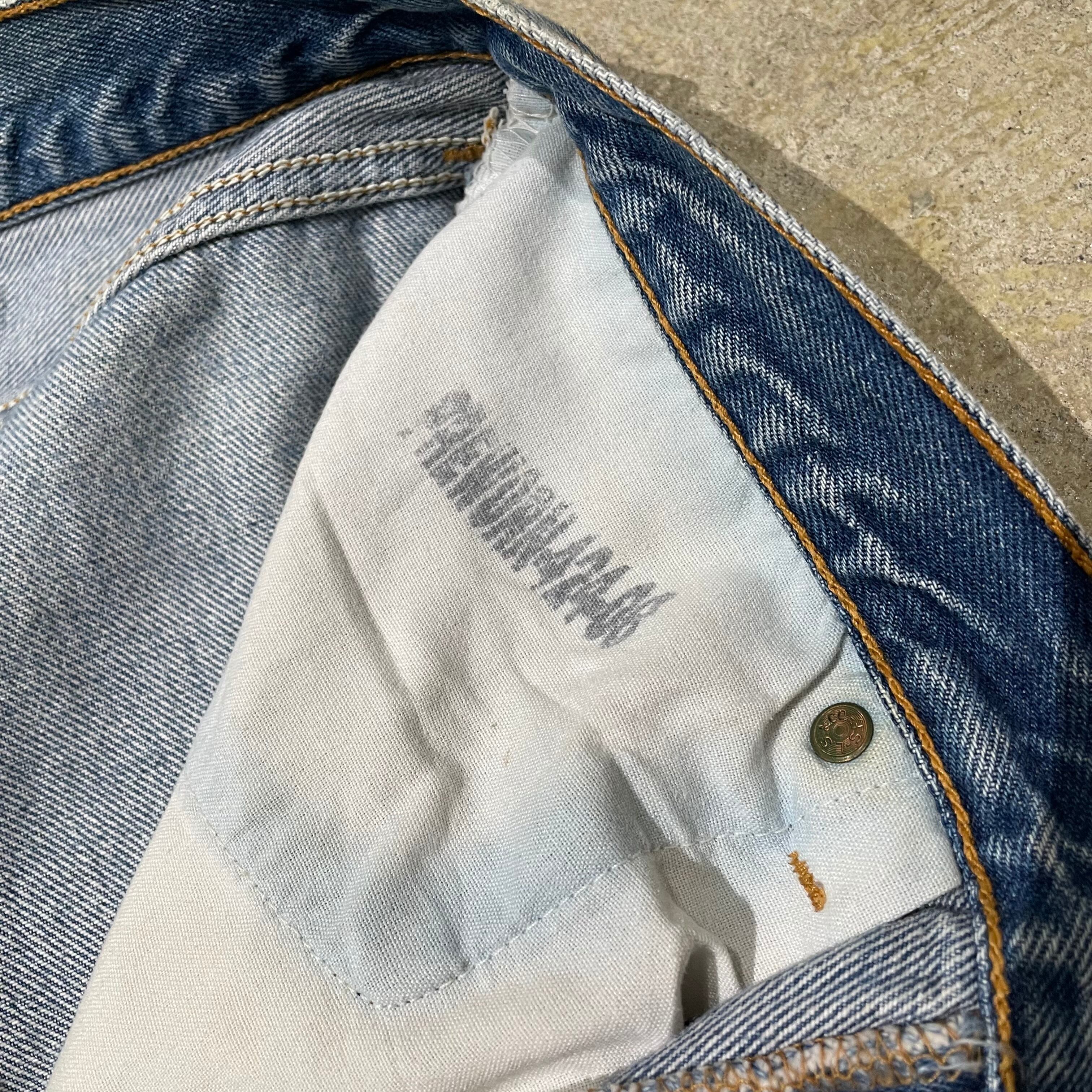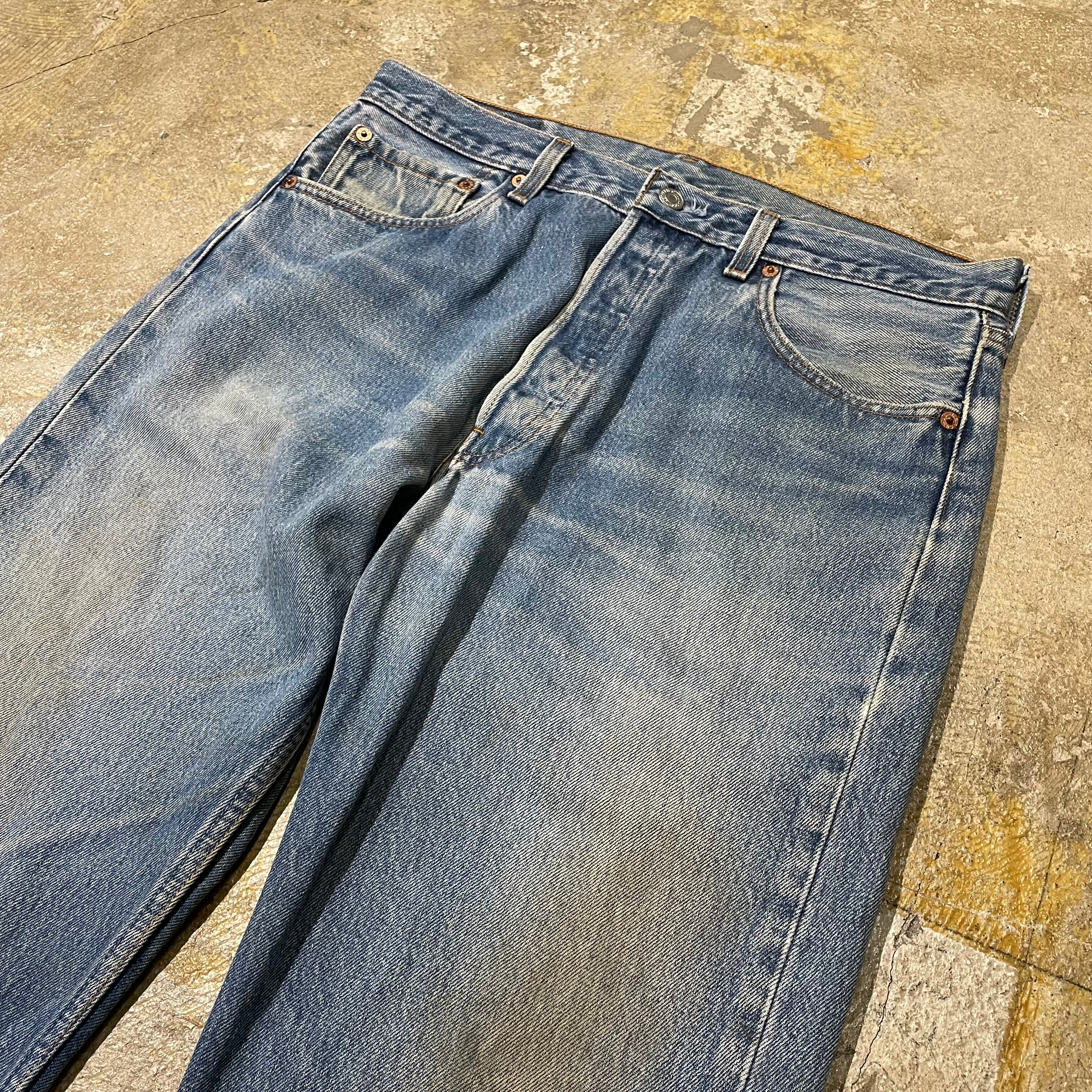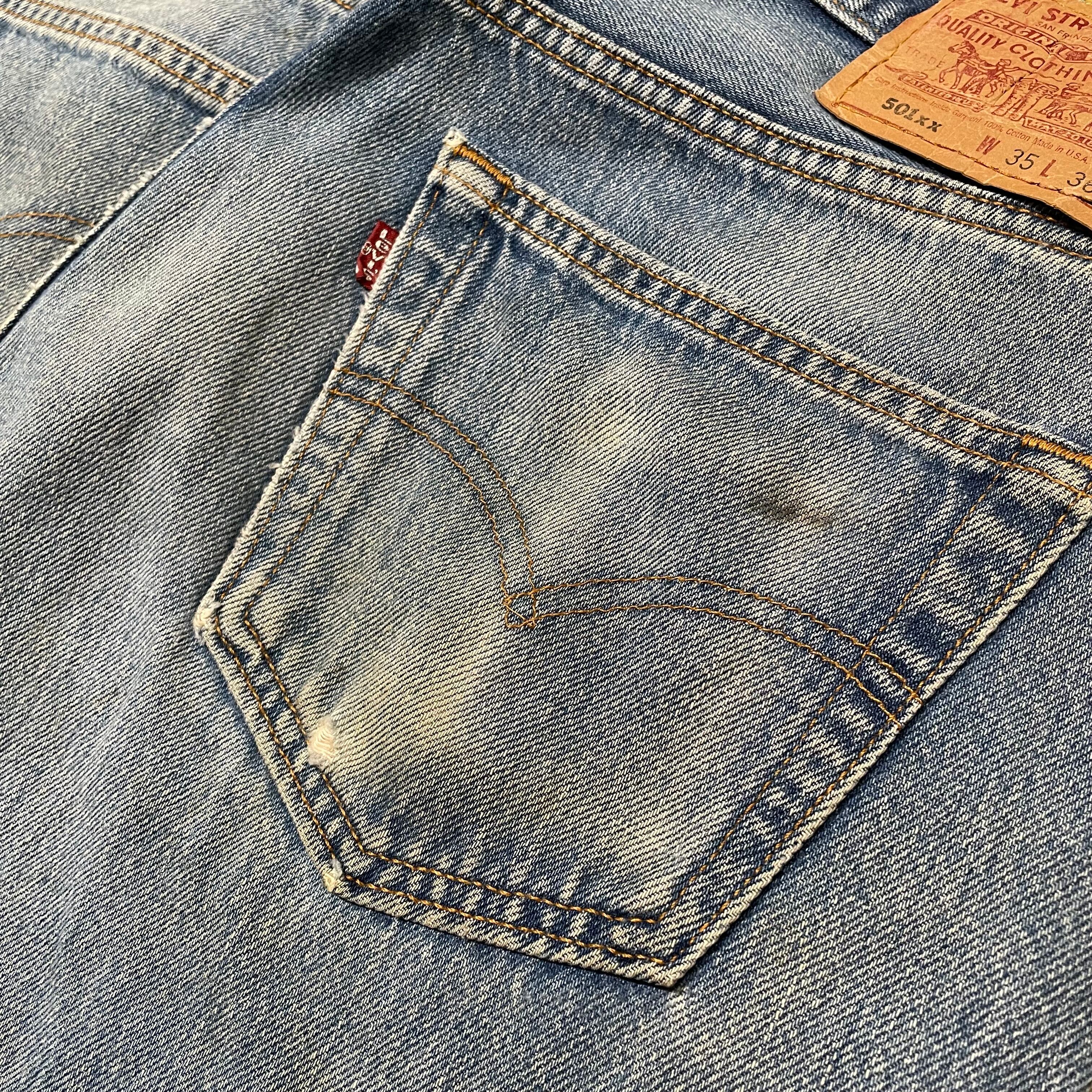 90年代Levis 501xxモデル。良く90年代は色落ちがのっぺりすると言われていますが、モノによってはしっかりとヒゲ、色の濃淡、コントラストしっかり出ています。こちらは日焼け感もよく雰囲気良い1着になってます。レングス表記はL36ですが、裾上げされており、L32(股下83cm)程。ワイド目に履きたい人にはおすすめなアイテムです。年々上がり続けている90s 501をこの機会にぜひ。