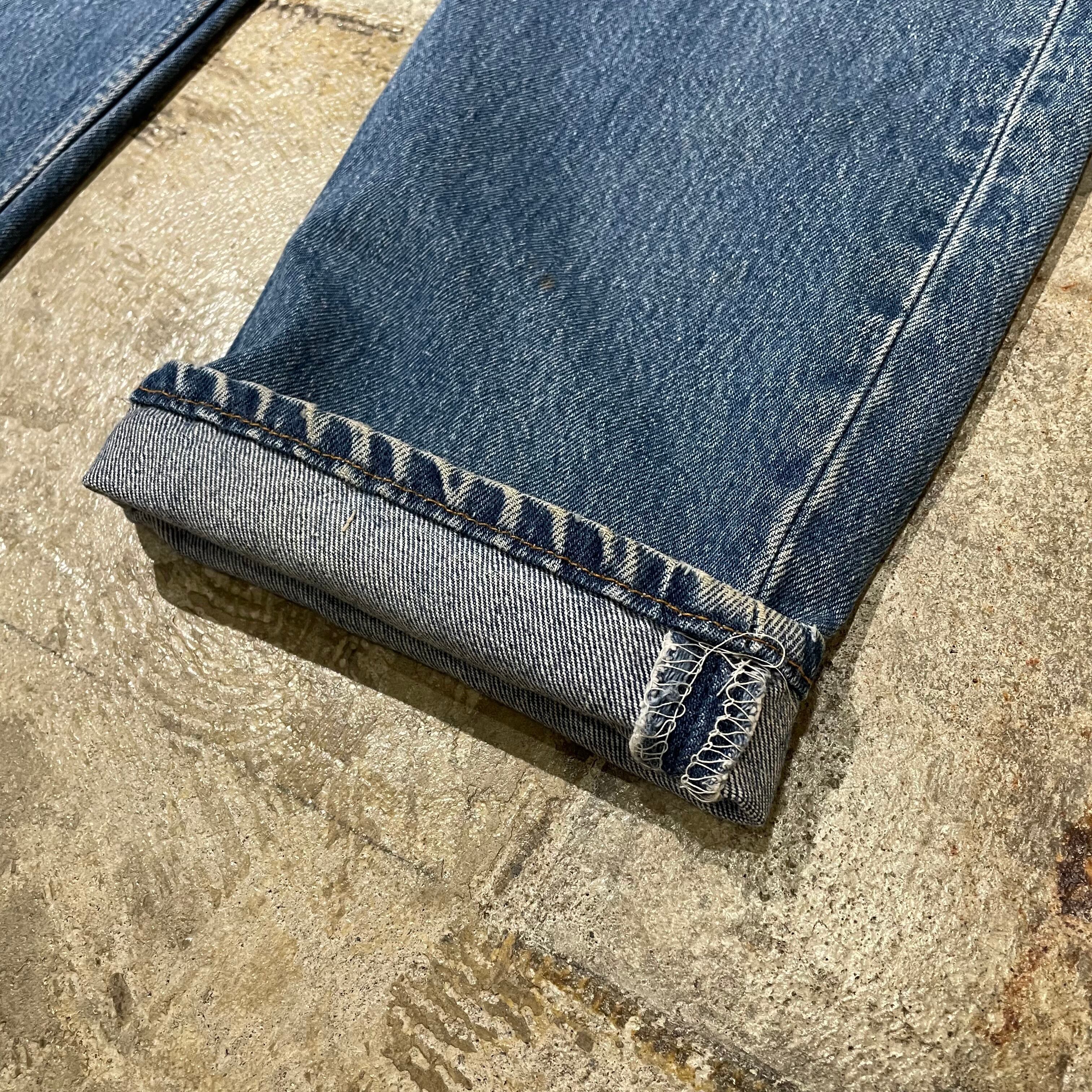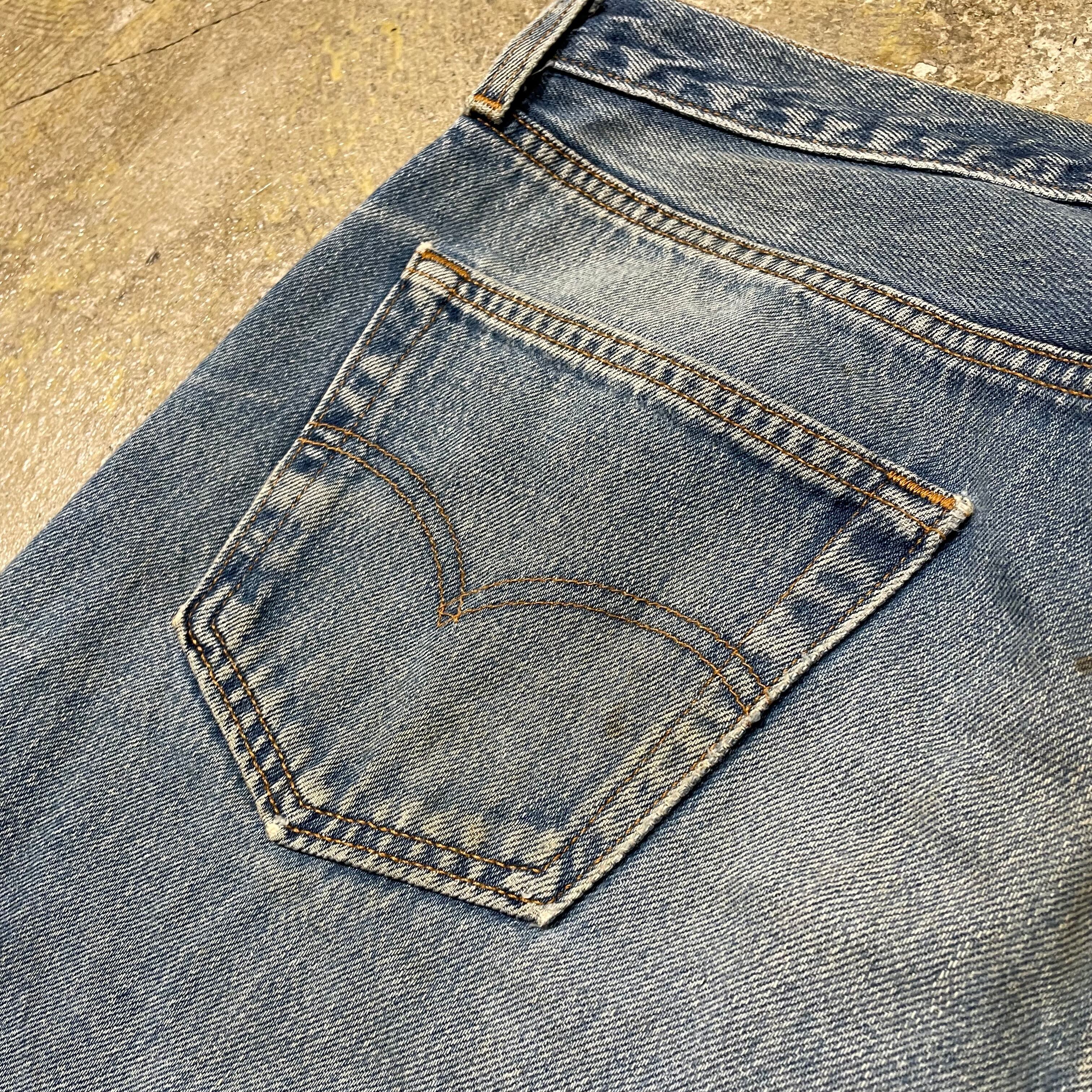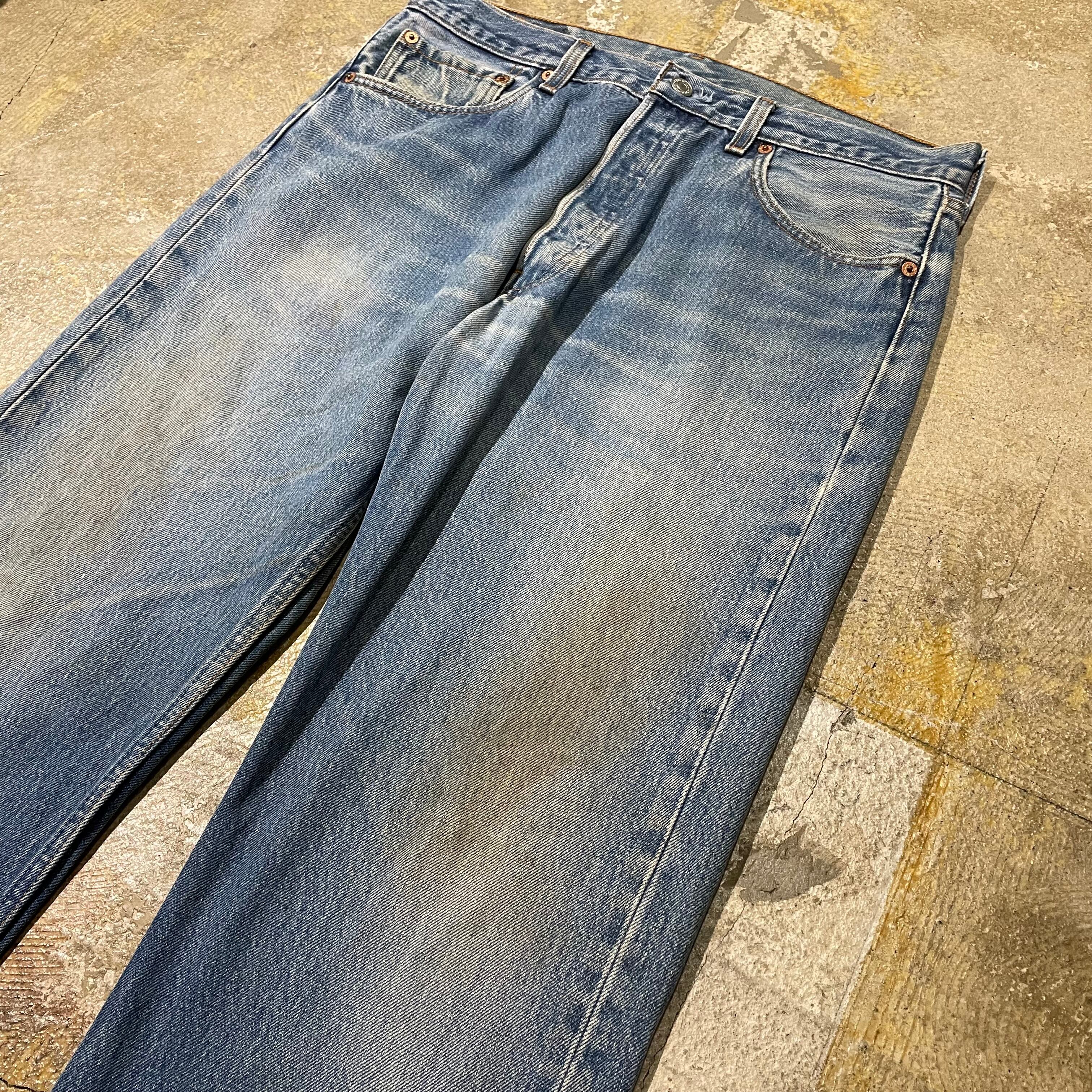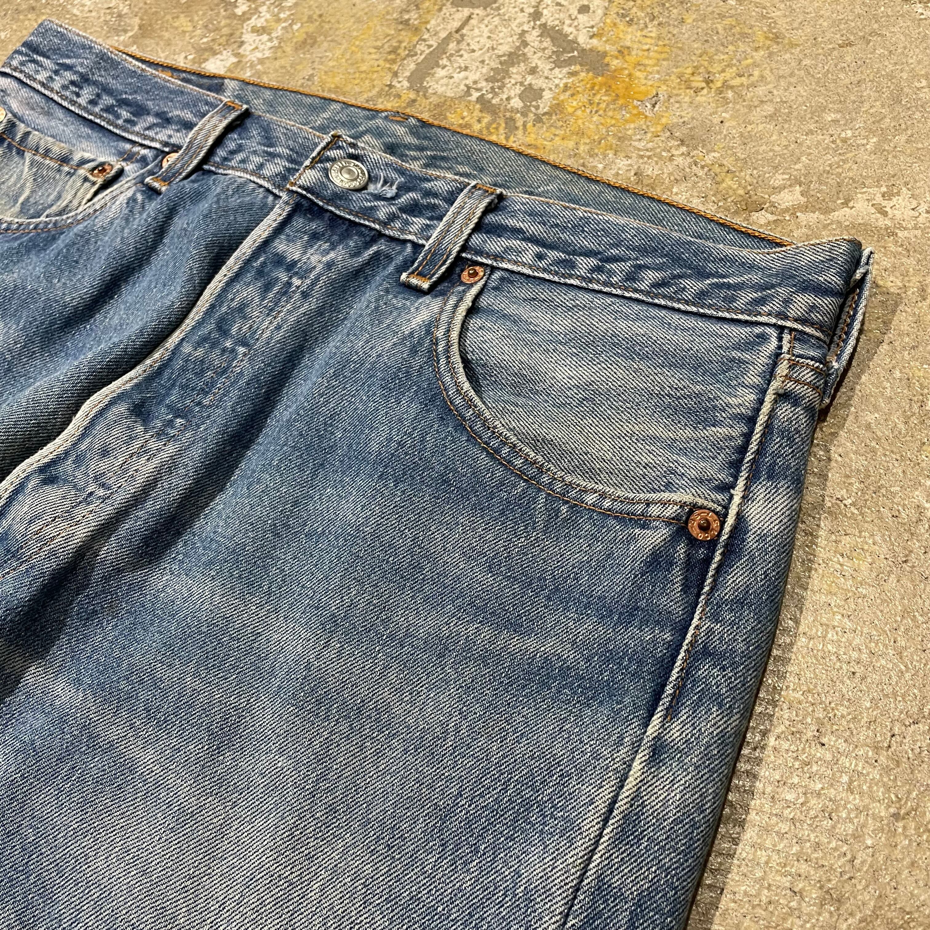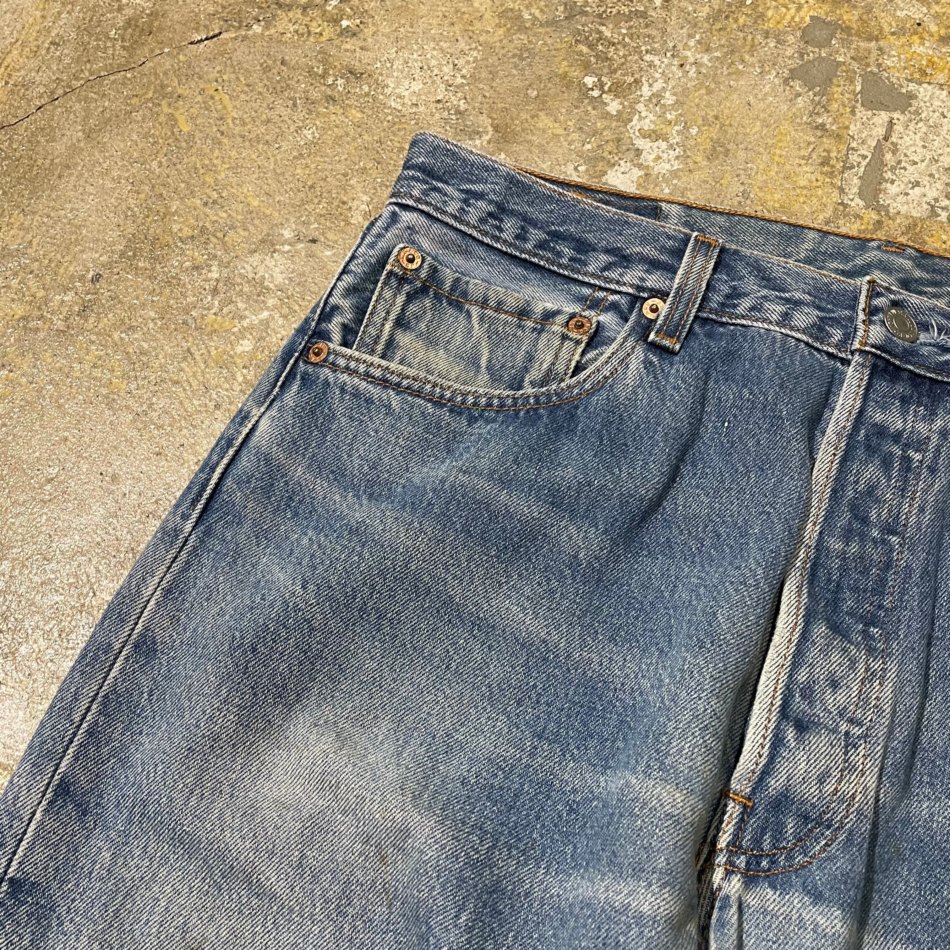 90年代Levis 501xxモデル。良く90年代は色落ちがのっぺりすると言われていますが、モノによってはしっかりとヒゲ、色の濃淡、コントラストしっかり出ています。こちらは日焼け感もよく雰囲気良い1着になってます。レングス表記はL36ですが、裾上げされており、L32(股下83cm)程。ワイド目に履きたい人にはおすすめなアイテムです。年々上がり続けている90s 501をこの機会にぜひ。