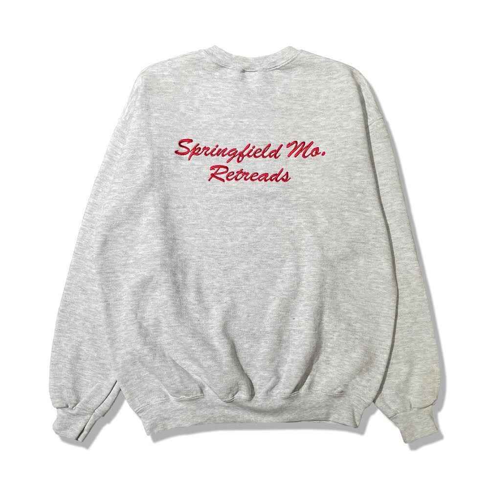 前身には、キャリーという固有名詞であろう文字、後身にはオハイオ州、スプリングフィールドと摩耗したタイヤを交換するという意味の文字が入っている事から、おそらく車の修理屋さん?の作ったであろうスウェットです。古着らしいバックグランドと品のある刺繍が面白いトレーナーをこの機会にぜひ。